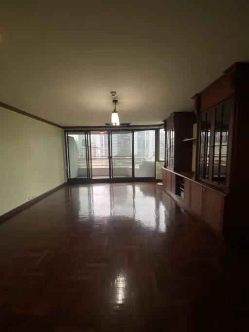 Feel Right at Home on the 7th FloorThis 74 sqm condo has a real solid feel thanks to its polished dark wooden parquet floors, laid out in a classy herringbone pattern—you’ll probably spend most of your time in the living area, which is spacious and bright, opening onto a balcony with enough room for a small seating area.Well-Thought-Out LayoutThere’s a bedroom with built-in mirrored closets that not only save space but help bounce light around, and two bathrooms which is a nice bonus for convenience. The kitchen is compact but efficient, with both upper and lower wooden cabinets, a dark granite countertop, and a two-burner electric stovetop tucked neatly into the space. It’s closed off enough to keep cooking smells contained but still close to the main living area.Details That Make a DifferenceWhite walls and dark wood baseboards create a clean, warm look throughoutLarge windows and floor-to-ceiling sliding doors bring in natural light and offer city viewsThe balcony has modern protective netting and partial privacy screens for comfortBuilt-in cabinetry with glass doors adds practical storage without clutterLocated in Khlong Toei, it’s freehold, resale condition, and sits in a lively part of Bangkok. If you’re looking for a condo with character, natural light, and a usable outdoor space, this one is worth a look.