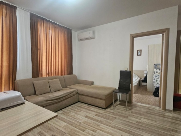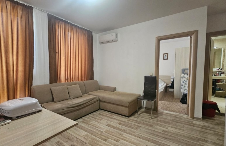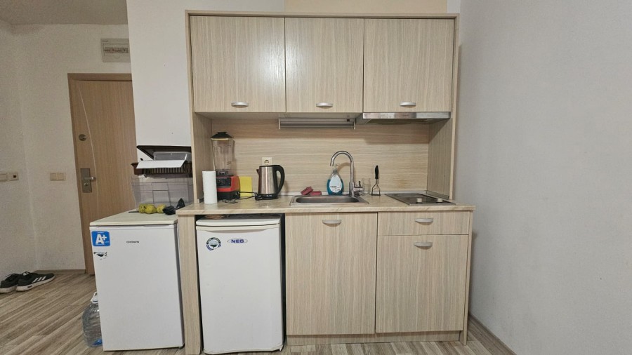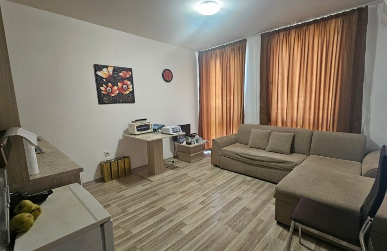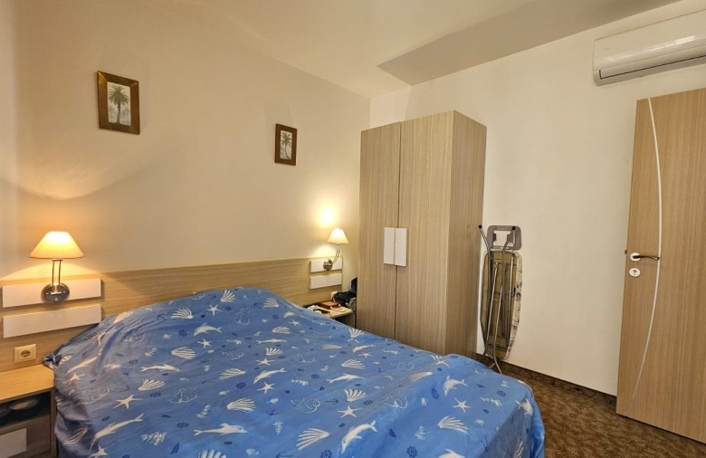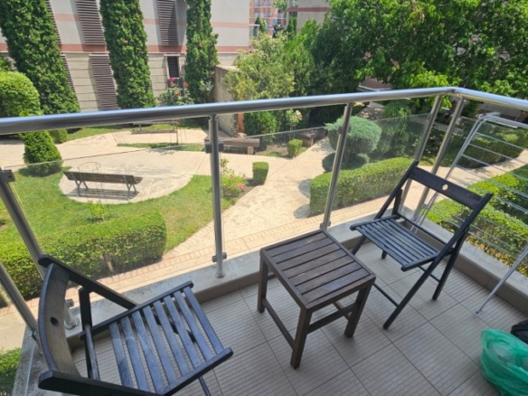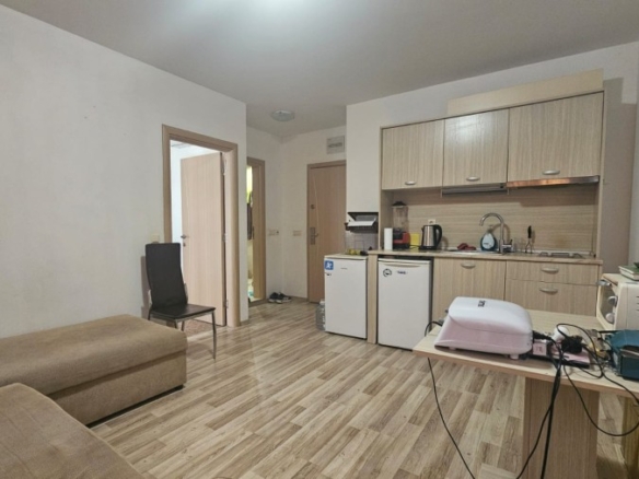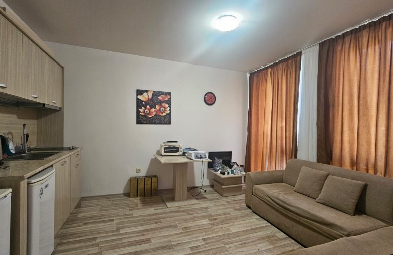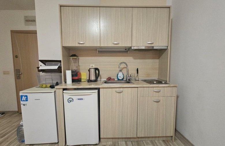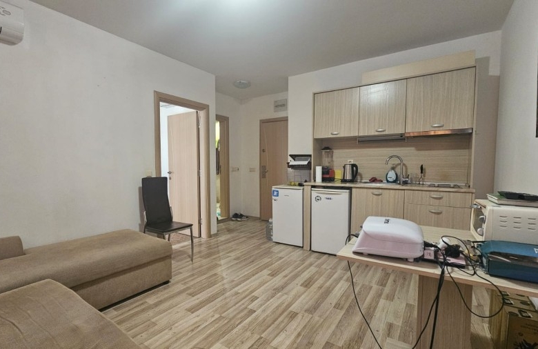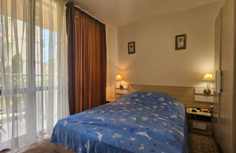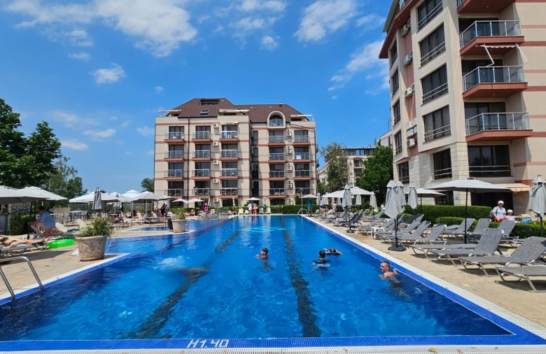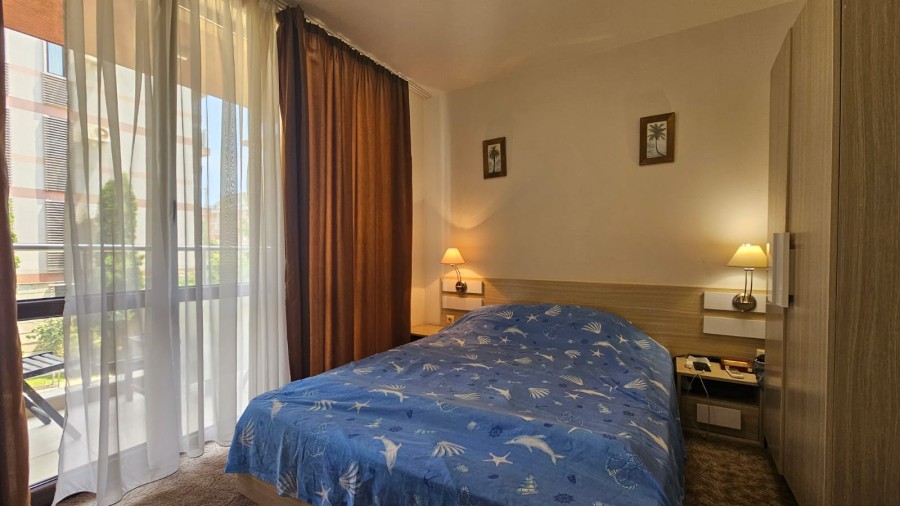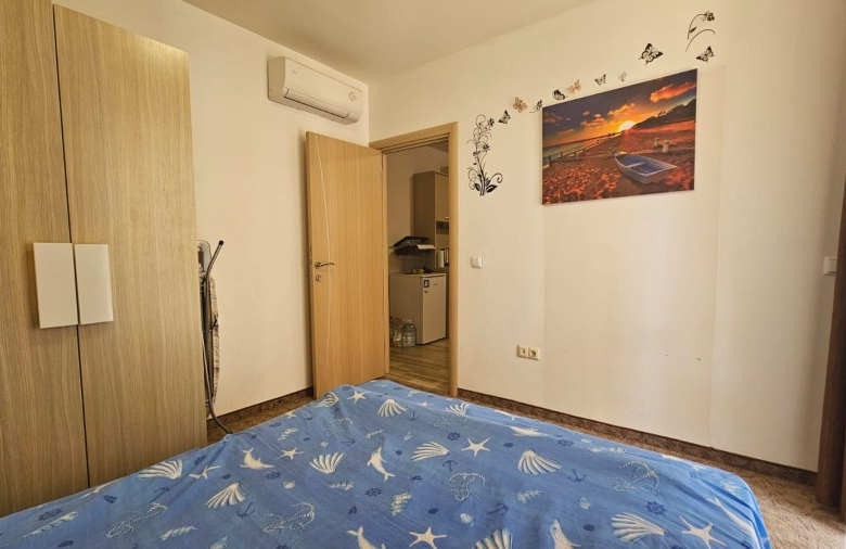 1 BED apartment, 41,8 sq.m. in Tarsis – Club & Spa (Sunny beach) The property is part of recently built apart-complex Tarsis – Club & Spa (2013) in the most green and quiet part of Sunny beach resort. Distance to the beach is less than 10 min walking. The complex has 2 swimming-pools, relaxing zone around the pool, landscaped garden, children’s playground, Spa center, gym, restaurant, pool bar, piano bar, beauty studio. The garden surrounds the whole complex and is a place where you can chill out and have a drink in the hot summer days. The apartment which is offered for sale is situated on the second floor and has views towards the territory of the complex. It is fully furnished and ready to accommodate its new owners. Total area – 41.8 sq.m.The property is nicely furnished, fully equipped, perfect for a holiday home and renting out. The apartment offers: – kitchen with lounge; – 1 bedroom; – Big bathroom/WC; – Terrace with views towards the complex. The apartment is offered fully furnished. It is suitable for permanent living as well as for holiday rentals. The complex is one of the most preferred places for vacation in Sunny beach. Annual maintenance fee – 12.5 EUR/sq.m.