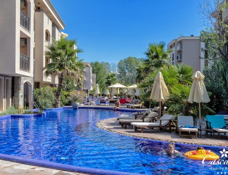 1 BED apartment, 55 m2, in Cascadas Family Resort, Sunny beach Fully furnished 1 BED apartment is offered for sale in the “Cascadas” complex, Sunny Beach “Cascadas” is a unique complex in the developed part of the Sunny Beach resort, located on an area of more than 45,000 sq.m with a rich infrastructure, including: 9 swimming pools with childrens sections, a park, 2 artificial lakes, 4 external Jacuzzis, 2 mini-water parks for children, 3 fitness centers, a volleyball court on the sand, 3 bars, and 3 restaurants, 2 barbecue areas, a beauty salon, a supermarket, bakery, 3 spa centers, playgrounds and a childrens room, underground and surface parking, 24-hour security, Eco Park with a petting zoo, etc. The apartment with a total area of 55 sq.m. is located on the 3rd floor and consists of: an entrance hall, a living room with a kitchen, 1 bedroom, a bathroom with a shower, a terrace overlooking the well-kept green area of the complex. The apartment is fully furnished, equipped with appliances and ready to use. Maintenance fee – 19 euros per sq.m. Distance from the sea – 500 m Area – 55 m2