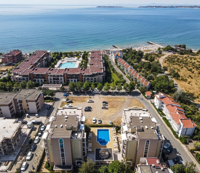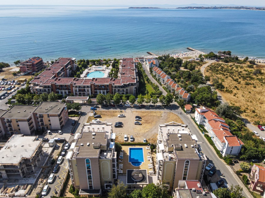 1 BED apartment, 55 sq.m., in Sea Shore, Sveti Vlas, 100 m to the beach We are pleased to offer you this beautifully furnished 1 bedroom apartment in complex Morski Bryag (Sea Shore) in the costal town of Sveti Vlas. Distance to the sea is 100 m. The property is situated on the 2nd floor and has a total living area of 55 sq.m. It is beautifully furnished, in excellent condition. The complex offers a swimming-pool. Excellent for year-round residence and holiday rentals. Annual maintenance fee – 480 EUR. The complex consists of two buildings, each with 7 floors, with a total of 104 apartments – 14 studios, 90 one-bedroom apartments. Each apartment has a balcony overlooking the sea and / or the pool, some overlooking the charming green hills of Stara Planina, on the north side of the complex. Year of Completion: 2015 The apartment complex is suitable for seasonal use, as well as for year-round residence. Saint Vlas is one of the smallest resorts in Bulgaria, located only 6 km from Sunny Beach. It is a picturesque and romantic resort overlooking Nessebar. The beach in Sveti Vlas is south facing and has an international Blue Flag award, which is given for the cleanliness of the beach! The sand is fine, golden. The resort offers a unique combination of fresh mountain, forest and sea air, beautiful nature. Saint Vlas is a favorite place for many Bulgarians and foreigners. Uniquely long, warm and quiet autumn. In recent years, a temperature of 15 degrees in mid-December. In addition, the healing effect on the respiratory tract have natural aerosols formed along the Black Sea coast. Saint Vlas is cozy and picturesque: the beautiful slopes of the Balkan Mountains descend to the sea, the beach consists of many small sheltered coves.