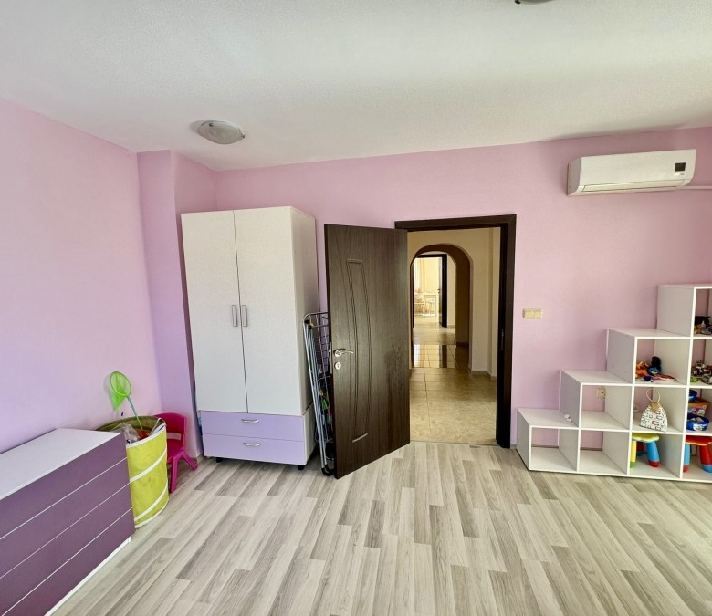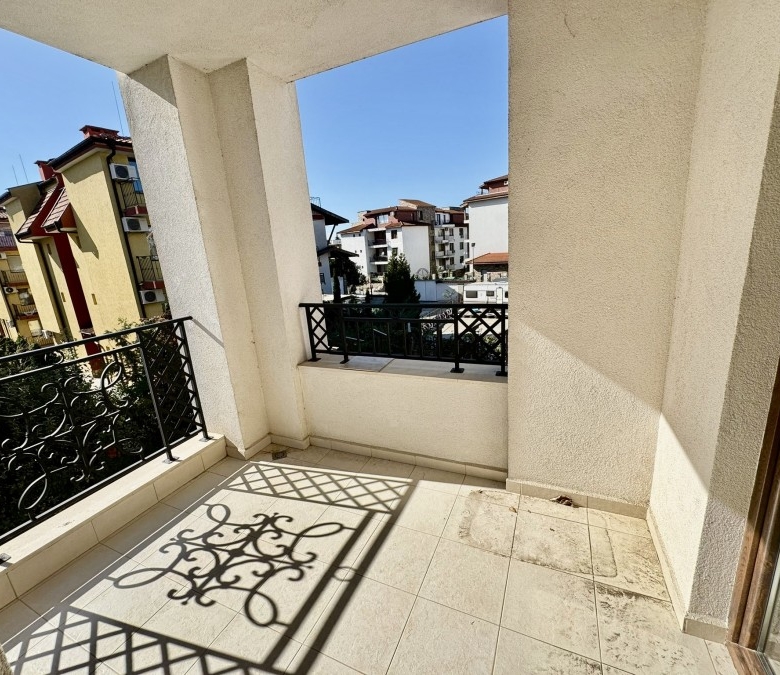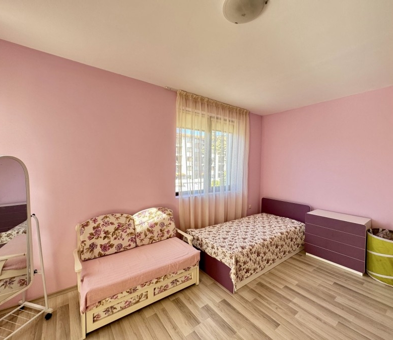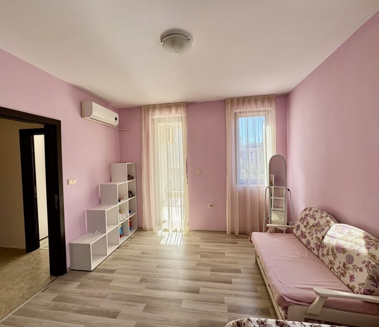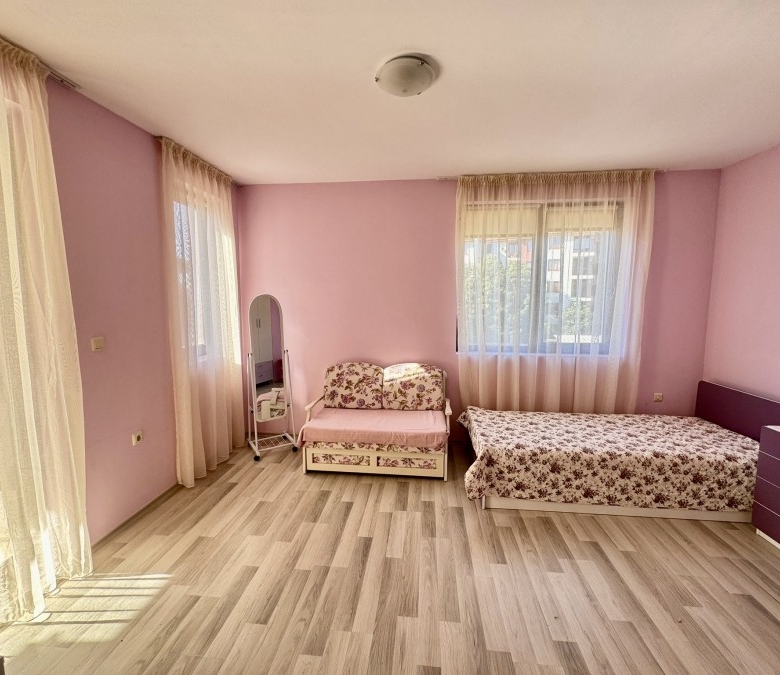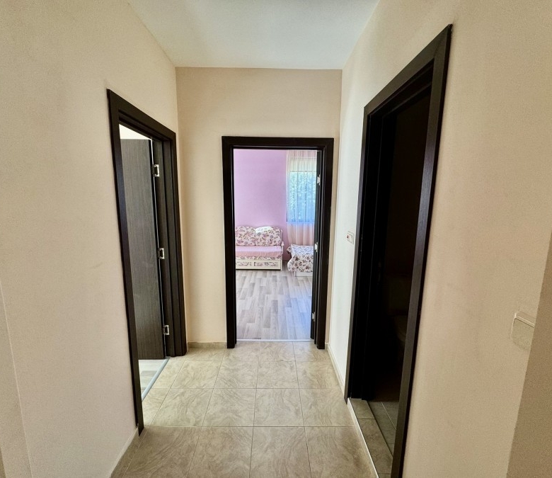 1 BED apartment, 56 sq.m., in Apollon Nessebar, 3 min to the sea Apollon apartments have fantastic location – only 3 min walking distance to the sandy beach (popular Aurelia beach). The complexes are situated between Ravda and Nessebar, within short walking distance to various shops, restaurants and bars, bus stop, etc. attractions and amenities. The Aqua Park is 300 m away. There are 7 swimming-pools on dispose of the owners and their guests, 2 restaurants, SPA area, gym, sauna, security, parking and 3 children’s playgrounds. Annual maintenance fee – 10 EUR/sq.m. The apartment is situated on the second floor and has a total living area of 56 sq.m., comprising of: – entrance hallway; – lounge; – 1 bedroom; – bathroom; – one big terrace with access from both rooms. *The apartment doesn’t have a kitchen. The price includes all furniture as shown on the photos.