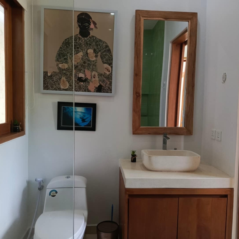Designed in a beachside tropical style, the current layout includes a spacious one-bedroom with two desks, perfect for remote work. The studio window offers lovely ocean views, while the bedroom opens to a lush tropical garden, providing a serene and private escape. The rain shower enhances the spa-like atmosphere, making it an ideal vacation or retreat home.