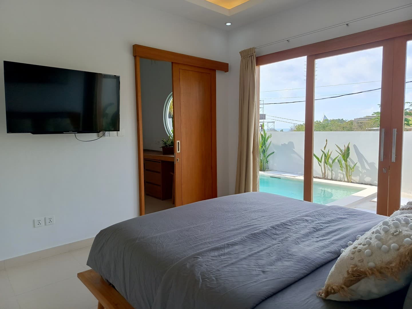 Outside, the villa features a private plunge pool with ocean views and an outdoor bar area, perfect for entertaining or relaxing after a day in the sun. The tropical garden enhances the sense of tranquility, creating a private oasis.
