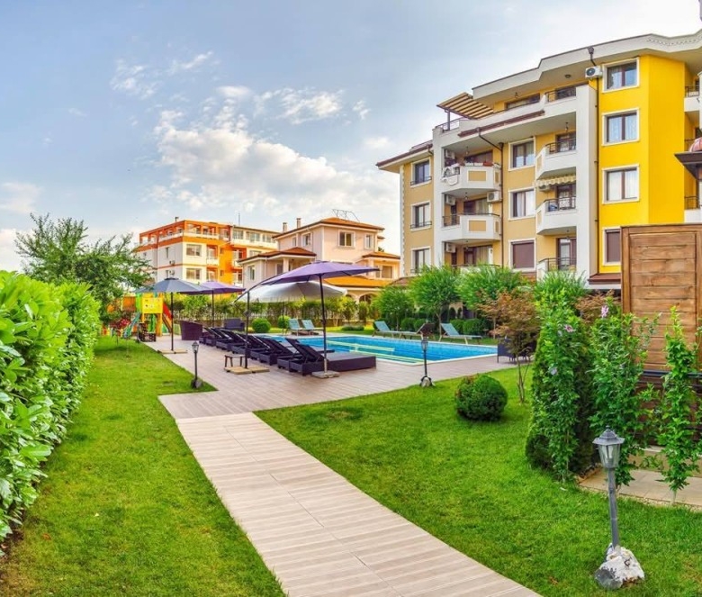 1 BED luxury apartment, 54 sq.m., in Emilia Romana, Ravda, 300 m to the sea KC Properties is pleasedto offer you this excellent apartment in Emilia Romana complex for a wonderful summervacation and year-round living. Good location guarantees convenient transport links. Nearby is the main road Varna-Burgas, 18 km – the international airport in Bourgas. In the settlement, there are regular public transport lines to Nessebar, Sunny Beach, Sveti Vlas, Elenite, Varna, Sofia and Burgas. The apartment is situated on the second floor and has a total area of54.16 sq.m comprising of: * Corridor * kitchen with dining area * bedroom * balcony * bathroom with toilet The apartment is fully furnished and equipped,in excellent livable condition Emilia Romana complex is a 5-storey building with 57apartments, ideal for year-round use. On an area of over 1000 sq.m. is anoutdoor swimming pool, recreation areas, parking spaces. The complex offers a wide range of apartments – from affordable one-bedroom apartments to a panoramic two-bedroom maisonette on the fifth floor. The building has a modern elevator. The complex service (annual fee 6 Euro persq.m.) includes maintenance and cleaning of the common parts, landscaping,maintenance of the elevator, property management. Renovation fund – 2 EUR/sq.m. Ideal for renting out. Top location in Ravda * 150 meters from the main street of the village with shops, cafes and restaurants * 300 meters from the beautiful sandy beach * 500 m to the center of the village, with regular bus line to Bourgas airport, to the sea resort of Nessebar, Sveti Vlas, Sunny Beach, near Varna * 100 m to kindergarten * 18 km to Bourgas Airport * 25 km to the city of Bourgas