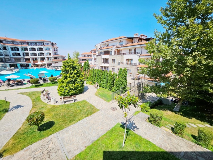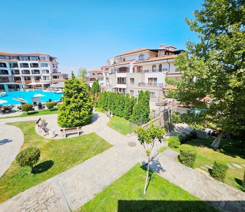 1 BED pool view apartment, 45 sq.m., in Vineyards SPA Resort **** One bedroom apartment for sale in South-eastern Bulgaria nearby the village of Aheloy in short proximity to the most famous Black sea resort Sunny Beach. Vneyards SPA resort is nicely positioned on a hill with a beautiful sea panorama in the town of Kablesхkovo. The Black Sea is 2 km away and the Burgas Airport – 15 km / 15 min drive. The apartment has total living area of 45 sq.m. and it is situated on the second floor. It comprises: living-room with a kitchen area, 1 bedroom, bathroom with a WC and a a terrace overlooking the pool. The property is offered fully furnished and ready to use. Annual maintenance fee – 14 EUR/sq.m. + VAT The property is part of a holiday complex beautifully situated among the rich green pastures with beautiful panoramic views of the sea. All facilities are completed in a unique architectural style of the Bulgarian Revival architecture – red roof tiles, wood paneling, stone cladding. The complex has a good location, away from the noisy urban environment and at the same time just minutes away from the big cities. Closest destinations: Burgas airport – 14 km, Sunny beach resort- 10 km, Nessebar historical town – 10 km, Pomorie town (sea and spa resort)-10km, .Burgas city – 20 km. The nearest beach is just 2 km away. About Vineyards Spa Resort: It is nestled in a quiet, charming place, situated on the rolling hills in the valley of the river Aheloy, with incredible panoramic views of the sea. On its territory are perfectly combined 222 apartments, 34 villas, 4-star hotel with lush greenery. – 2 outdoor swimming-pool; – indoor heated pool; – SPA area; – restaurant; – pool-bar; – food shop; – beauty studio; – parking; – management office; – security