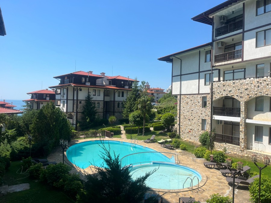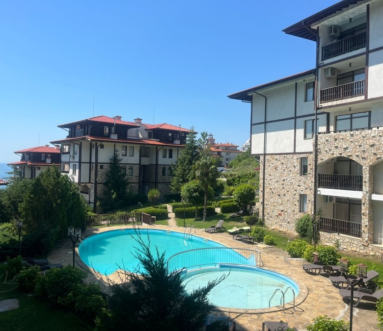 1 BED pool view apartment, 78 sq.m., in Etara 2, Sveti Vlas, 250 m to the sea KC Properties is pleased to offer you this lovely holiday property located on the second floor of Etara 2 complex, some 250 m fromthe sea and 450 m from Marina Dinevi yacht port in Sveti Vlas resort. The apartment has a living size of 78 m2 distributed between a living room with a completely equipped kitchenette, 1 bedroom, a bathroom with WC, and a big covered terrace with views to the pool. The apartment is stylishly furnished and well equipped, with cable TV and Internet. The maintenance fee is 650 Euro per year/ per apartment. The complex has parking lot for 45 cars, which number can be increased if necessary with the located in proximity public parking lot for 36 cars. The whole complex is surrounded by natural greenery planted with some exotic tree species, with attractive rockeries, combined with colorful compositions. The water areas create cozy and unique atmosphere. Here you will find a comfortable restaurant for 60 people, of which half are indoor and an outdoor swimming pool for your relaxing holidays. The combination of sea and mountain climate, the lack of industrial enterprises, the proximity to the beautiful town of Nessebar, the availability of convenient communications and nice conditions for rural, hunting, fishing, wine, forest and eco tourism, turn this property into a very attractive investment.