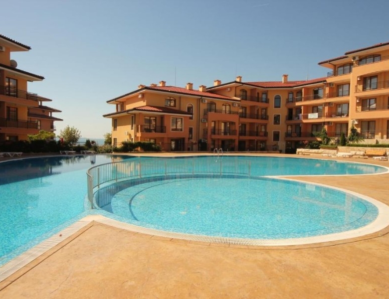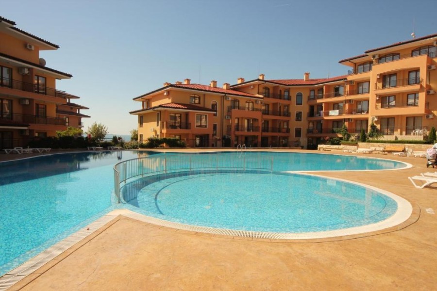 1 BED spacious apartment, 69 sq.m. in Sky Dreams, Sveti Vlas, 150 m to the sea We offer for sale an excellent 1 BED apartment with sea view and a swimming pool in a large complex on the second line from the sea – “Sky Dreams” in the town of Sveti Vlas. The complex is located in the southern part of the resort next to a beautiful sandy beach. The complex has two swimming pools with childrens areas, a playground, a restaurant, a reception, parking in front of the complex and year-round security. The apartment is located on the 2nd floor of the building. The total area of the apartment is 69 sq.m. The apartment consists of: an entrance hall, spacious living room with a kitchen and dining areas, a bedroom, a balcony overlooking the sea and surroundings, a bathroom with a shower. The apartment is sold with furniture and household appliances. Ready for year-round living and relaxation. Sky Dreams (2009) is a modern gated complex, which has an excellent location in a quiet part of St. Vlas, 150 meters from the sandy beaches and the sea. Around the complex there are elite complexes and infrastructure facilities that will complement your vacation by the sea: cafes, supermarkets, shops and more. The complex consists of four separate buildings (195 apartments of different layouts), has a landscaped green area with swimming pools, a restaurant, a pool bar, a cafe. Reception. Lobby bar. Parking. The complex operates all year round. Permanent residence is possible. Sky Dreams complex was built and put into operation in 2009. There is Act 16. The maintenance fee is 12 euros per sq.m per year.