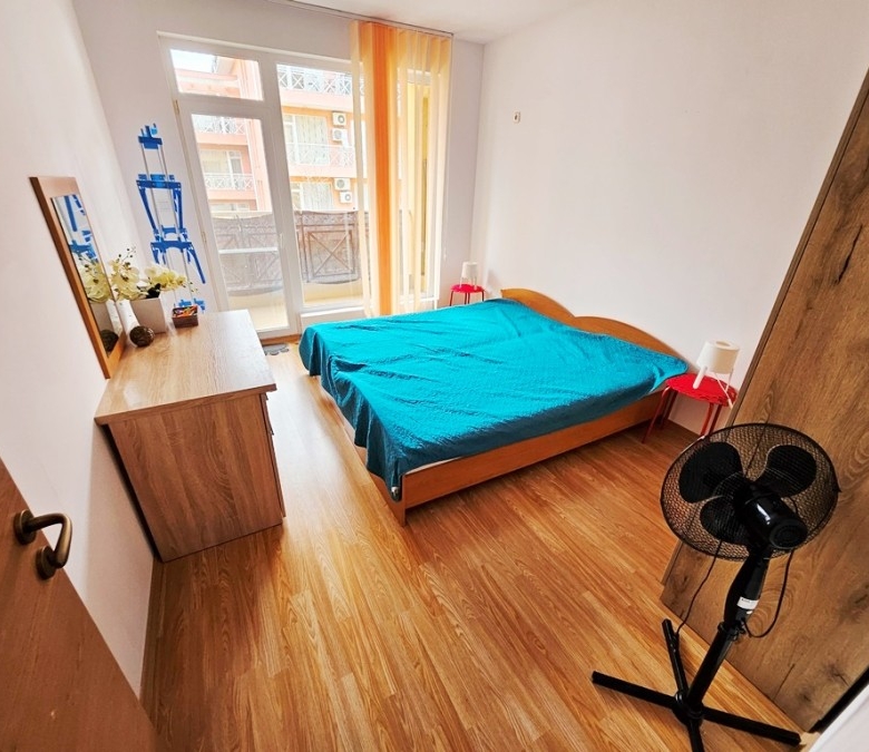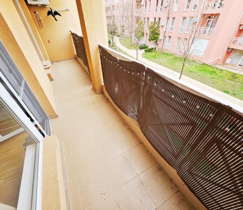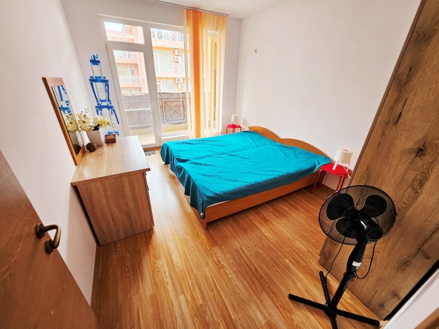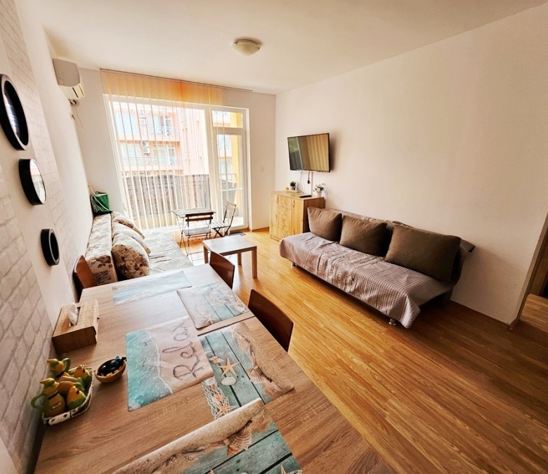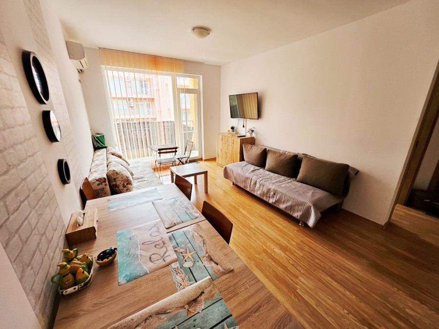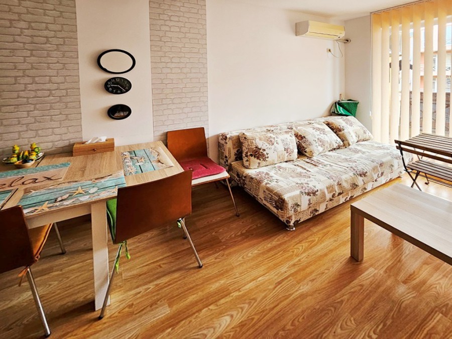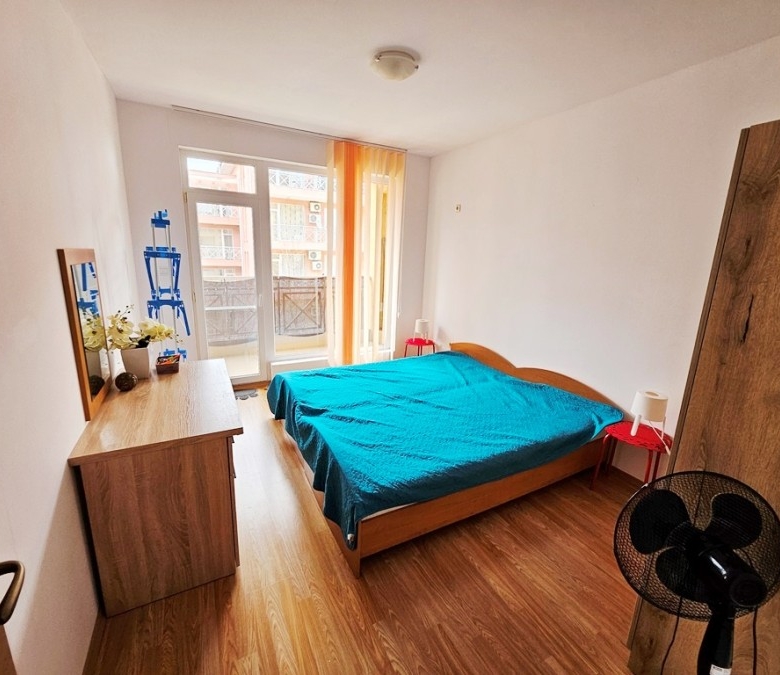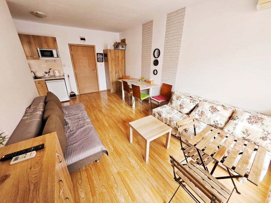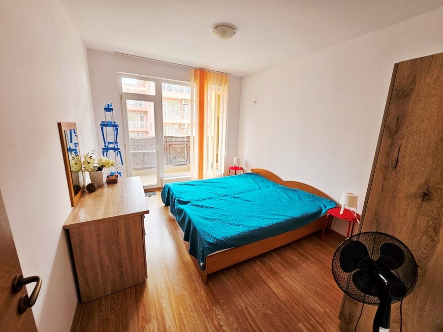 1 BED spacious apartment with garden views, 57 sq.m., in Sunny Day 6, Sunny beach KC Properties is pleased to offer you this spacious and nicely furnished 1 BED apartment with aview to the gardens of the complex. The property is situated in Sunny Day 6 – a residential complex situated in the outskirts of Sunny beach resort, within 3 km to the sea coast. Nessebar town is 7 km away and Bourgas airport – 35 km away. On site facilities include: 5 outdoor pools, tennis-courts, mini-golf fields, outdoor sport facilities, restaurant, supermarket, free parking area, security, reception, regular shuttle service in the summer season. The apartment is situated on the 2nd floor and has a total area of 57 sq.m. It comprises of: – Open-plan kitchen with lounge area; – one bedroom; – Shower-room/toilet; – Big Terrace with garden views. The apartment is offered fully furnished and is in excellent condition. It is perfect vacation home, ideal for families with children and people who would like to enjoy peacefulness. Pet friendly area. Annual maintenance fee -580 EUR/year.