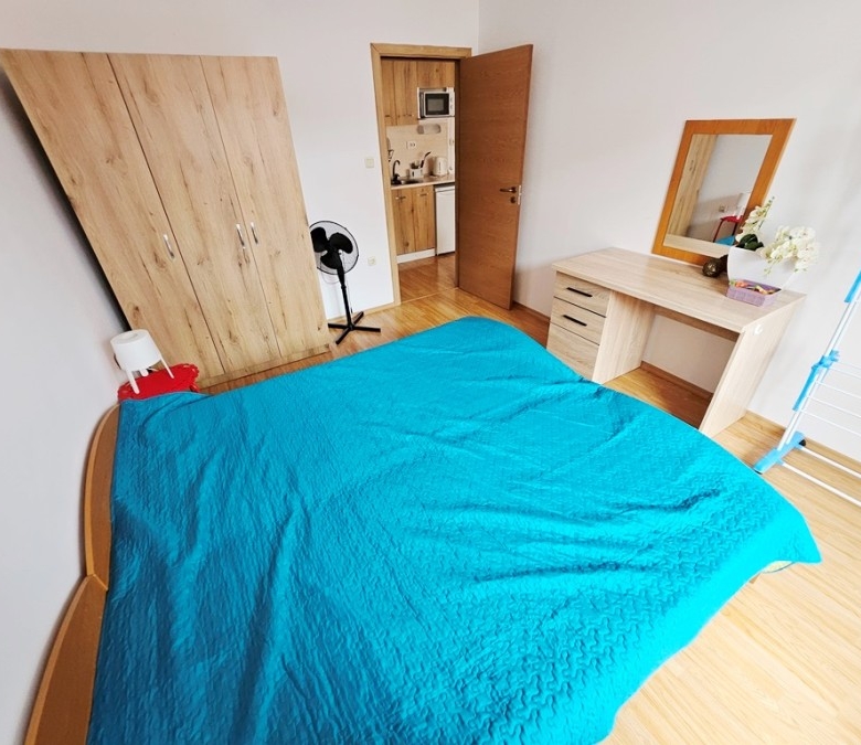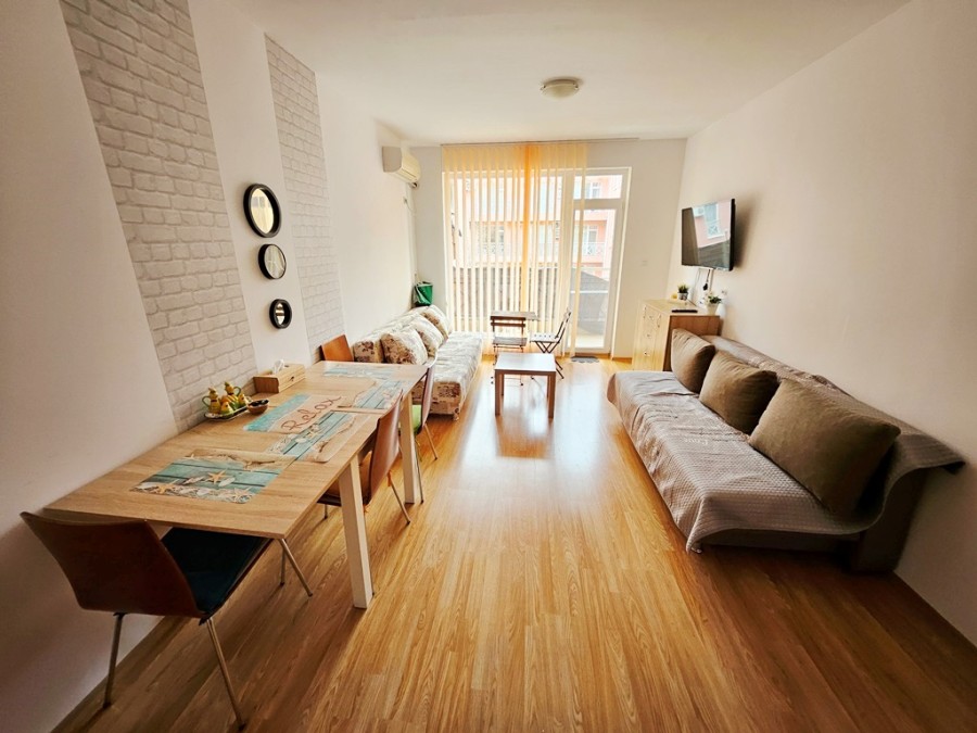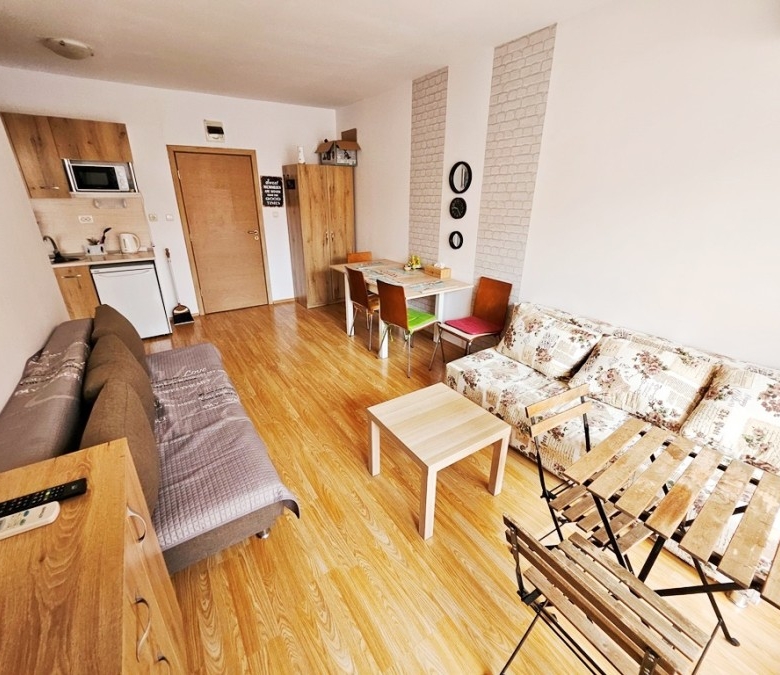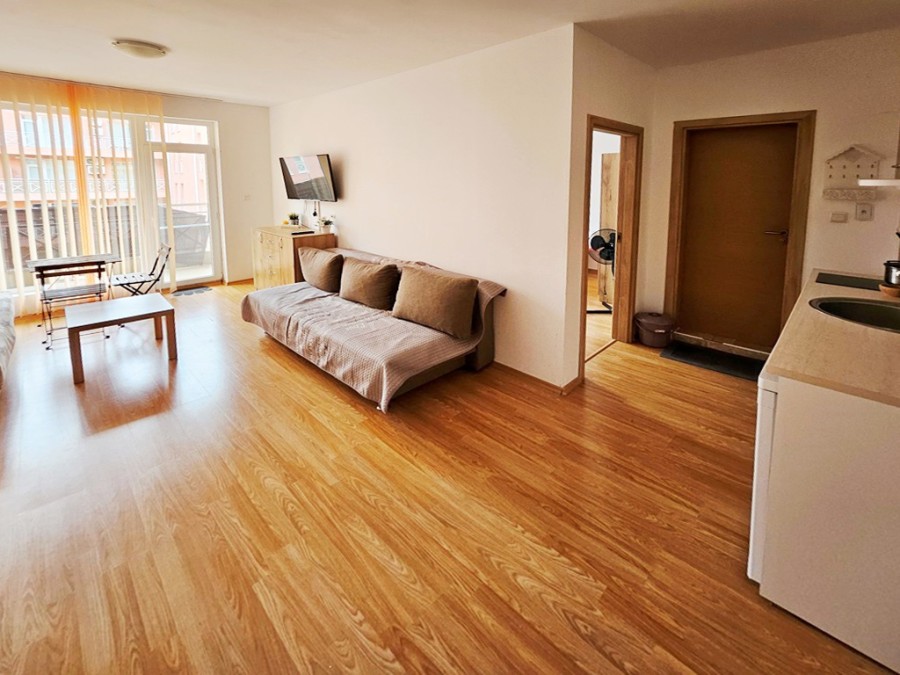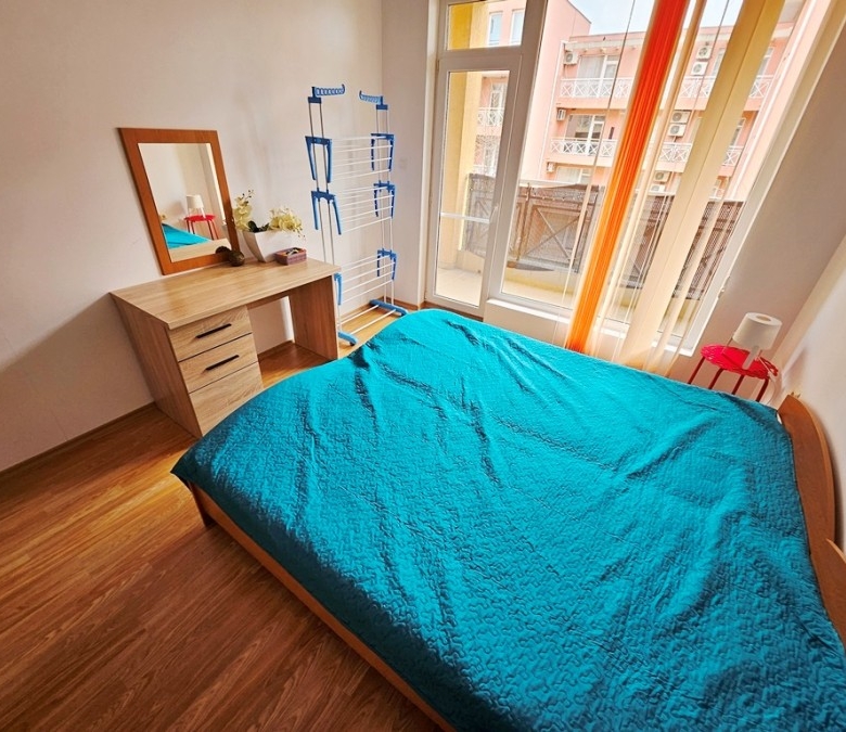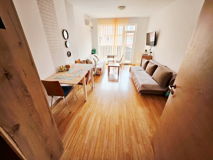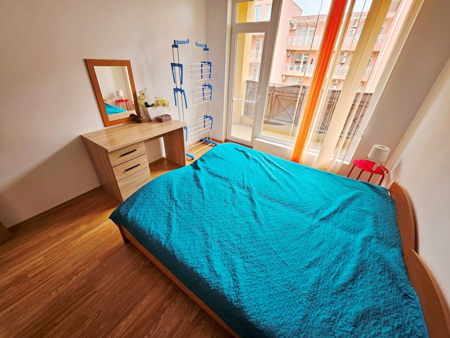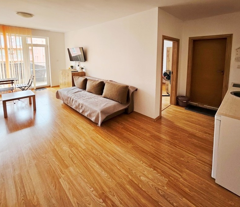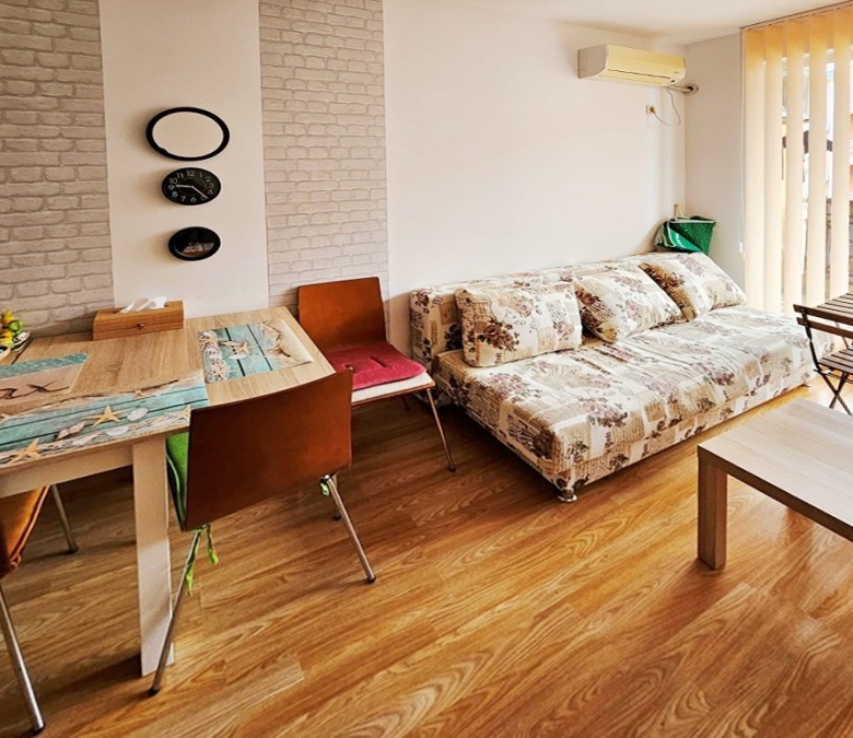 1 BED spacious apartment with garden views, 57 sq.m., in Sunny Day 6, Sunny beach KC Properties is pleased to offer you this spacious and nicely furnished 1 BED apartment with aview to the gardens of the complex. The property is situated in Sunny Day 6 – a residential complex situated in the outskirts of Sunny beach resort, within 3 km to the sea coast. Nessebar town is 7 km away and Bourgas airport – 35 km away. On site facilities include: 5 outdoor pools, tennis-courts, mini-golf fields, outdoor sport facilities, restaurant, supermarket, free parking area, security, reception, regular shuttle service in the summer season. The apartment is situated on the 2nd floor and has a total area of 57 sq.m. It comprises of: – Open-plan kitchen with lounge area; – one bedroom; – Shower-room/toilet; – Big Terrace with garden views. The apartment is offered fully furnished and is in excellent condition. It is perfect vacation home, ideal for families with children and people who would like to enjoy peacefulness. Pet friendly area. Annual maintenance fee -580 EUR/year.