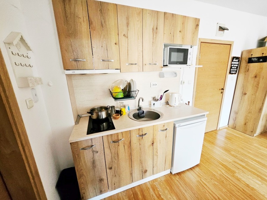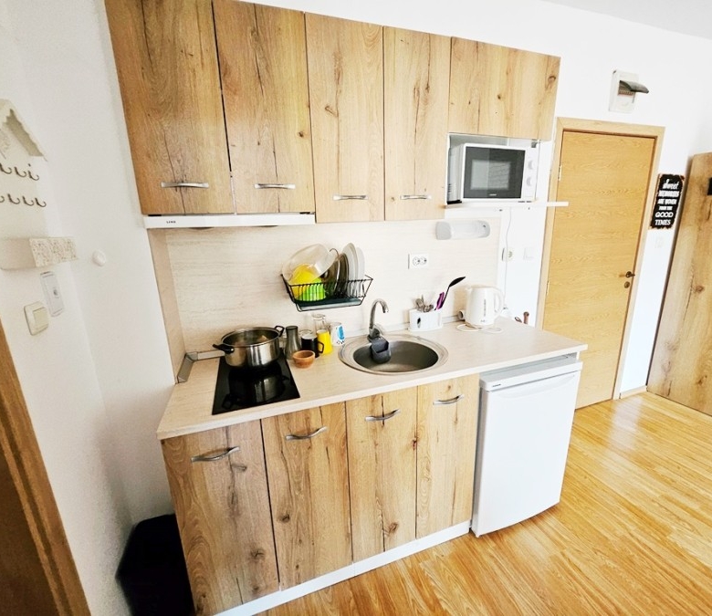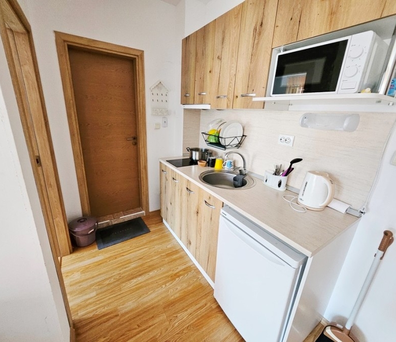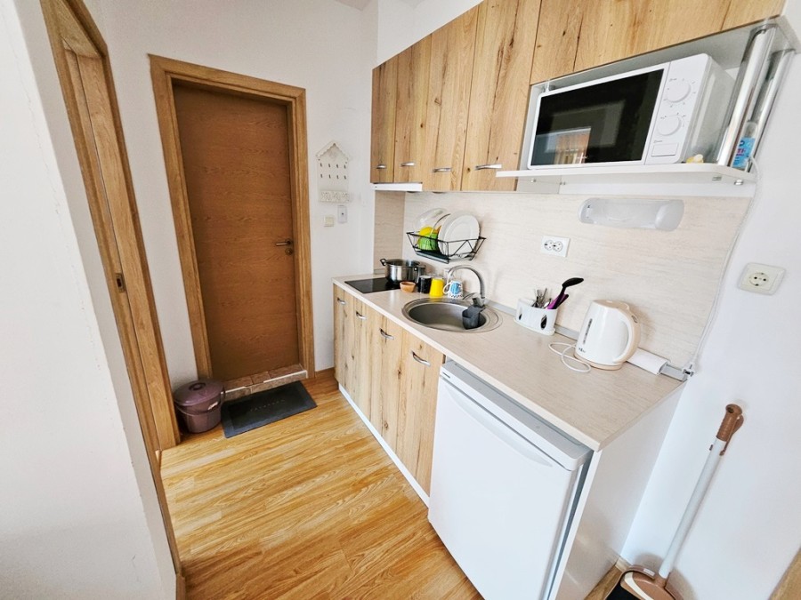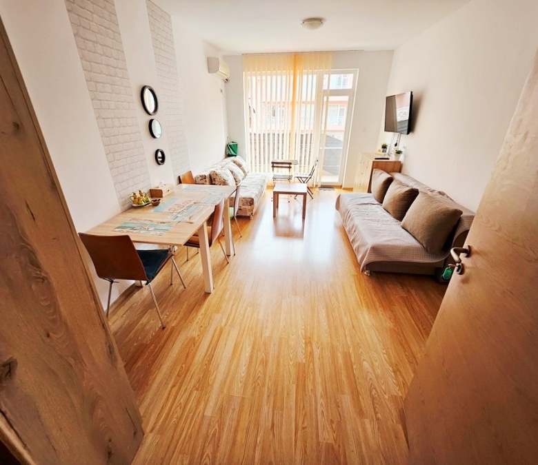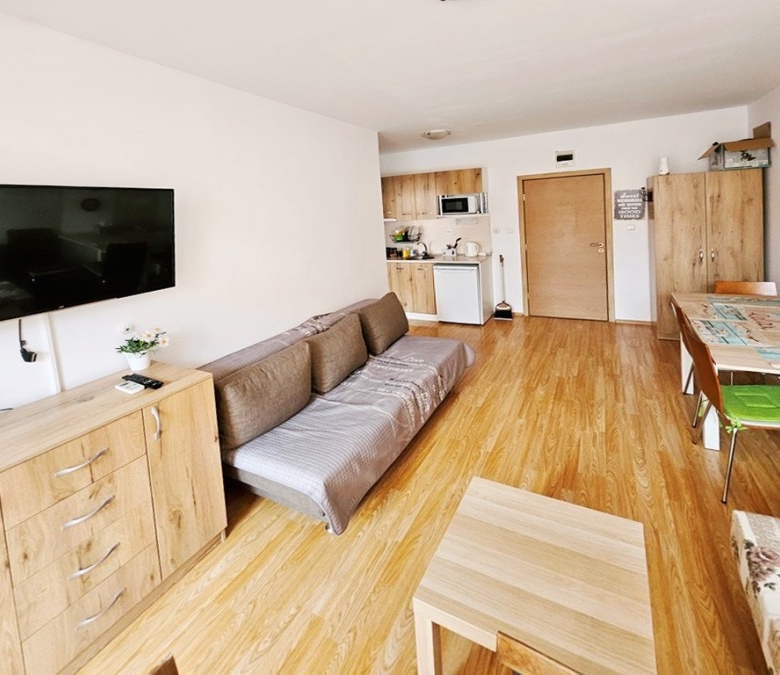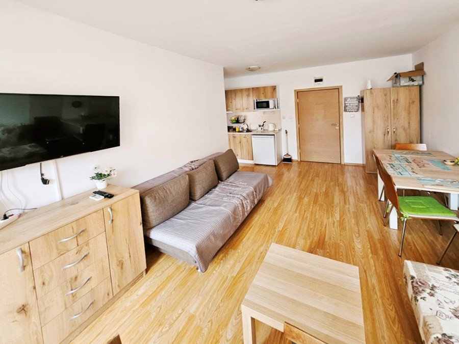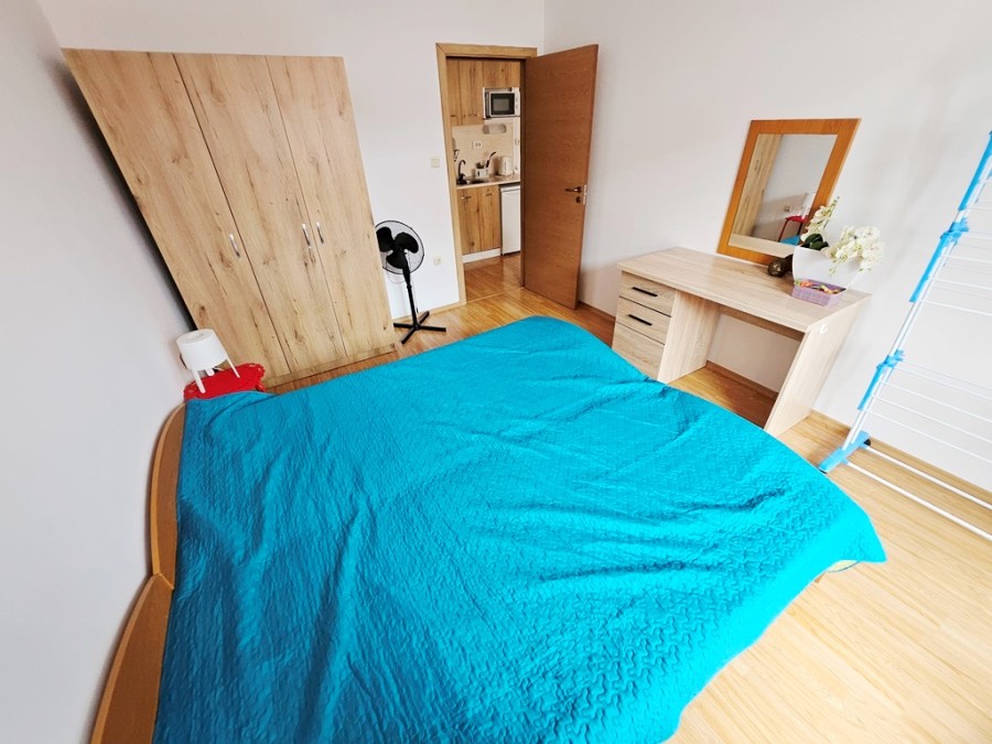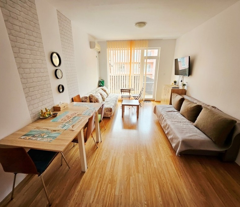 1 BED spacious apartment with garden views, 57 sq.m., in Sunny Day 6, Sunny beach KC Properties is pleased to offer you this spacious and nicely furnished 1 BED apartment with aview to the gardens of the complex. The property is situated in Sunny Day 6 – a residential complex situated in the outskirts of Sunny beach resort, within 3 km to the sea coast. Nessebar town is 7 km away and Bourgas airport – 35 km away. On site facilities include: 5 outdoor pools, tennis-courts, mini-golf fields, outdoor sport facilities, restaurant, supermarket, free parking area, security, reception, regular shuttle service in the summer season. The apartment is situated on the 2nd floor and has a total area of 57 sq.m. It comprises of: – Open-plan kitchen with lounge area; – one bedroom; – Shower-room/toilet; – Big Terrace with garden views. The apartment is offered fully furnished and is in excellent condition. It is perfect vacation home, ideal for families with children and people who would like to enjoy peacefulness. Pet friendly area. Annual maintenance fee -580 EUR/year.