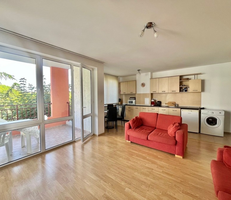 1 BED spacious apartment with sea views, 86 sq.m., first line, in Riviera Fort, Ravda We are pleased to offer you this apartment with exclusive location – on the first sea line in the coastal village of Ravda. Nessebar town is just 2 km away, while Sunny beach resort is at a distance of 5 km. The area of the property is 86 sq.m. and is situated on the 3rd floor and has the following layout: entrance hall, living room, one bedroom, bathroom with toilet and a balcony with sea views. The property is offered for sale furnished and equipped, ready to move in. The complex offers: * swimming pool * childrens swimming pool * childrens playgrounds * restaurant * bar * massages * a tennis court * soccer field * guarded parking Riviera Fort is suitable for living and for summer holidays by the sea or to rent it out. Annual maintenance fee: 14.5 EUR/ sq.m.