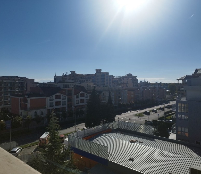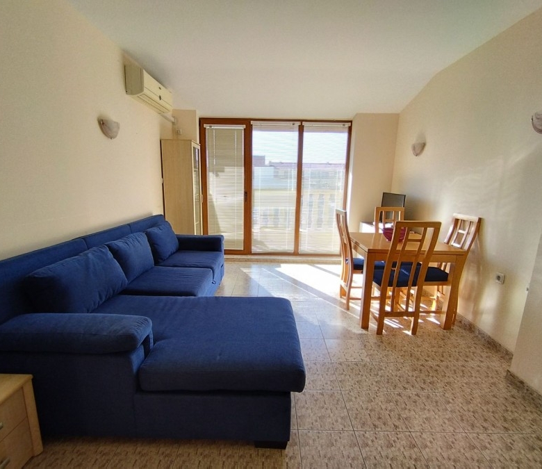 1 BED top floor apartment with a big terrace , 61 sq.m., in Royal Dreams, near the beach KC Properties would like to offer you this fully furnished 1 bedroom apartment which is ready to welcome its new owners. The property is situated in the southern part of Sunny beach, very close to Nessebar town. Near-by there are plenty of shops, bars and restaurants, hospital, bus stop. Distance to the sea coast is 300 m away. The location of the property makes it ideal for renting out in the summer season and for using it as a holiday home. The studio is situated on the 6th – top floor (there is a lift) and has a total area of 61 sq.m. It is completely furnished, in excellent conditions and consists of: – entrance hallway; – Kitchen and dining area; – Bedroom; – Bathroom and toilet; – Large balcony. Furniture includes equipped kitchen with washing machine, oven and cooker, fridge, dining table with chairs, 2 single beds, sofa-bed, wardrobe, air-condition. The bathroom is finished with shower cabin. Complex „Royal Dreams” is located in an ideal place between the popular resort Sunny beach and the historical town of Nessebar. It is situated only 300 m away from the beach. There are a lot of shops, restaurants and cafes nearby. The maintenance fee of the complex is 9 euro/sq. m. The complex offers its guests and owners: * swimming pool * Childrens play ground * fitness room * a restaurant * summer bar * shop * hour security. Good rental potential