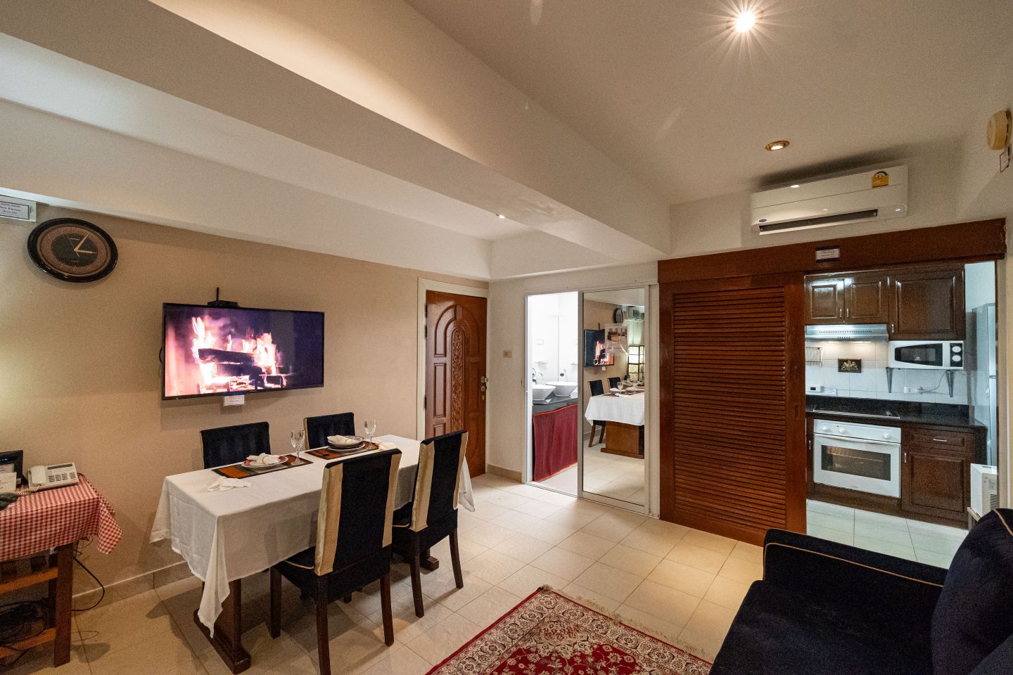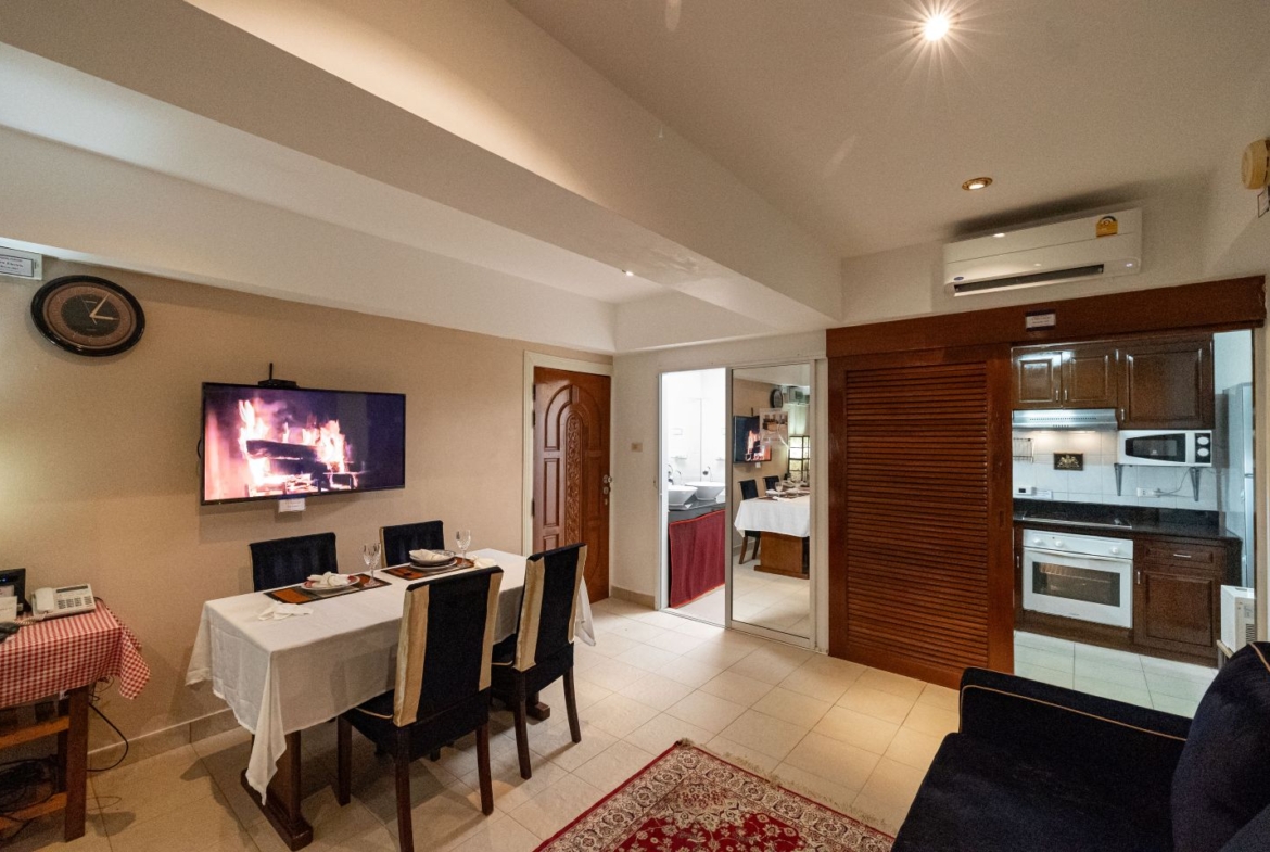 This 1-bedroom, 2-bathroom unit is located in the Center Condotel building in South Pattaya. The layout includes a spacious living area that can comfortably accommodate overnight guests with a sofa bed setup.