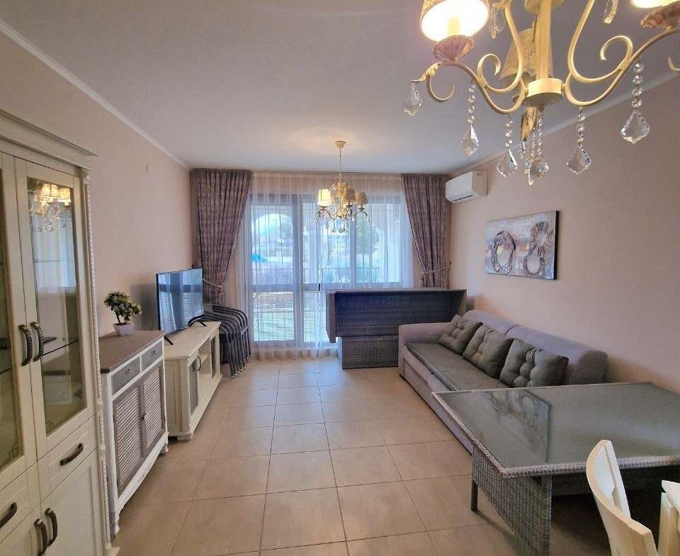 The apartment with a total area of 62.05 m² is located on the ground floor. It consists of a hallway, a living room with a kitchen area, a bathroom, and a large terrace. The apartment is furnished with high-quality furniture and all necessary appliances. It offers a view of the complex’s grounds.