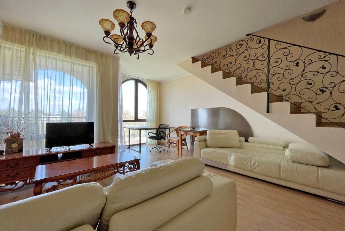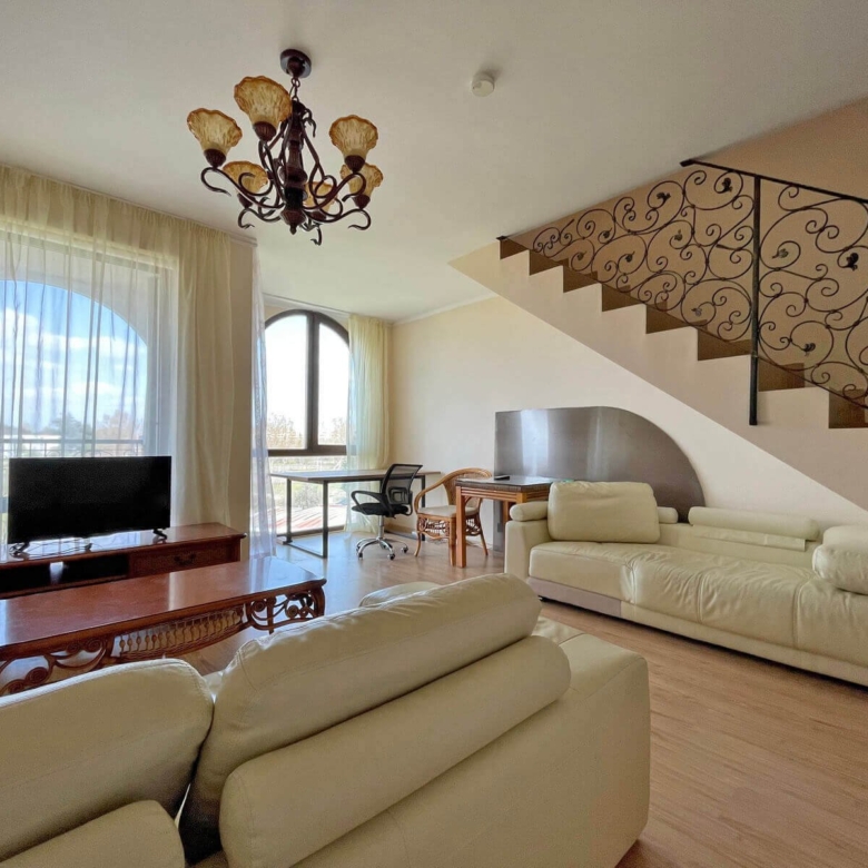 The two-story apartment in “Chateau Del Marina” is located in an exclusive and quiet area of Nessebar, one of the most popular holiday destinations on the Bulgarian Black Sea coast. This modern and spacious apartment offers comfortable living space across two floors, ideal for families or couples seeking both tranquility and access to the recreational opportunities of the area.
