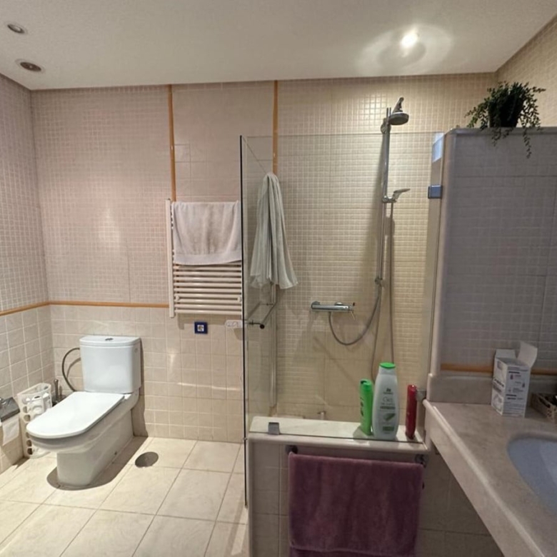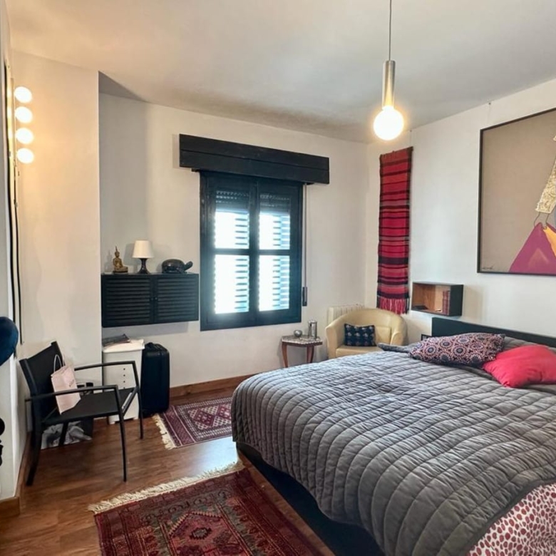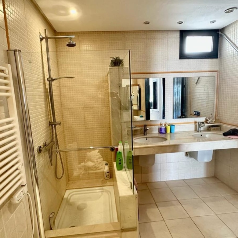 This penthouse features air conditioning, ensuring a comfortable living environment throughout the year. The fully fitted kitchen is perfect for those who love to cook, and the marble floors add a touch of elegance to the space.