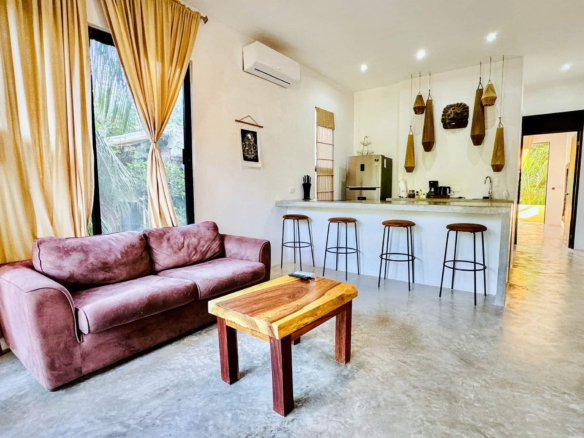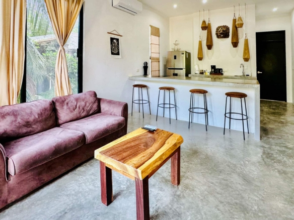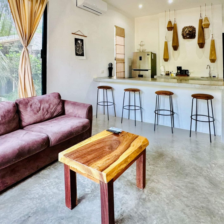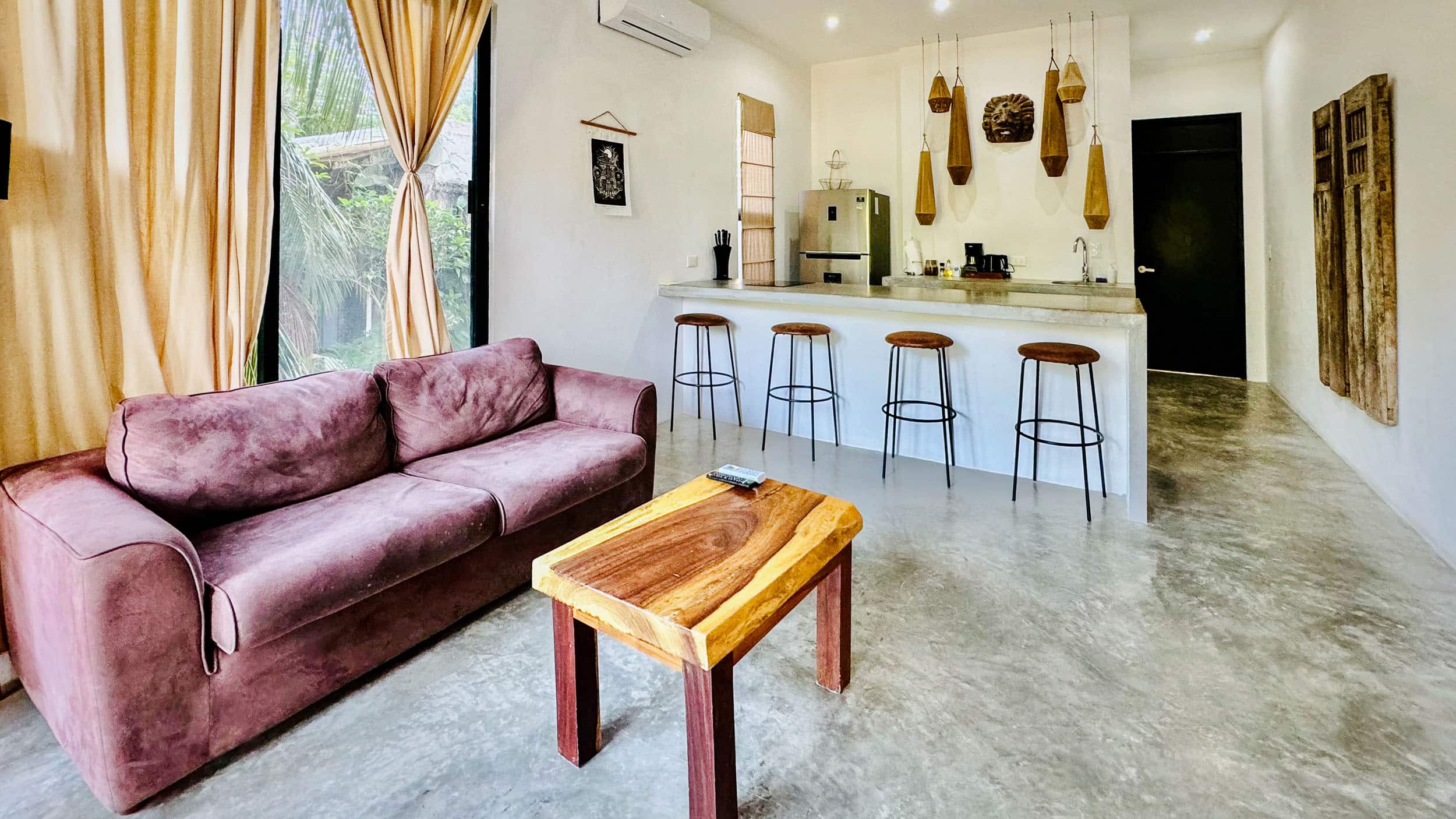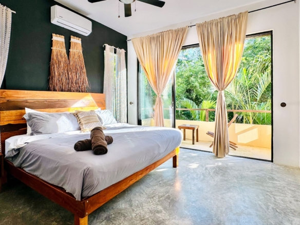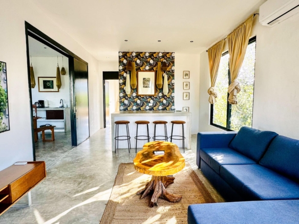 Each suite includes custom wood finishes, abundant natural light, and private terraces overlooking tropical landscaping. All units come furnished with linens and feature fully equipped kitchens, making the property suitable for short-term vacation rentals or long-term leases.