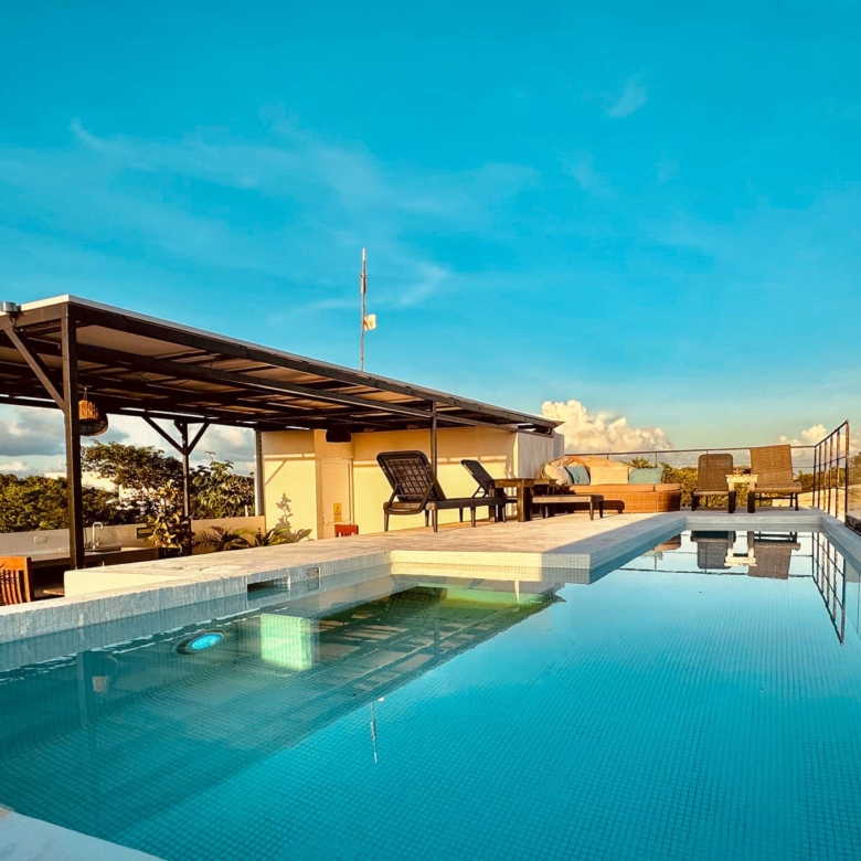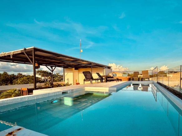 The rooftop area offers a communal space with an infinity-edge pool, open-air lounge, Jacuzzi, and sun loungers, providing an attractive amenity for residents and guests. Landscaped gardens add to the property’s relaxed atmosphere. Additional features include a reception area, on-site laundry facilities, and solar panels for improved energy efficiency and cost savings.