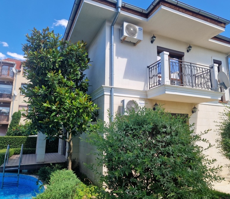 2 BED 2 BATH house, 116 sq.m., with a fire-place in Ravda, 700 m to the sea We are pleased to offer you a fully furnished 2 storey house, which is part of a small complex in Ravda seaside village. Distance to the beach – appr. 700 m. The house is two-storey and has a total area: 116 sq m. It comprises of: – 1st floor: spacious living room with fireplace, fully equipped kitchen, storage, bathroom and terrace with direct access to the pool; – 2nd floor: two bright bedrooms, bathroom and three terraces. – The house is offered fully furnished and ready to use as shown on the photos. Act 16. Fireplace and air-conditions. Outdoor pool right next to your terrace Maintenance fee: 1000 EUR per year if you use the pool; 500 EUR if you don’t use the pool. Ravda is a summer seaside resort, famous in the past for its numerous childrens, school and student holiday camps. There are regular bus lines to Burgas (30 min), Sunny Beach (20 min) and Nessebar (10 min). Today the resort has hotels, private accommodation, restaurants and discos. Village population is about 3000 people.