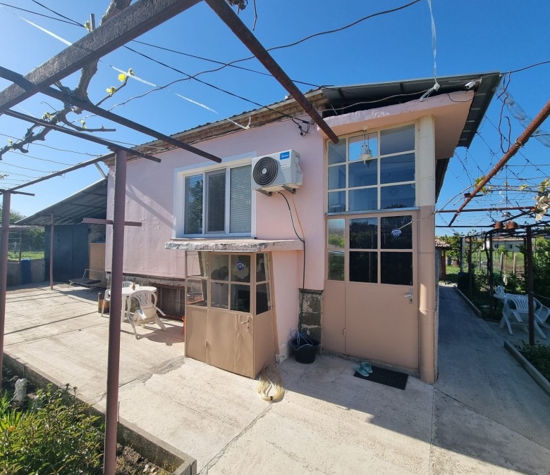 2 BED house, 89 sq.m., ready to live in, in Vinarsko village, 25 km from Burgas A one-story, residential house with a basement is for sale in Vinarsko village, Burgas region, Bulgaria. A village located 25 km from Burgas, sea beaches and the international airport. The Burgas – Sofia expressway is 1 km away. All the streets of the village are asphalted. A small river flows along the village, there are two mineral springs, a pond. A peaceful and ecologically clean place. There is street sanctification. In the village there are 2 shops, a cafe, a health center, a church, a library, a post office, a kindergarten, playgrounds, a school, a dairy farm, public transport. The house is located on a plot of 820 sq.m. The total area of the house is 72 square meters, plus 17 square meters – basement. It consists of: a hall with a summer mini-kitchen, an entrance hall, a large living room with a kitchenette and a dining room, two bedrooms and a bathroom with a shower. 2 rooms in the basement. House equipped with furniture, appliances and ready for living. Local heating with a water jacket and the possibility of installing the boiler in the basement are installed throughout the house. Also there are conditioners and furnace heating. The house has central water supply, electricity, sewage. On the plot there are outbuildings, a bathroom, a garage, a workshop under a large shed, parking, a large greenhouse and a private well. The plot is improved, well-groomed, an irrigation system is installed, there are many decorative and fruit-bearing trees and shrubs, as well as many other fruit plantations.