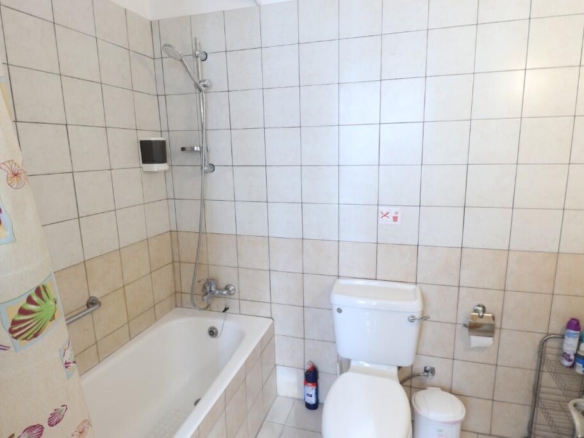 * The Tranquil Rear Garden: An Outdoor Extension of the Home: The rear garden, measuring (5.62m) x (3.60m)…(18.1ft) x (11.3ft), is a south-facing haven that basks in the Cypriot sunshine throughout the day. Its secluded and private ambiance makes it an ideal retreat. The crazy paving style patio offers a charming space for outdoor dining or lounging, while the adjacent decking area provides a further dimension for relaxation. The modern pre-painted aluminum fencing ensures both privacy and low maintenance. A ceramic tiled shower and a side gate provide direct access to the rarely used communal pool, offering a refreshing escape during the warmer months. The inclusion of an outdoor electrical socket and a garden tap adds to the practicality of this delightful outdoor space.