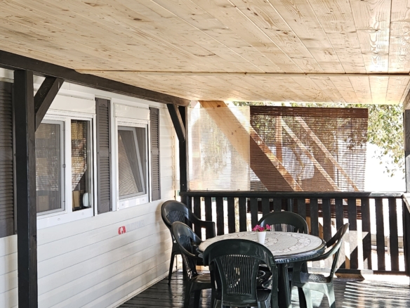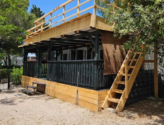 The appeal of this property extends far beyond its interior. The mobile home is complemented by a generously sized 28-square-meter terrace, which acts as a natural extension of the living space. This is an ideal spot for al fresco dining, morning coffee, or simply relaxing while soaking in the surroundings. What sets this property apart, however, is the additional rooftop terrace, a prime location for enjoying the Mediterranean sun and spectacular views.