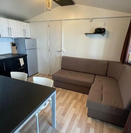 The mobile home itself is a testament to modern design and comfort, spanning a total of 40 square meters. The layout is thoughtfully arranged to maximize space and functionality, comprising three main rooms. The living area is an open-plan space that seamlessly combines a comfortable lounge with a fully equipped kitchenette, creating a social hub for family and guests. This central area is bright and airy, thanks to its direct connection to the expansive outdoor terrace.