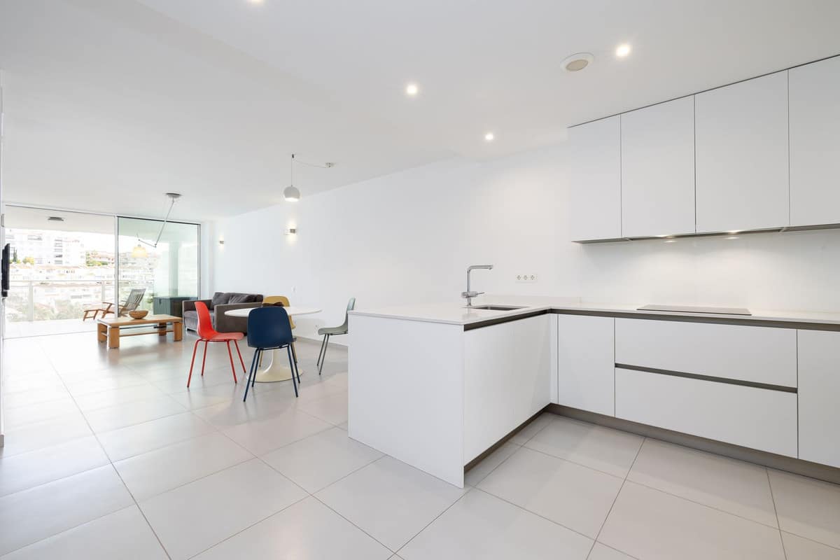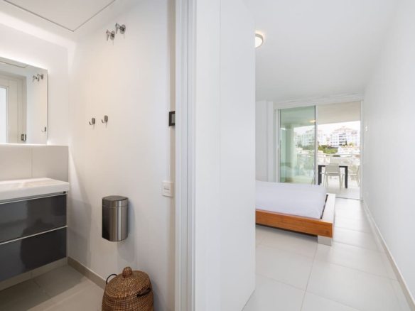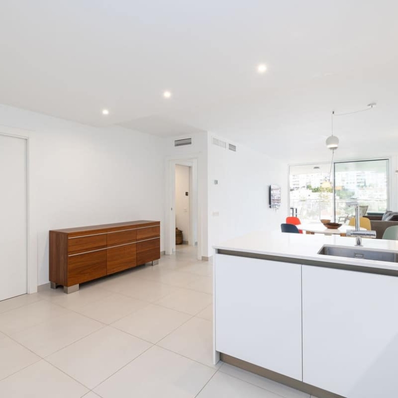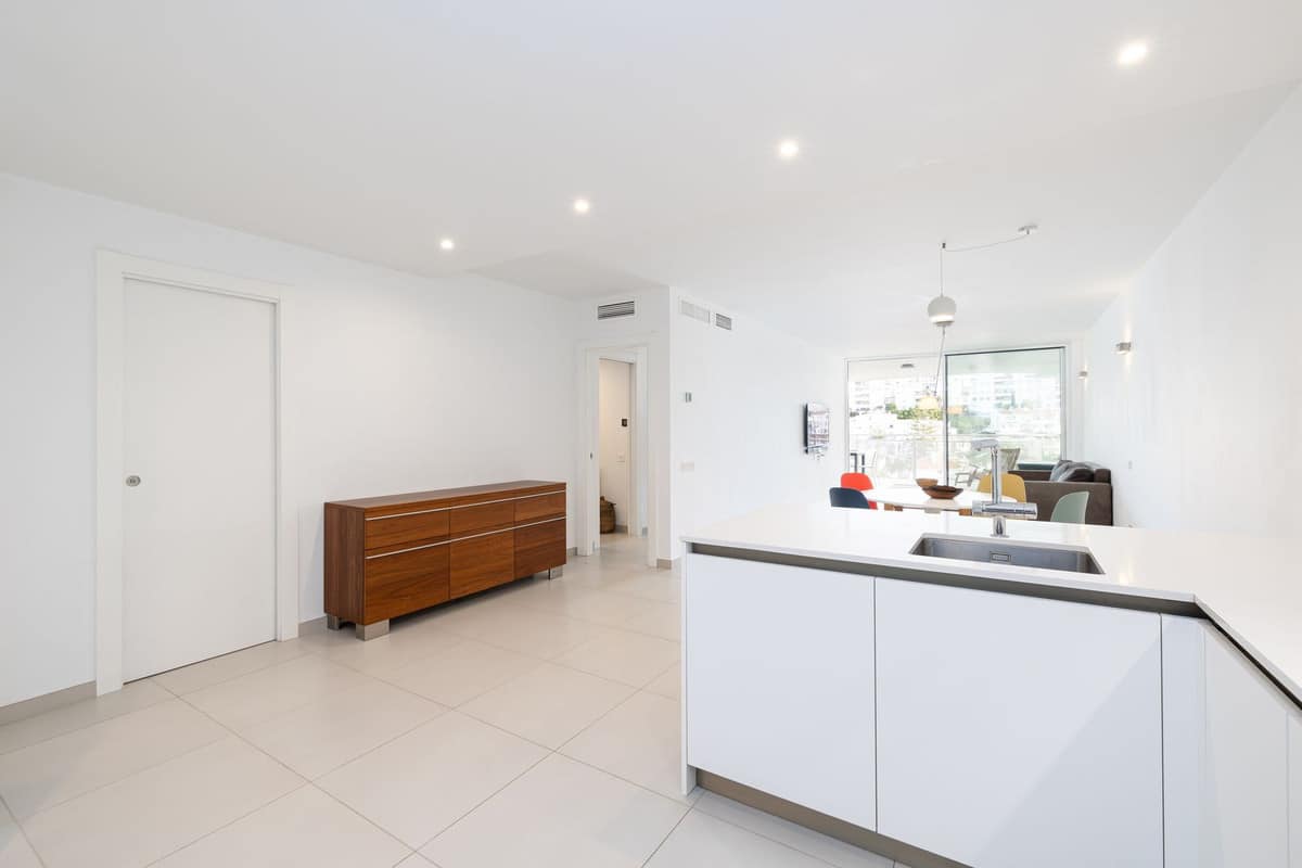 inside, the apartment boasts two bedrooms and two modern bathrooms equipped with Roca Smart toilets. The open-plan kitchen is fitted with high-quality Bosch appliances and sleek cabinetry. Both the living room and master bedroom open onto the terrace, filling the apartment with natural light. Elegant Saloni floor tiles flow throughout.
