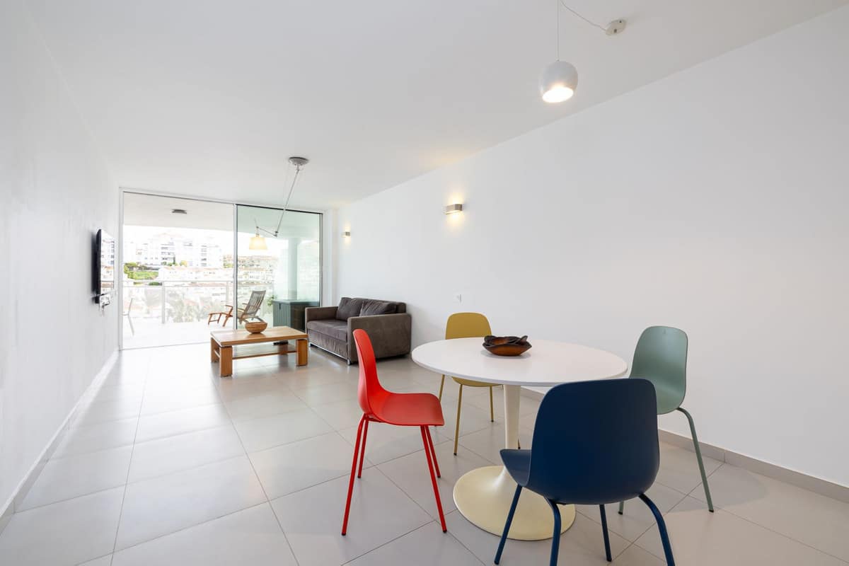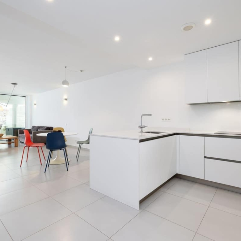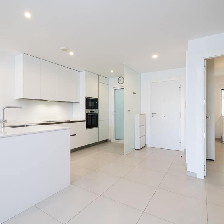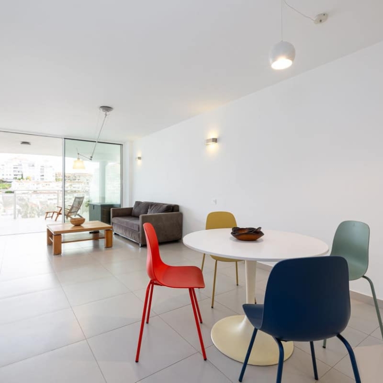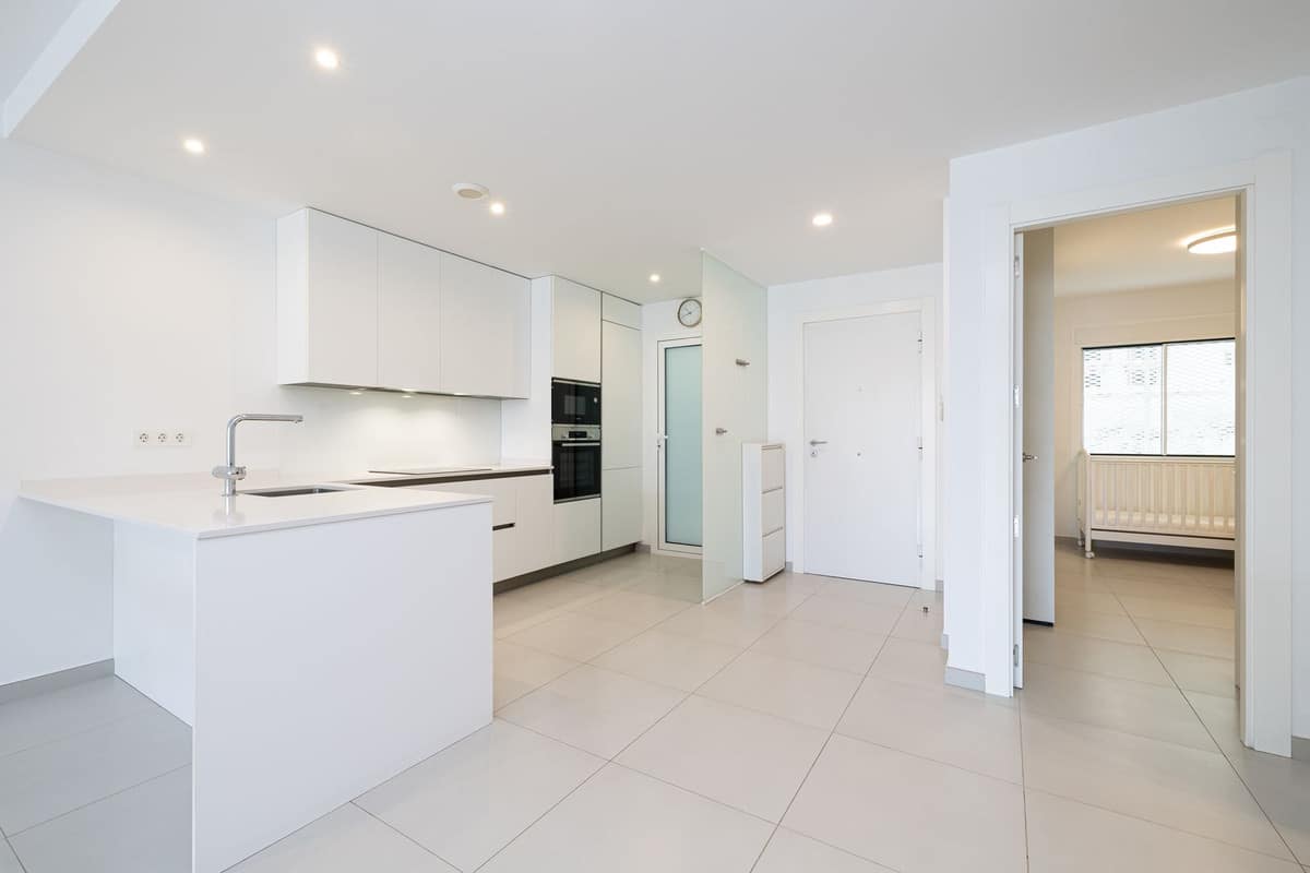 inside, the apartment boasts two bedrooms and two modern bathrooms equipped with Roca Smart toilets. The open-plan kitchen is fitted with high-quality Bosch appliances and sleek cabinetry. Both the living room and master bedroom open onto the terrace, filling the apartment with natural light. Elegant Saloni floor tiles flow throughout.