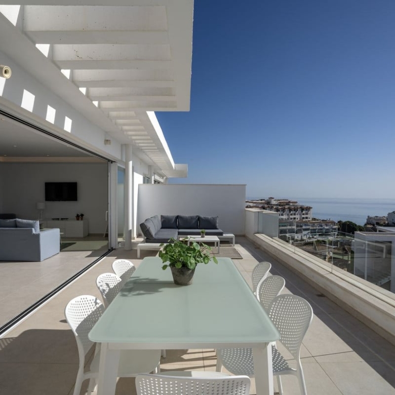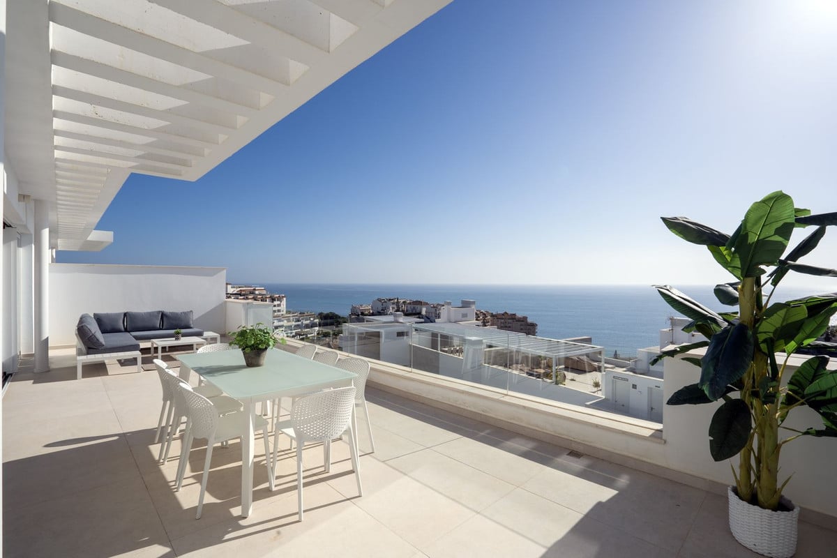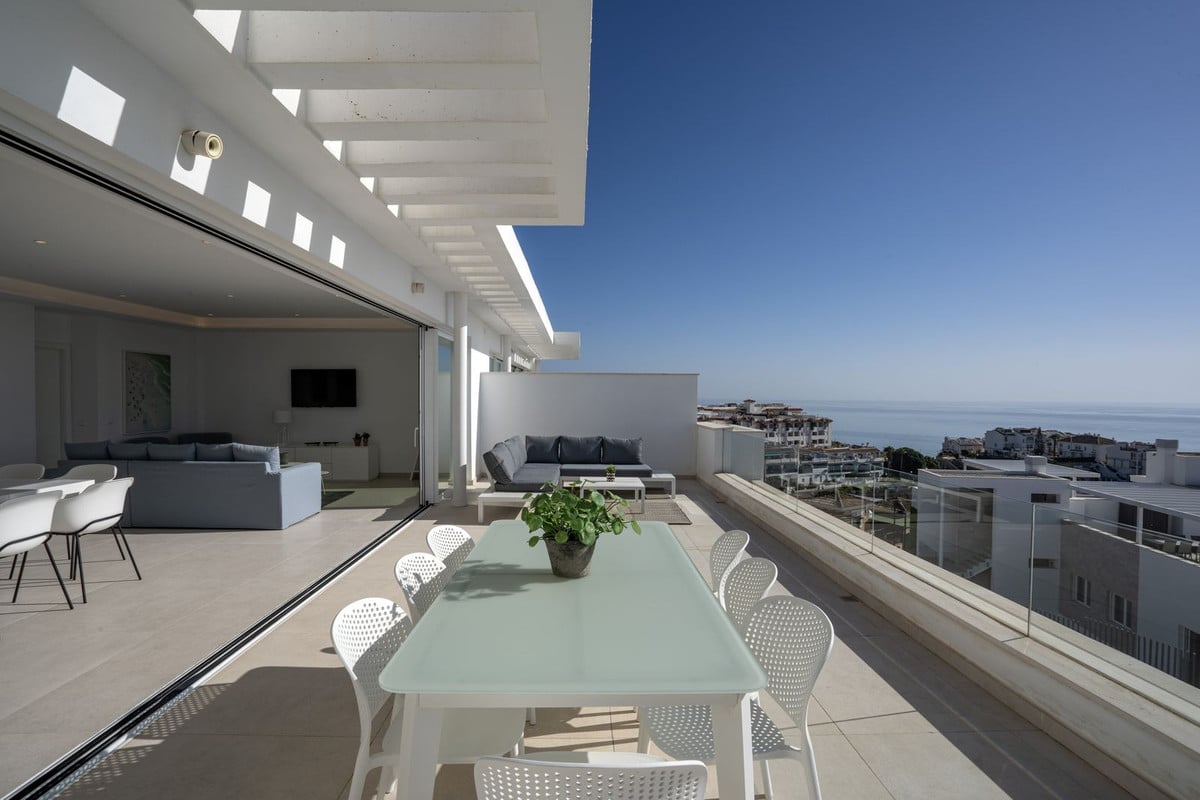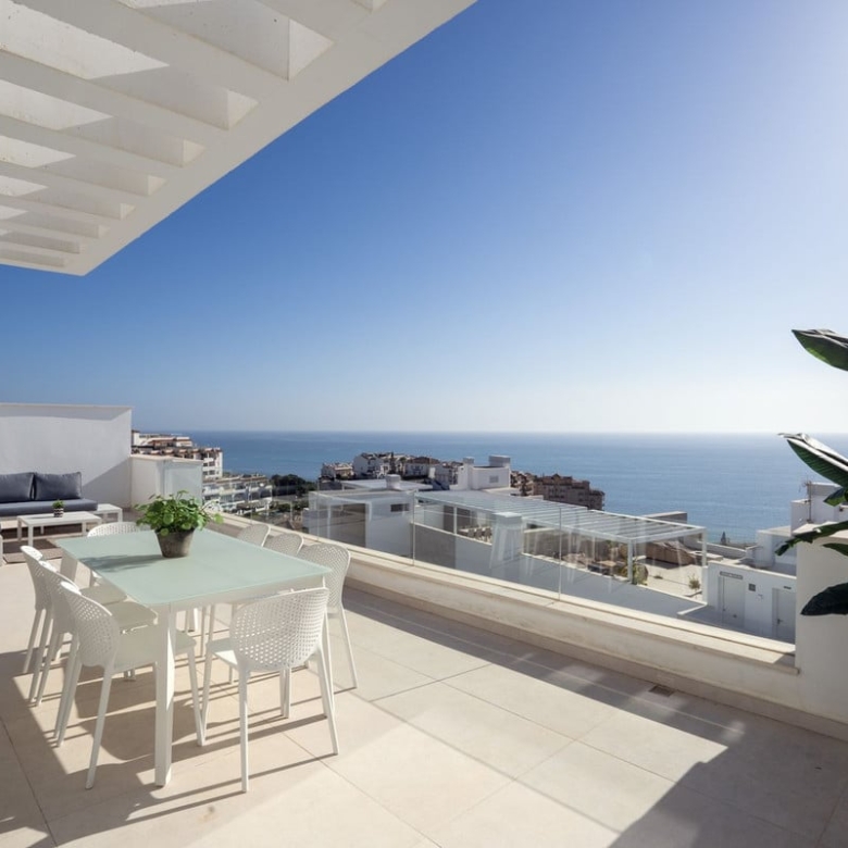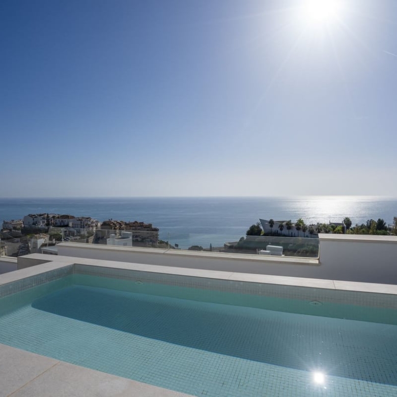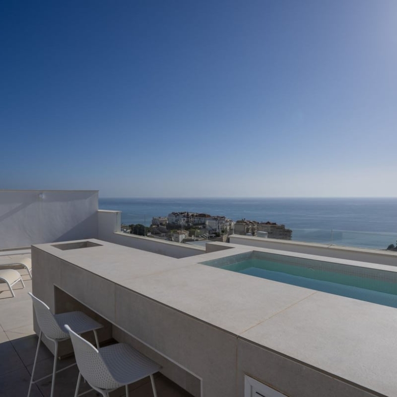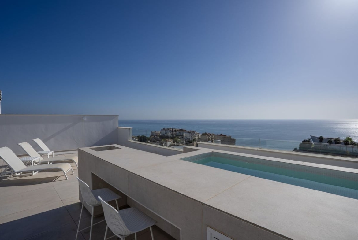 Splendid duplex penthouse in Benalmadena Costa, 20 minutes from Malaga airport. Bathed in light, thanks to huge bay windows offering 180-degree sea views. The first level of this apartment opens onto a spacious living room equipped with noble materials, opening onto an open-plan kitchen with central island and top-of-the-range appliances. The living area opens onto a terrace. Master en suite with walking closet and second en suite bedroom with dressing room. Upstairs, private roof terrace with private pool, bar and panoramic sea view. Private elevator. Home automation throughout the apartment and secure residence with gym and spa. Storage and 2 parking spaces included in the price.