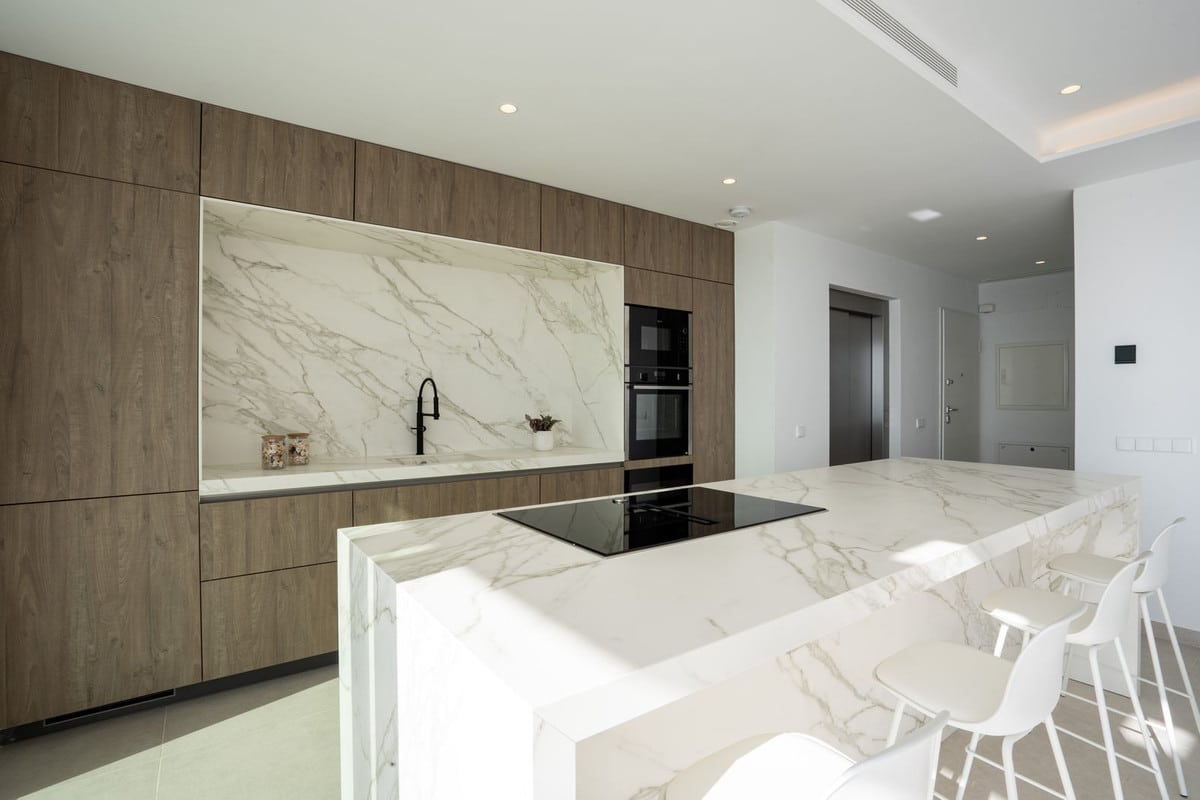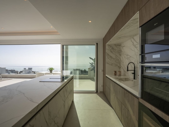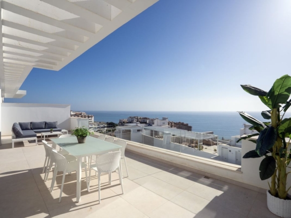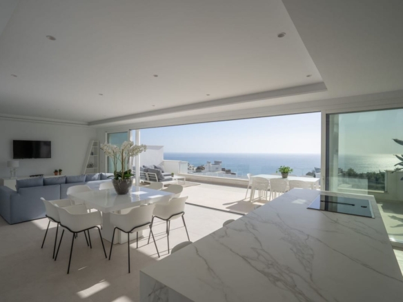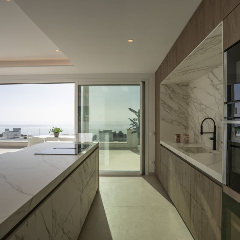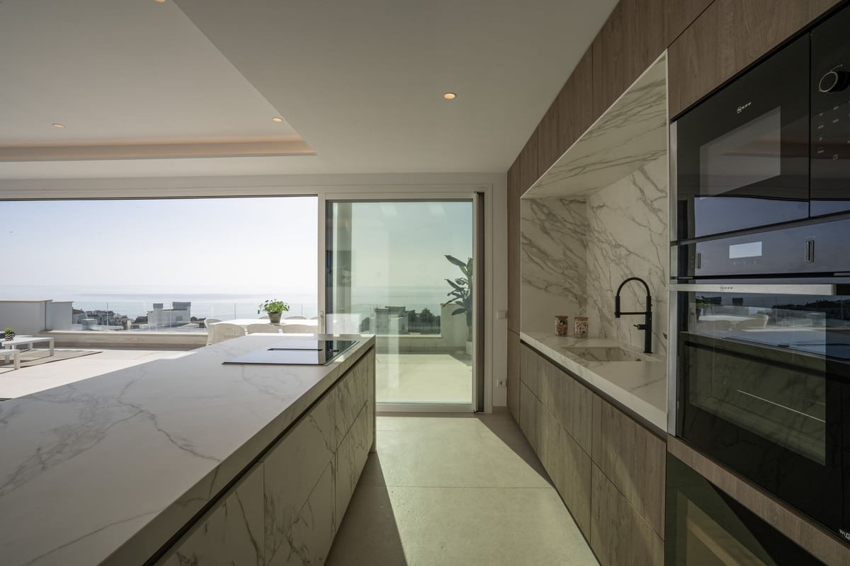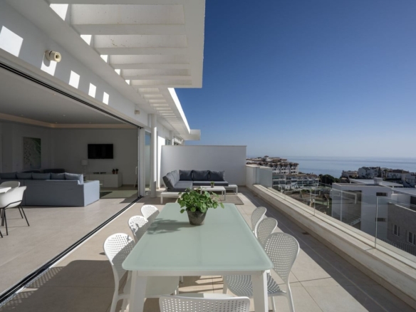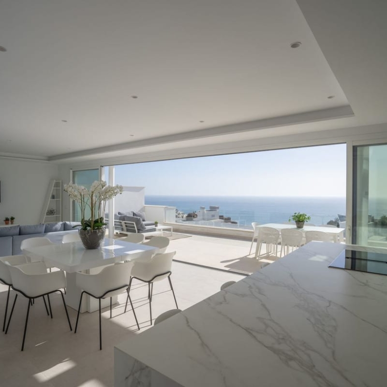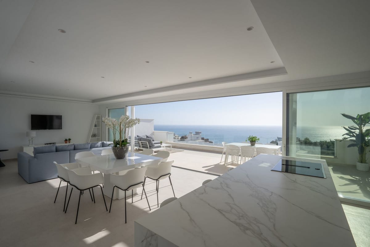 Splendid duplex penthouse in Benalmadena Costa, 20 minutes from Malaga airport. Bathed in light, thanks to huge bay windows offering 180-degree sea views. The first level of this apartment opens onto a spacious living room equipped with noble materials, opening onto an open-plan kitchen with central island and top-of-the-range appliances. The living area opens onto a terrace. Master en suite with walking closet and second en suite bedroom with dressing room. Upstairs, private roof terrace with private pool, bar and panoramic sea view. Private elevator. Home automation throughout the apartment and secure residence with gym and spa. Storage and 2 parking spaces included in the price.