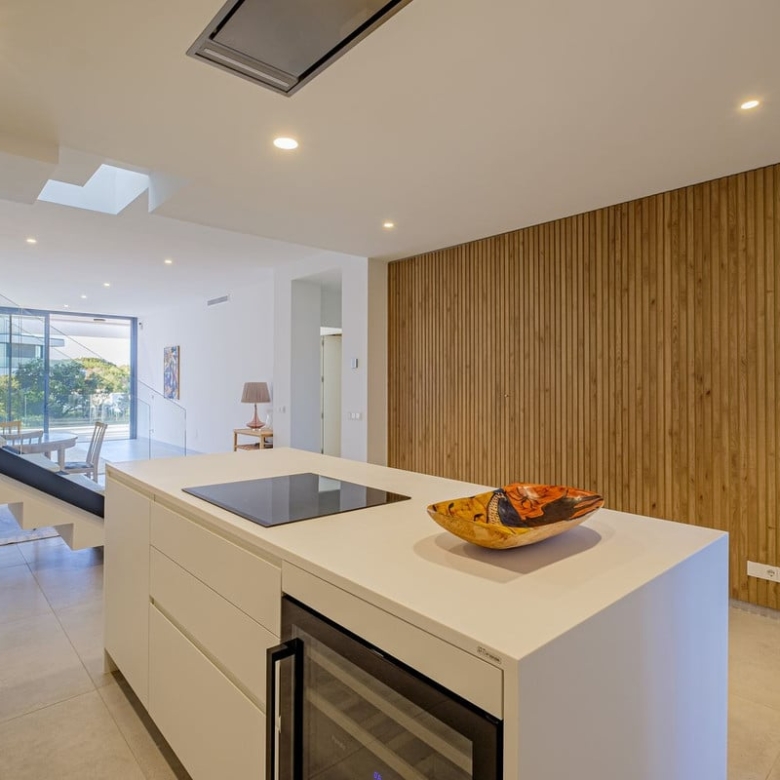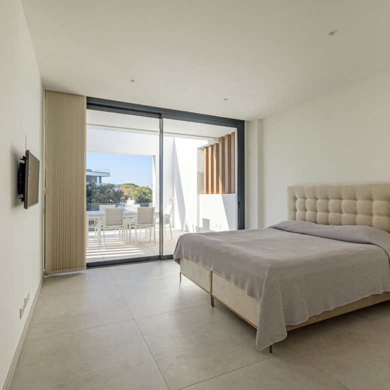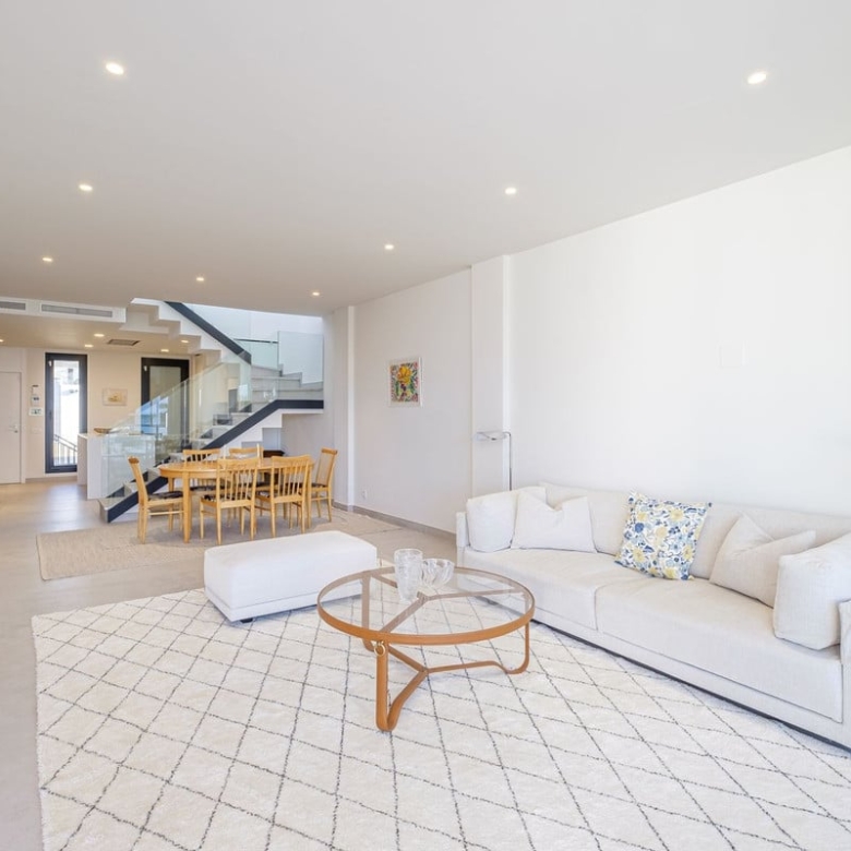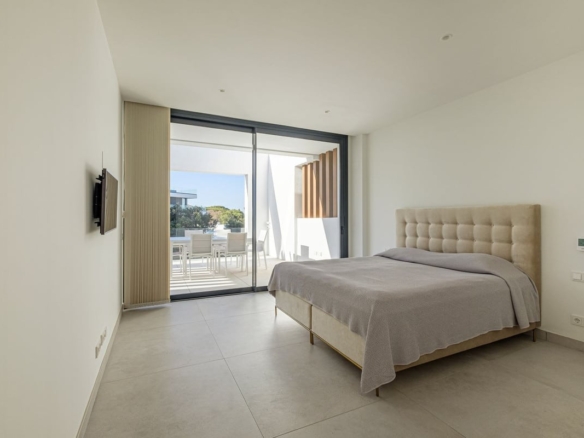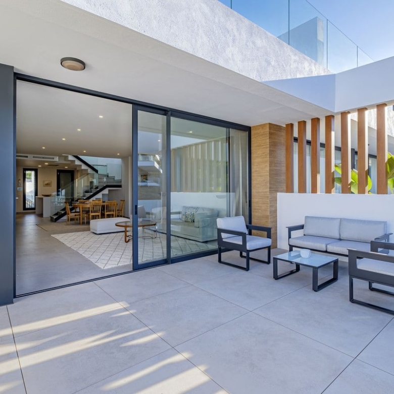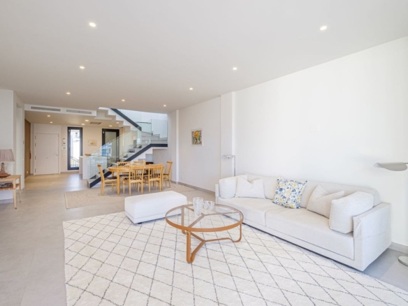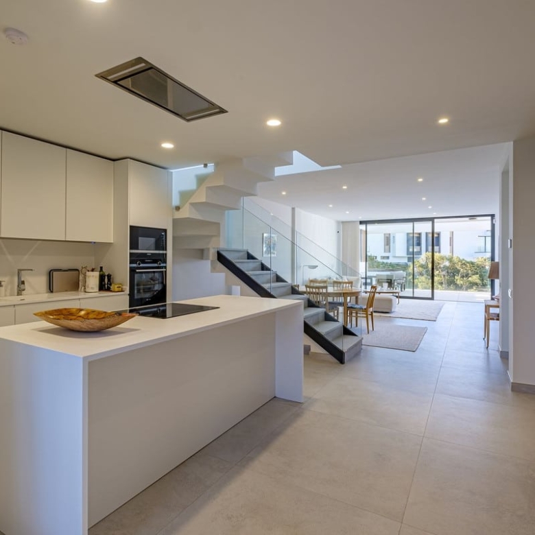 The living area opens directly onto a large private terrace offering views of the sea as well as of the beautifully designed community pool and gardens with wooden walkways and a tranquil water feature running the entire length of the urbanisation.
