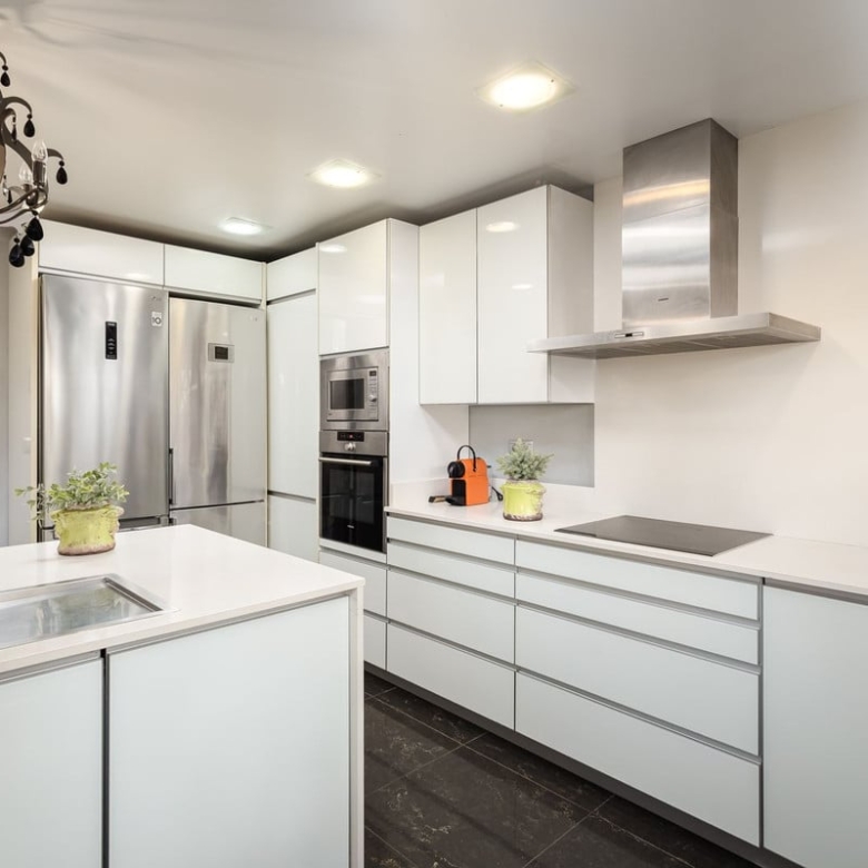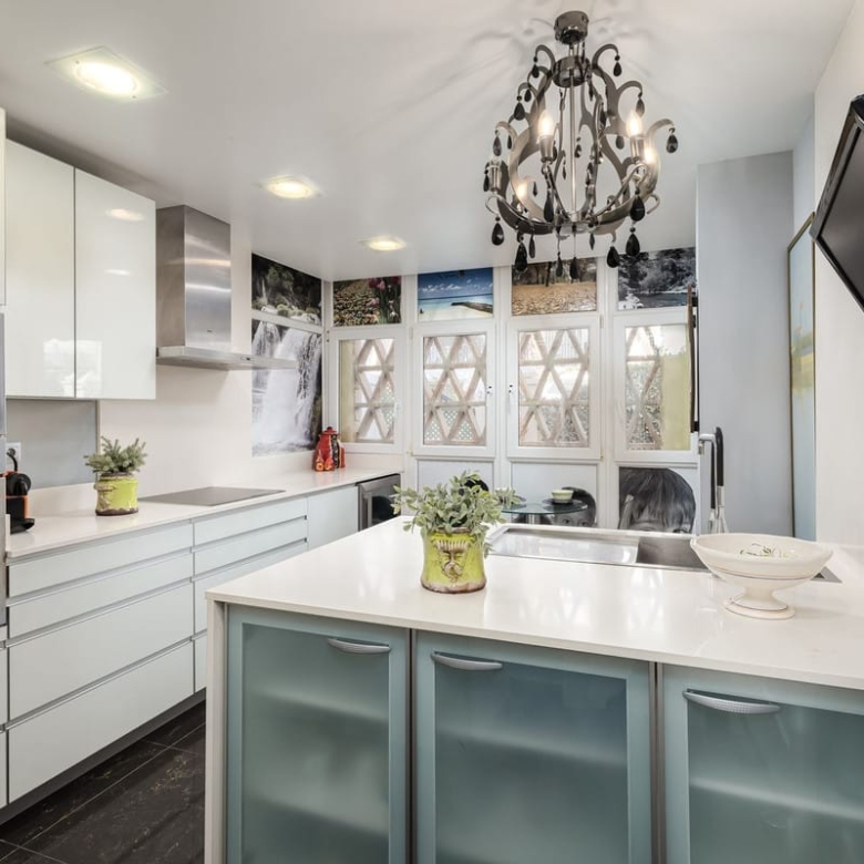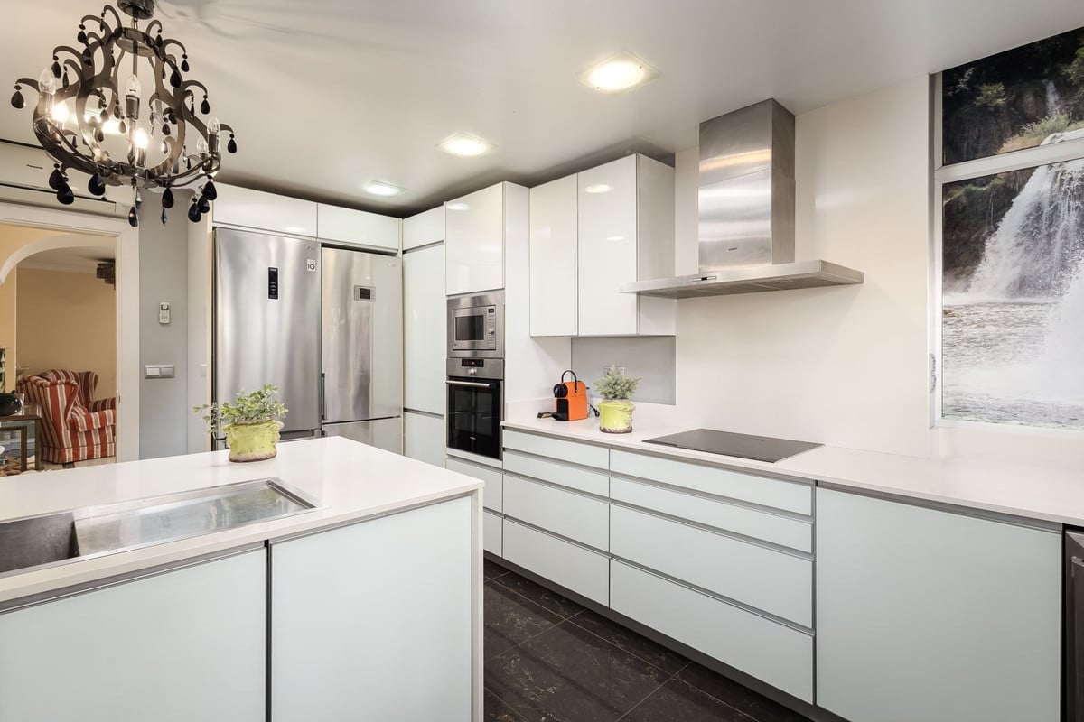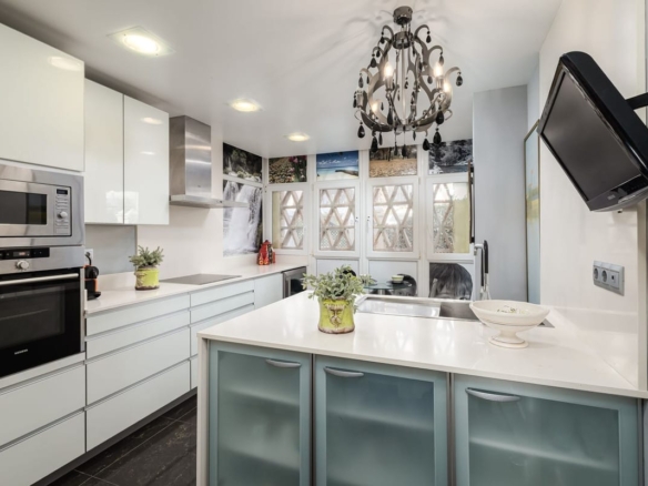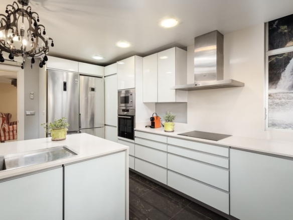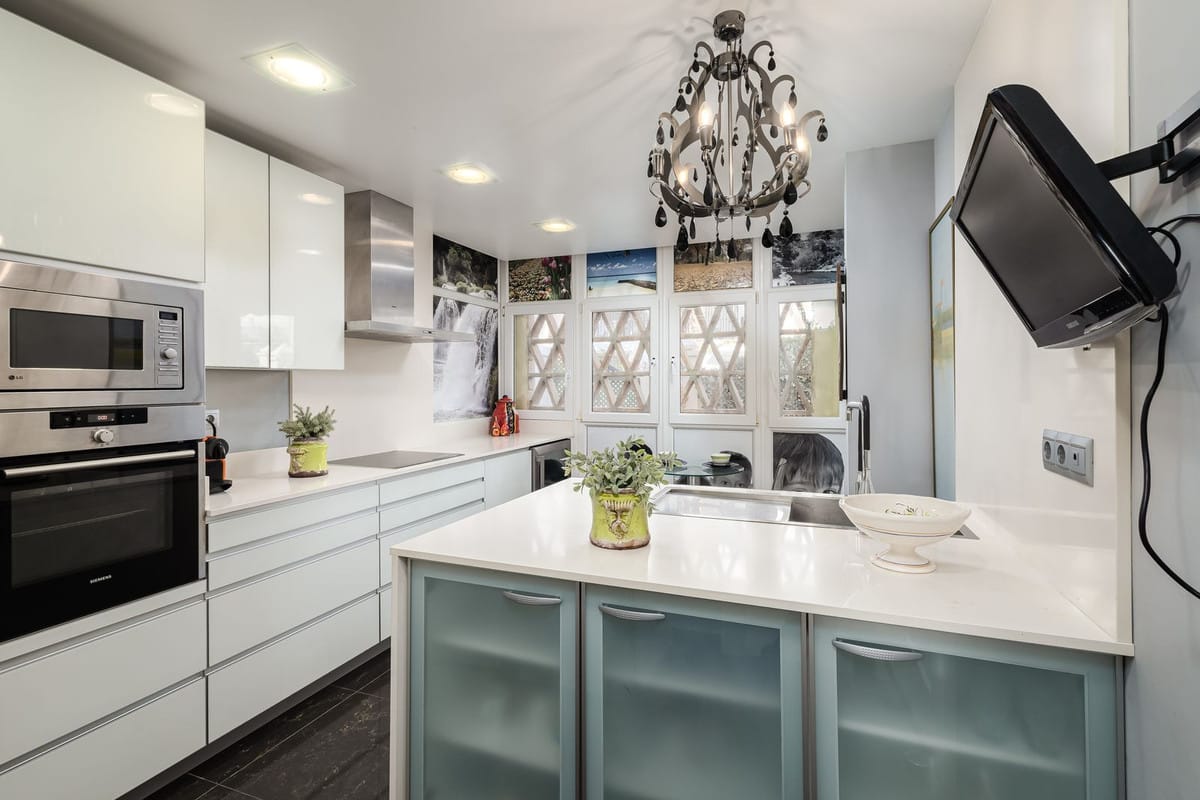 The modern, functional kitchen has direct access to a private terrace with a jacuzzi, the perfect spot to unwind while enjoying the refreshing sea breeze.