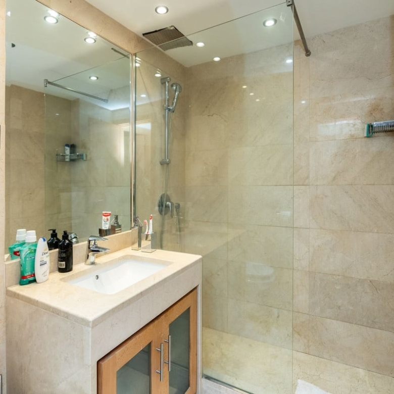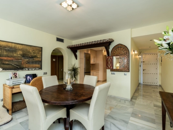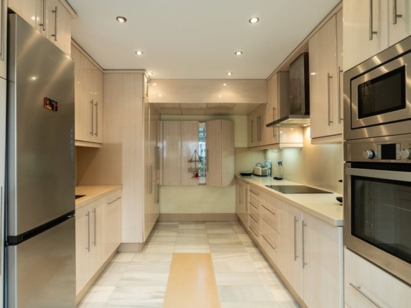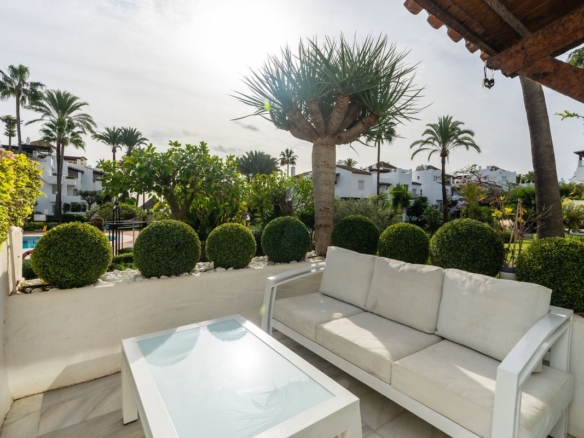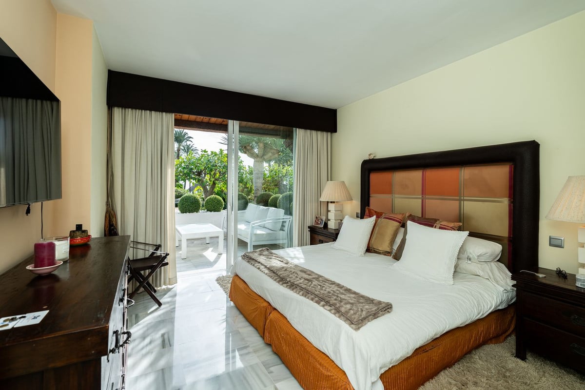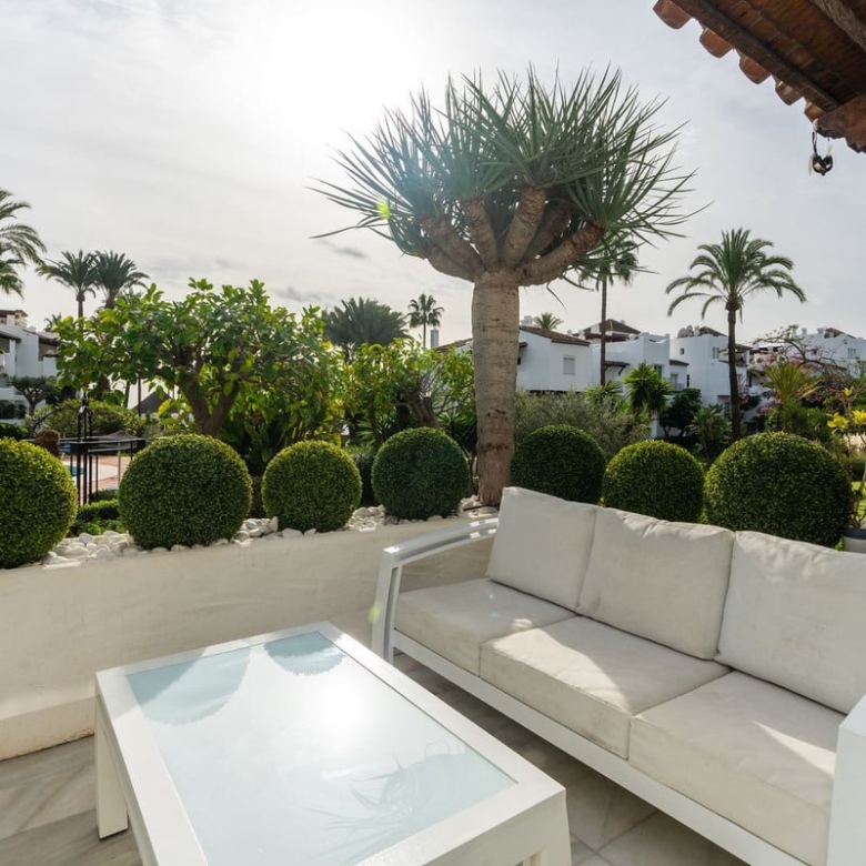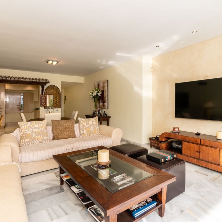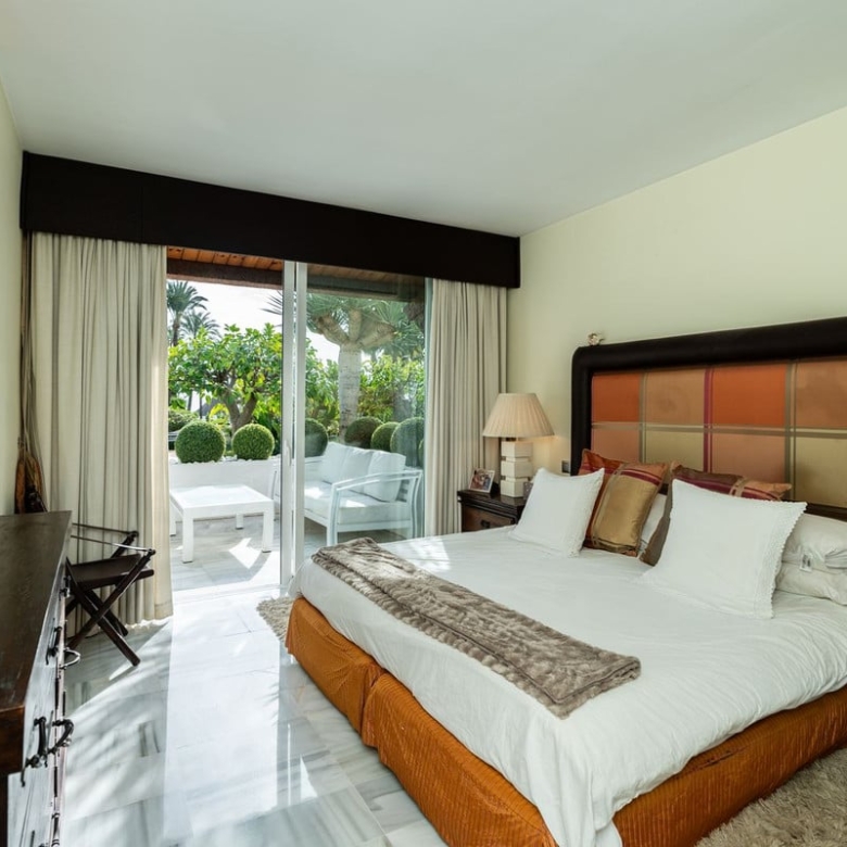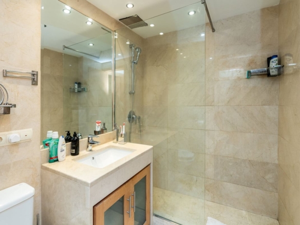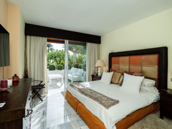 The apartment boasts breathtaking views of the sparkling Mediterranean Sea and the pristine pools within the lush, landscaped gardens. Step out onto your private terrace, an ideal space for outdoor dining, sunbathing, or simply enjoying the serene surroundings.