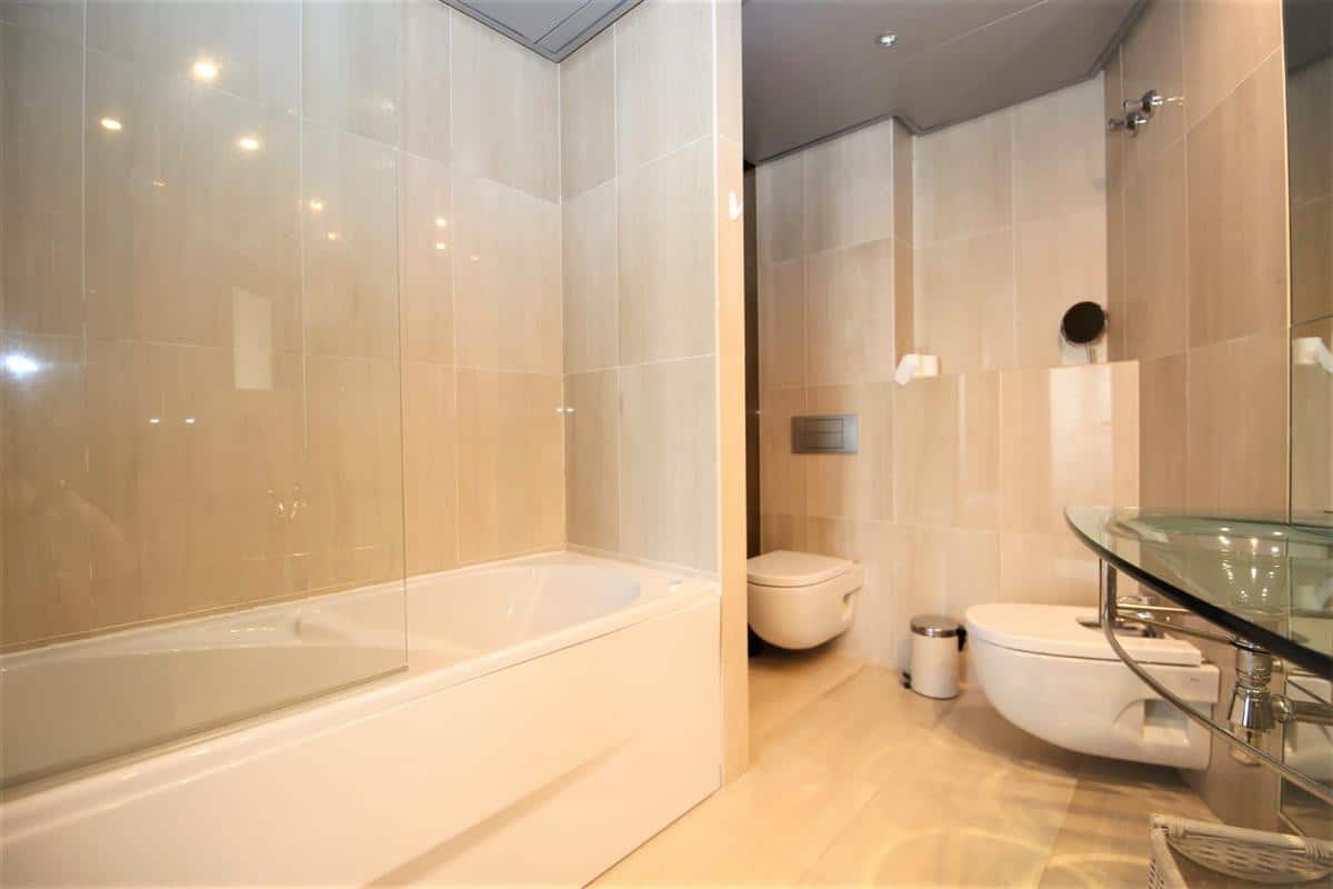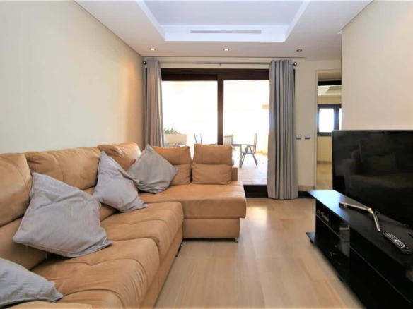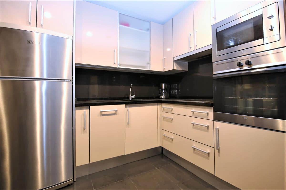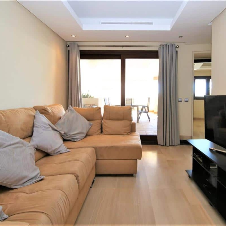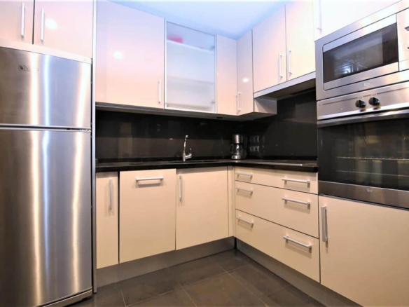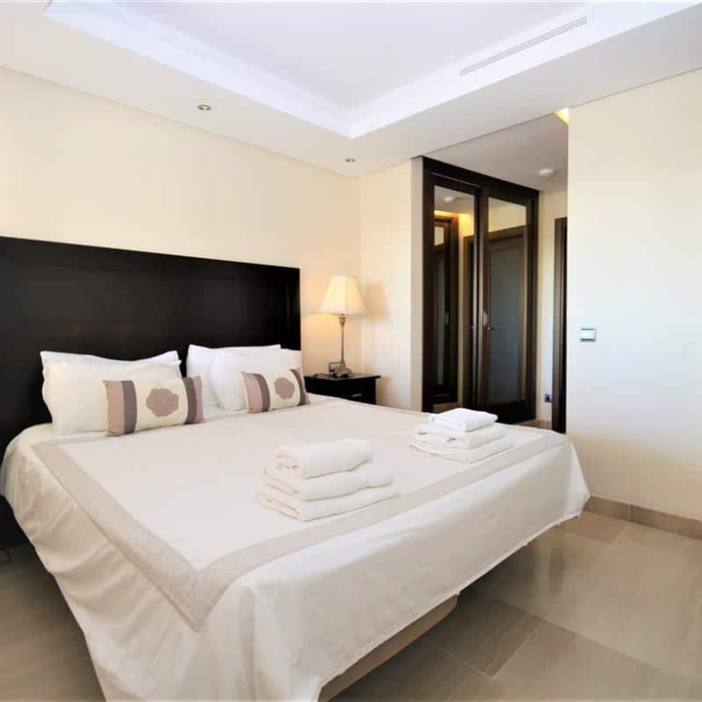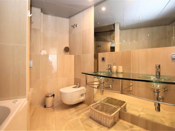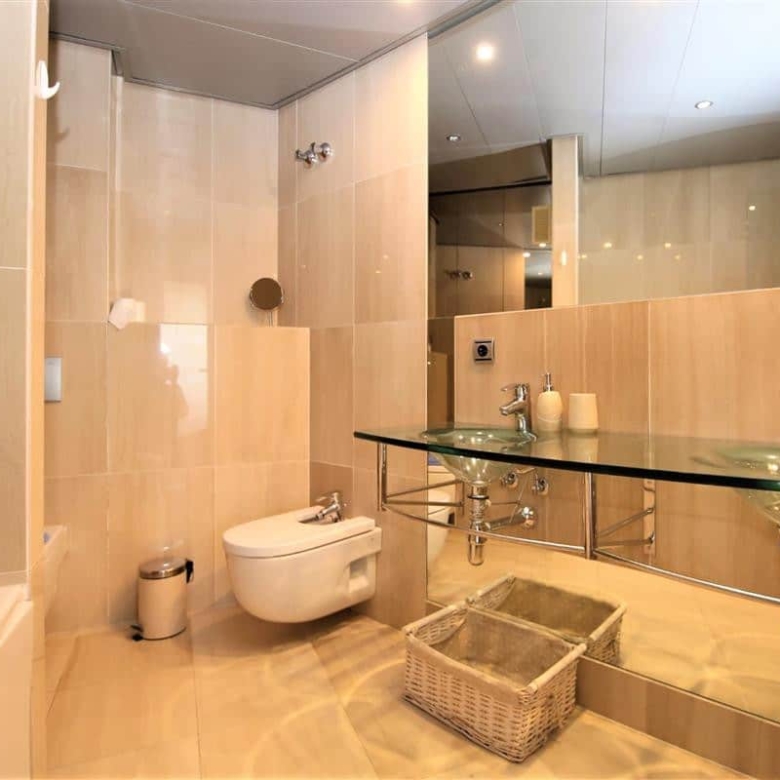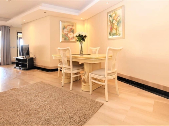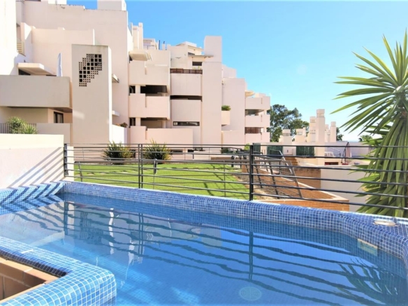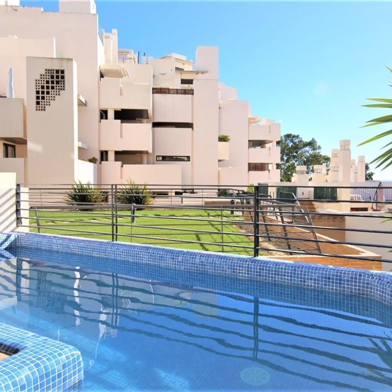 This modern two-bedroom ground floor apartment is located within the popular secure urbanisation of Bahia de la Plata, which has two outdoor swimming pools, community gymnasium with Jacuzzi, steam room and sauna. There is also a paddle court and an indoor heated pool for winter (within the spa area). From the community, there is a security gate to the promenade and beach. Also a small restaurant operates just outside these gates. 24 hour security is based at the urbanisation entrance. The property offers two good size bedrooms and a very generous terrace of 45m2 with space enough for sun loungers, dining area and relaxer seating. it even has its own private plunge pool! A master bedroom with en-suite bathroom – bathtub, WC, separate shower, two hand basins and bidet, underfloor heating, along with plenty of built-in wardrobes. Second bedroom has access to the large terrace and has an en-suite shower room with lavatory, hand basin and bidet. The kitchen is well laid out and offers a separate laundry area and natural stone countertops. There is a centralised air conditioning system with individual room control. Along with the features above, the apartment has two parking spaces available withing the secure underground parking lot and a storage unit. Furniture can be included in the final sales price, subject to negotiation