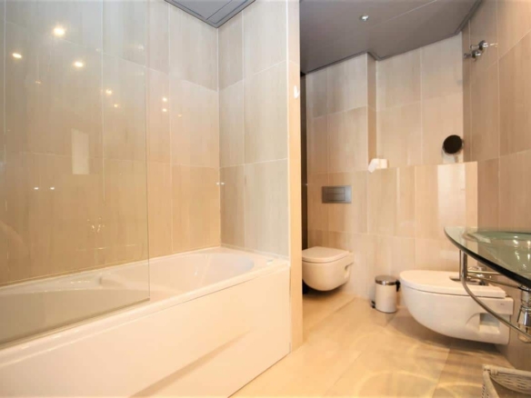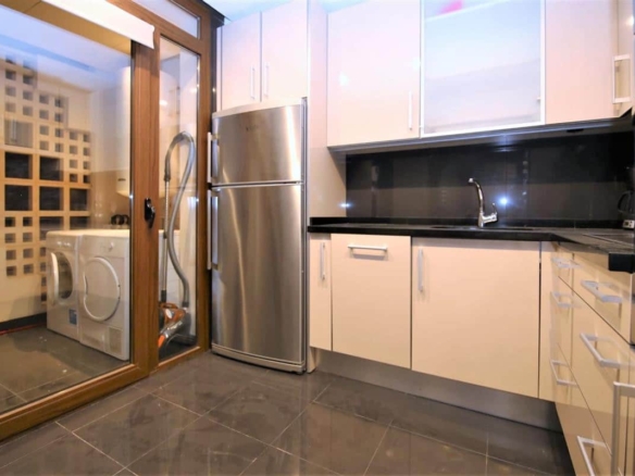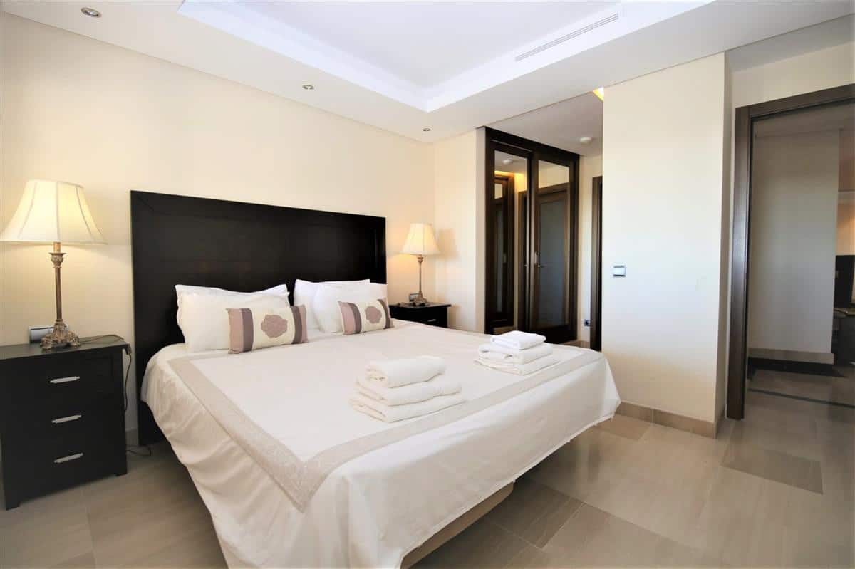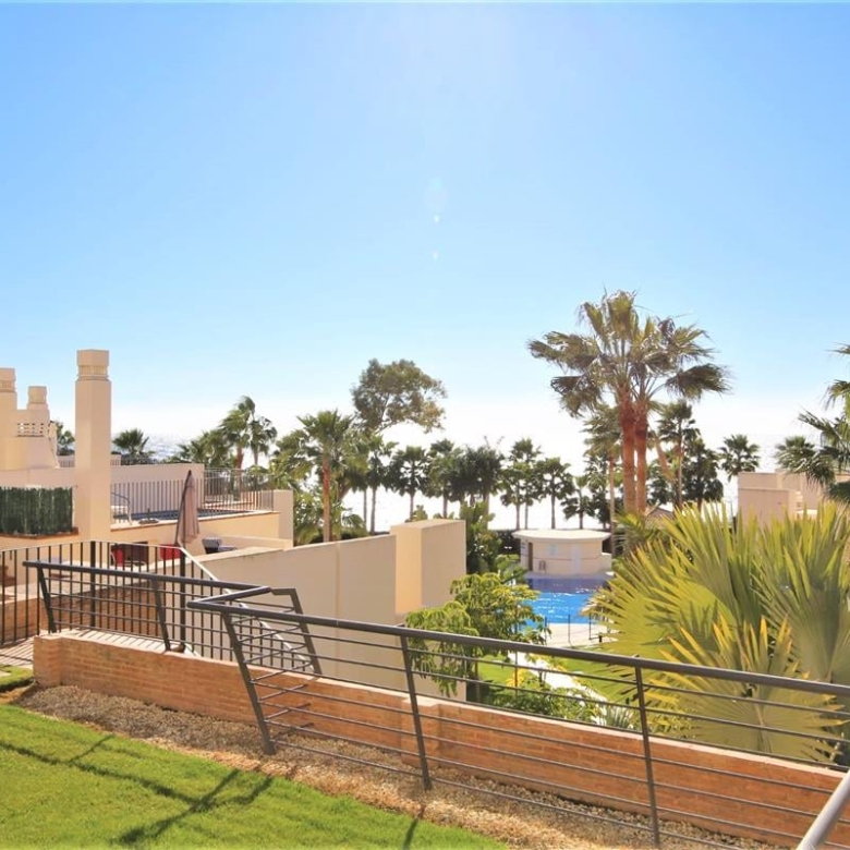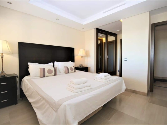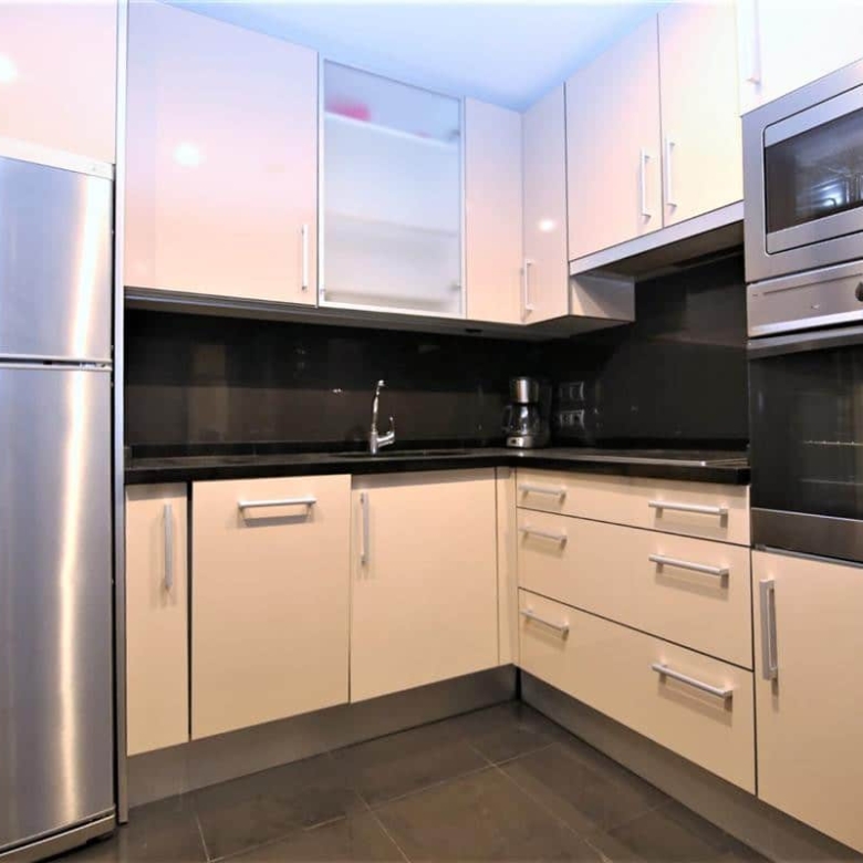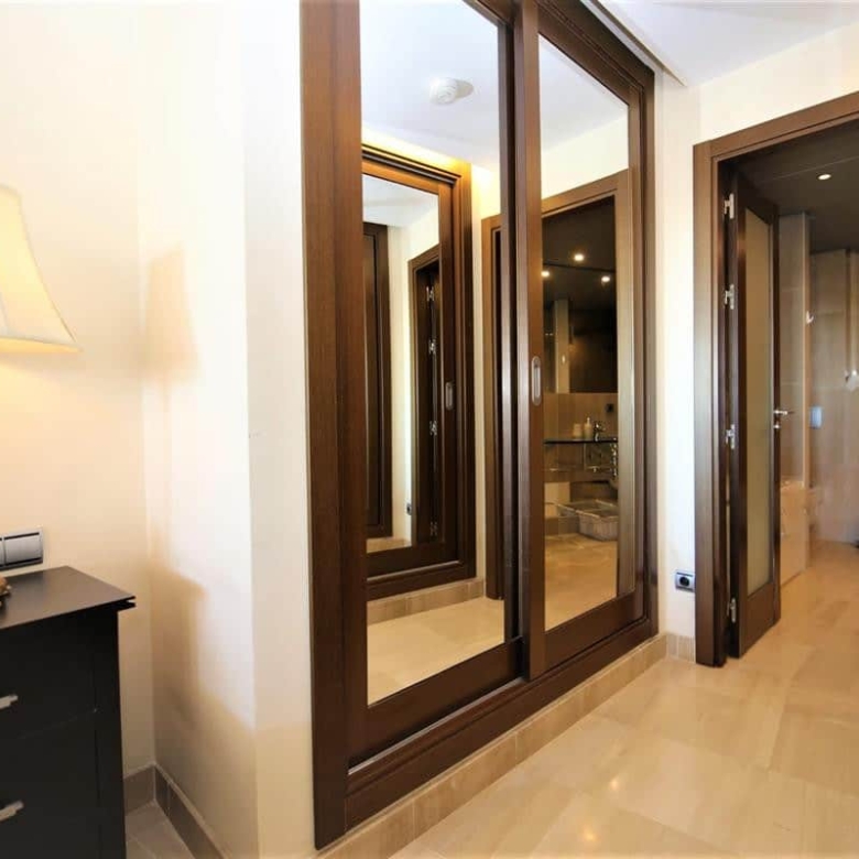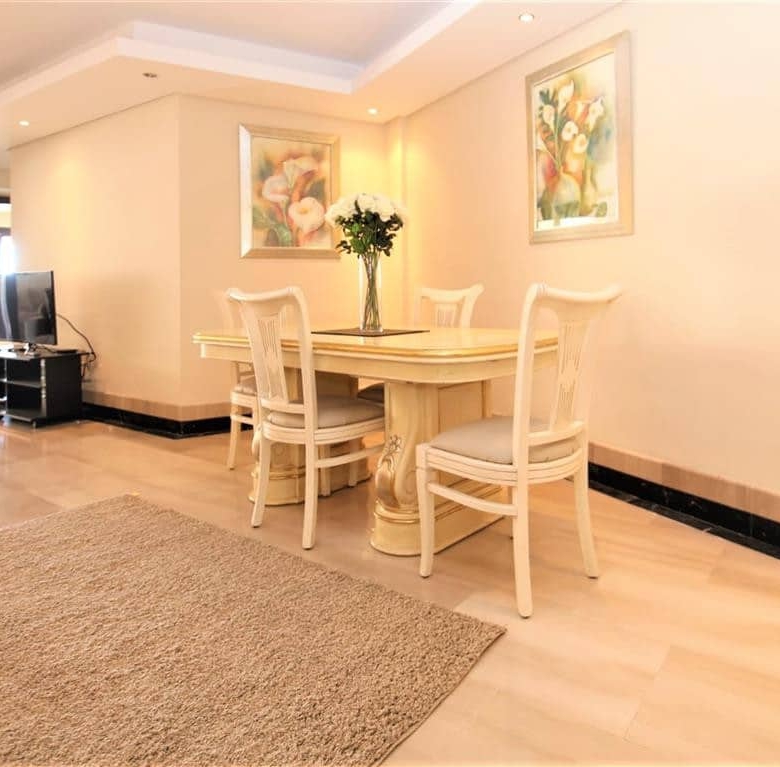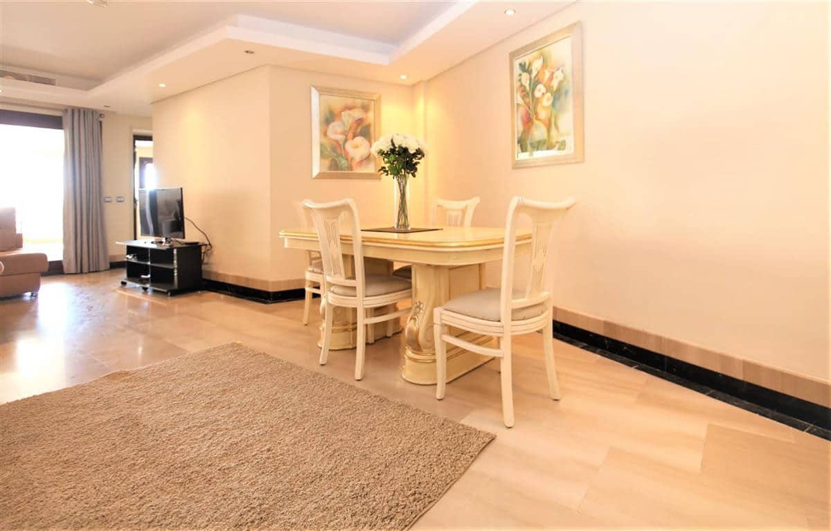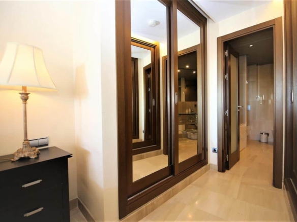 This modern two-bedroom ground floor apartment is located within the popular secure urbanisation of Bahia de la Plata, which has two outdoor swimming pools, community gymnasium with Jacuzzi, steam room and sauna. There is also a paddle court and an indoor heated pool for winter (within the spa area). From the community, there is a security gate to the promenade and beach. Also a small restaurant operates just outside these gates. 24 hour security is based at the urbanisation entrance. The property offers two good size bedrooms and a very generous terrace of 45m2 with space enough for sun loungers, dining area and relaxer seating. it even has its own private plunge pool! A master bedroom with en-suite bathroom – bathtub, WC, separate shower, two hand basins and bidet, underfloor heating, along with plenty of built-in wardrobes. Second bedroom has access to the large terrace and has an en-suite shower room with lavatory, hand basin and bidet. The kitchen is well laid out and offers a separate laundry area and natural stone countertops. There is a centralised air conditioning system with individual room control. Along with the features above, the apartment has two parking spaces available withing the secure underground parking lot and a storage unit. Furniture can be included in the final sales price, subject to negotiation