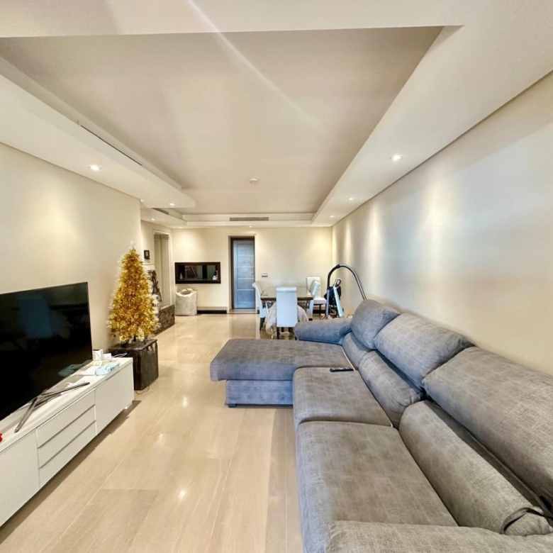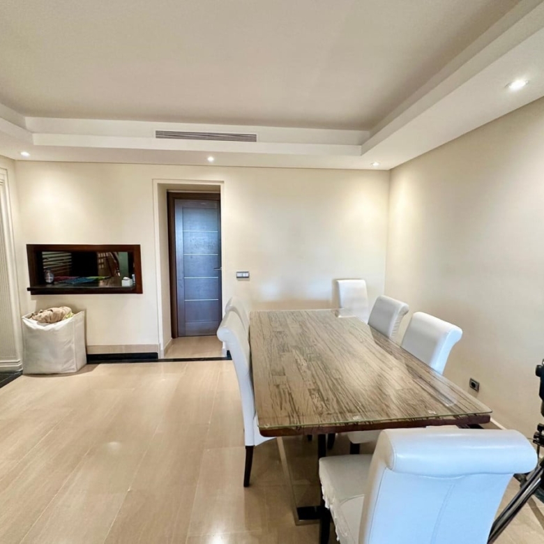 The apartment boasts a thoughtfully designed layout, featuring 2 spacious bedrooms and 2 well-appointed bathrooms. The interior is adorned with high-quality finishes, including marble floors and double glazing for enhanced comfort and style. The fully fitted kitchen is equipped with top-of-the-line appliances, seamlessly blending functionality with sophistication. The living and dining areas are bright and inviting, providing direct access to a private terrace where one can enjoy panoramic views of the sea, communal gardens, and the pool.