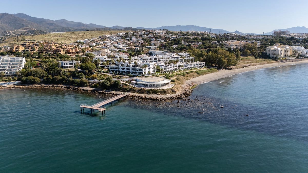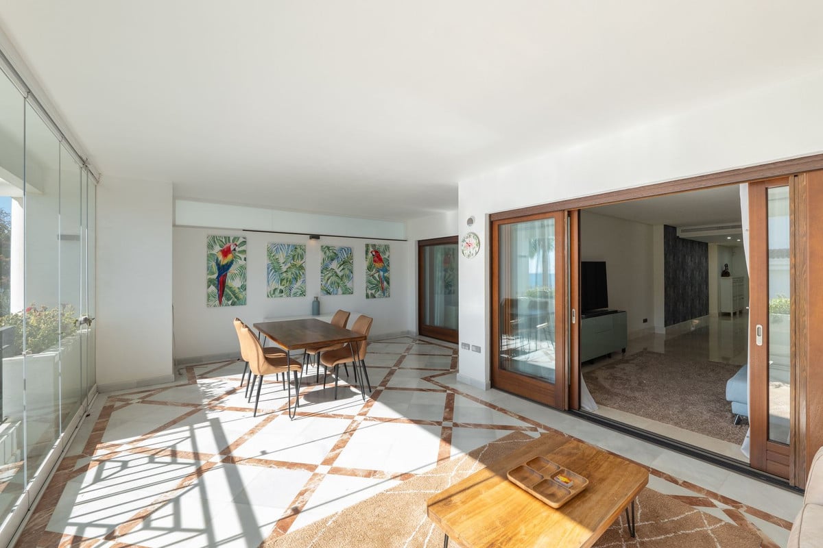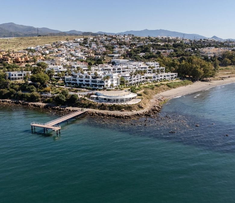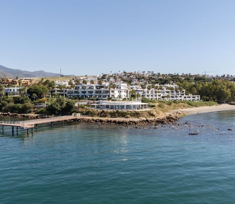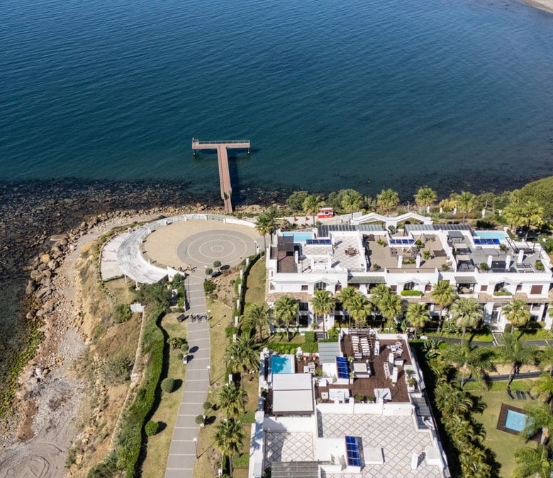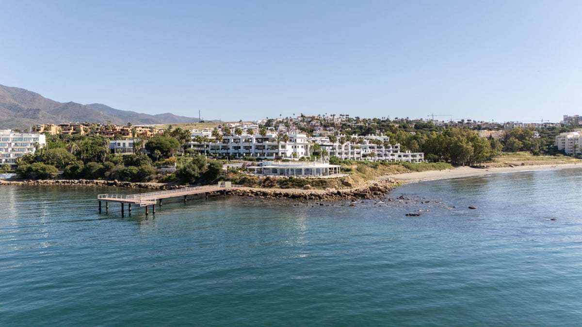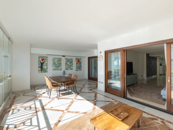 The functional layout includes two bedrooms, each with its own en-suite bathroom with underfloor heating. Additional space is provided by a glazed terrace with panoramic views of Gibraltar, Manilva, and the sea.