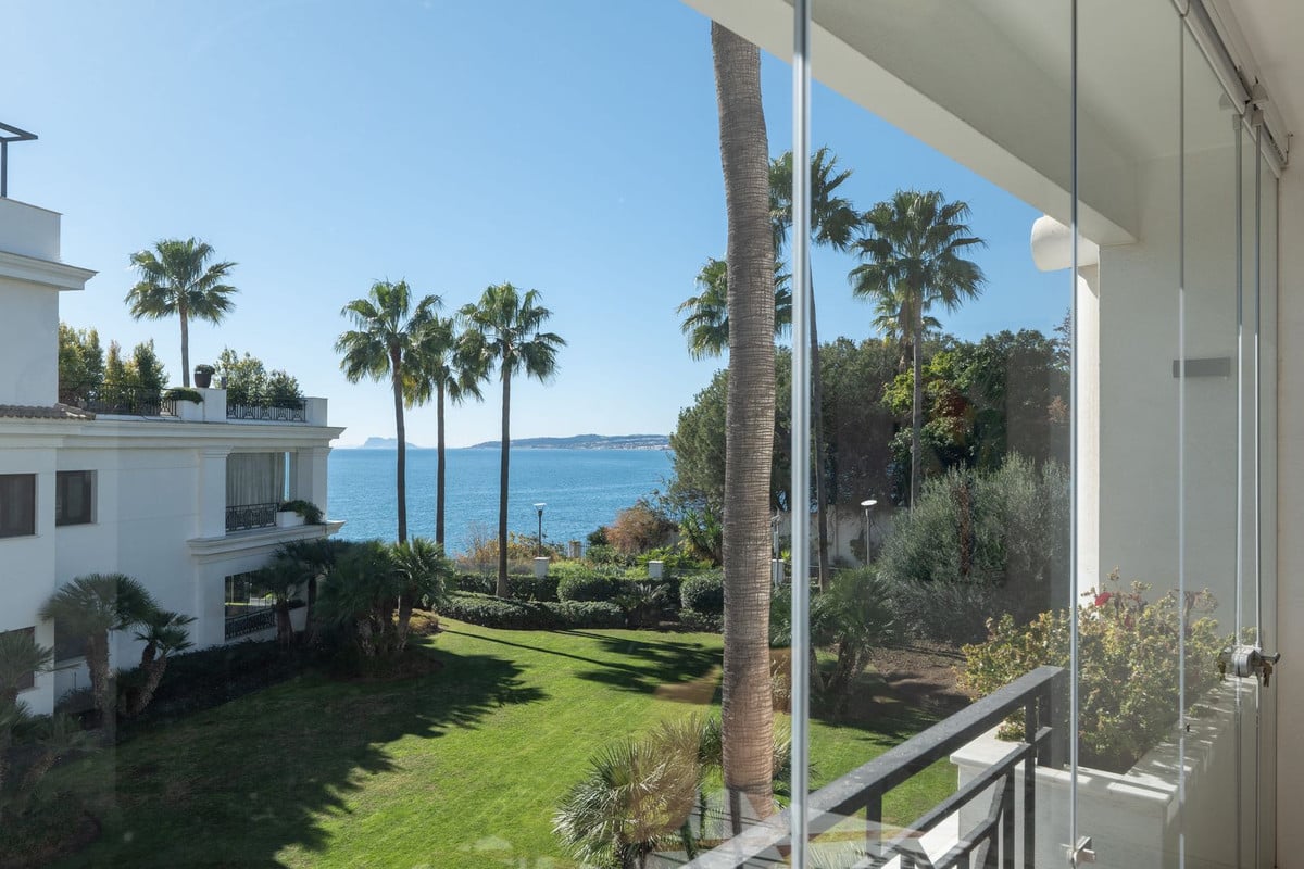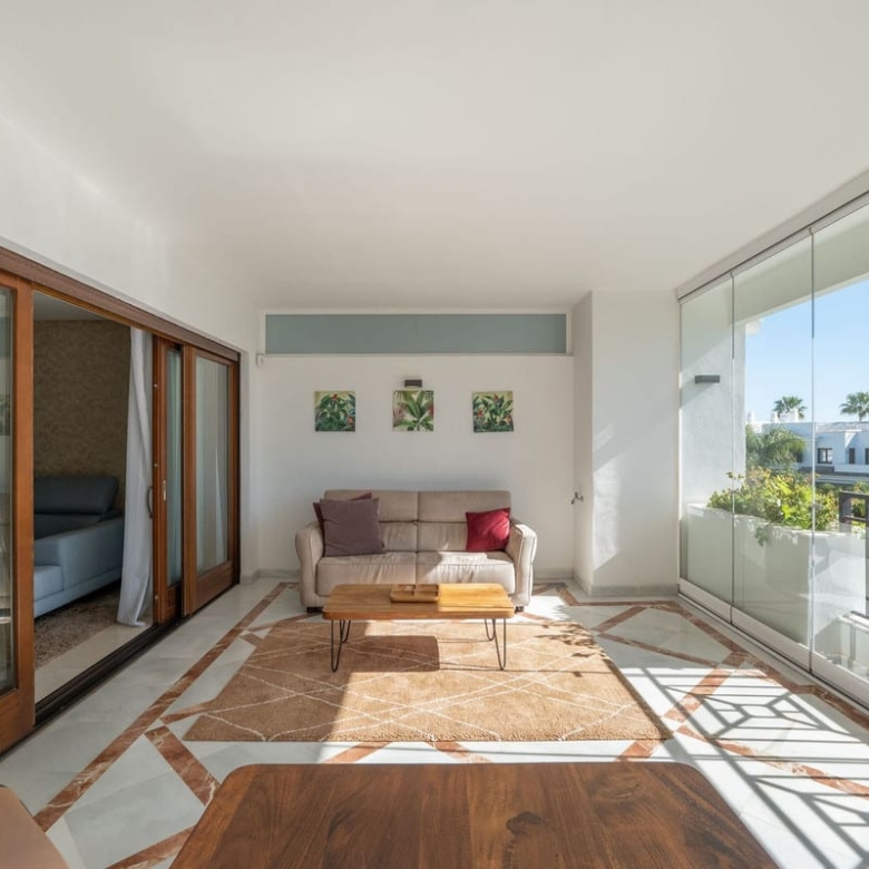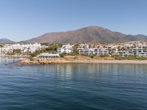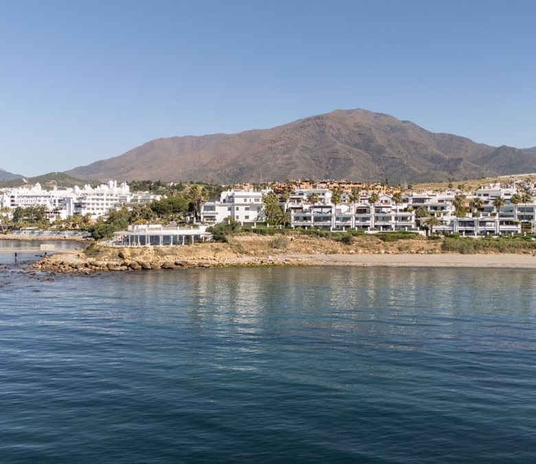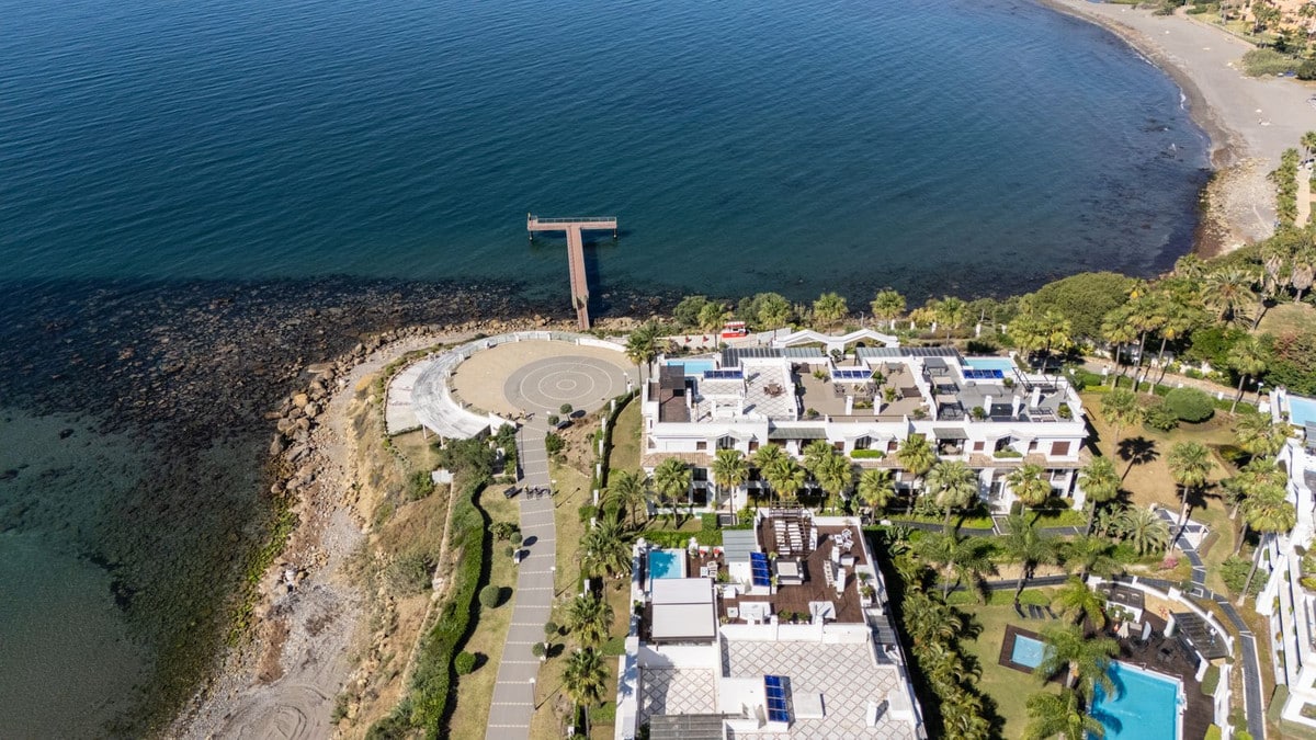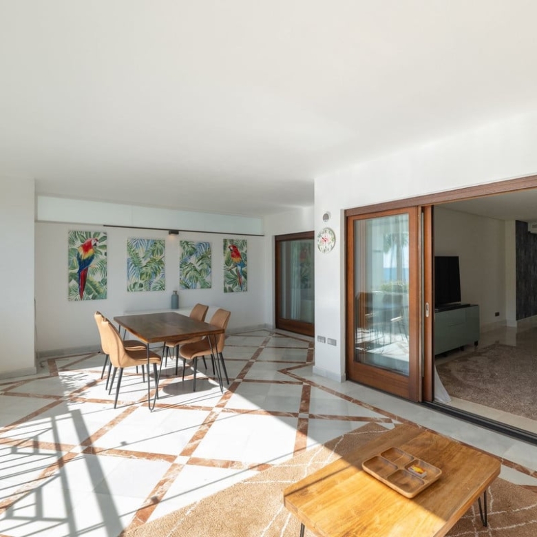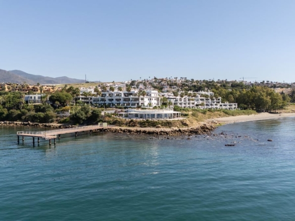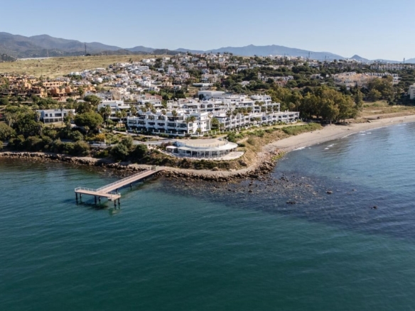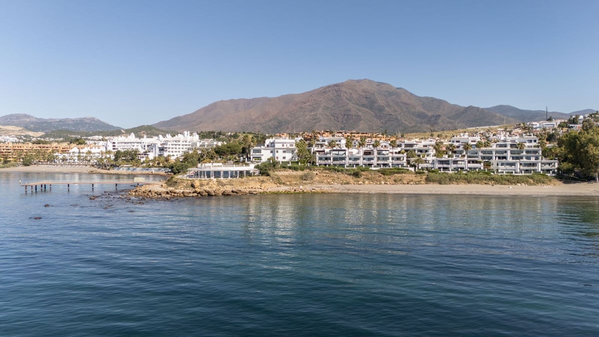 The functional layout includes two bedrooms, each with its own en-suite bathroom with underfloor heating. Additional space is provided by a glazed terrace with panoramic views of Gibraltar, Manilva, and the sea.