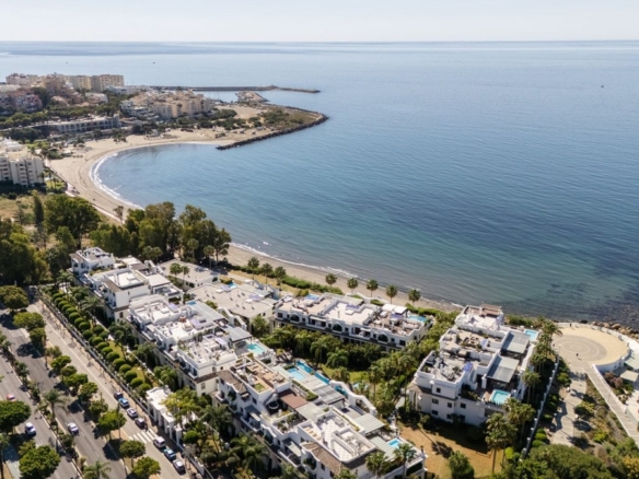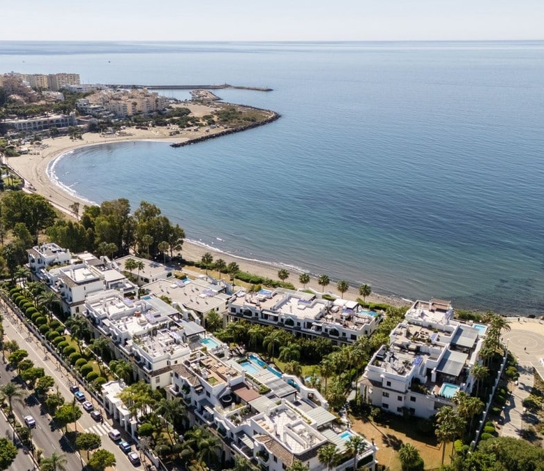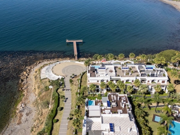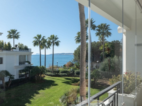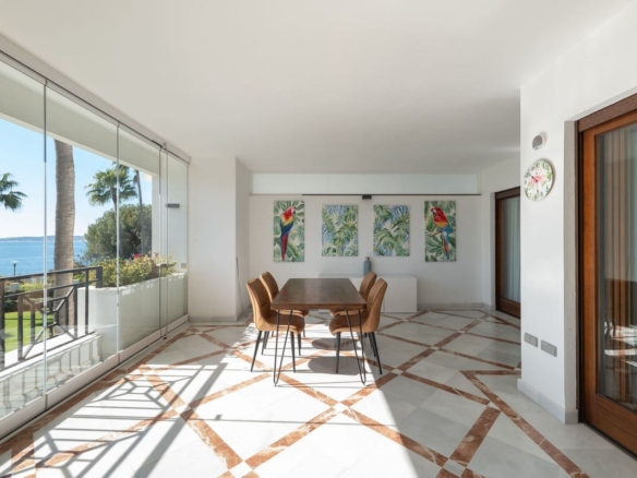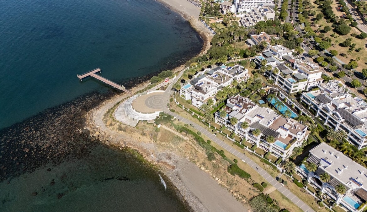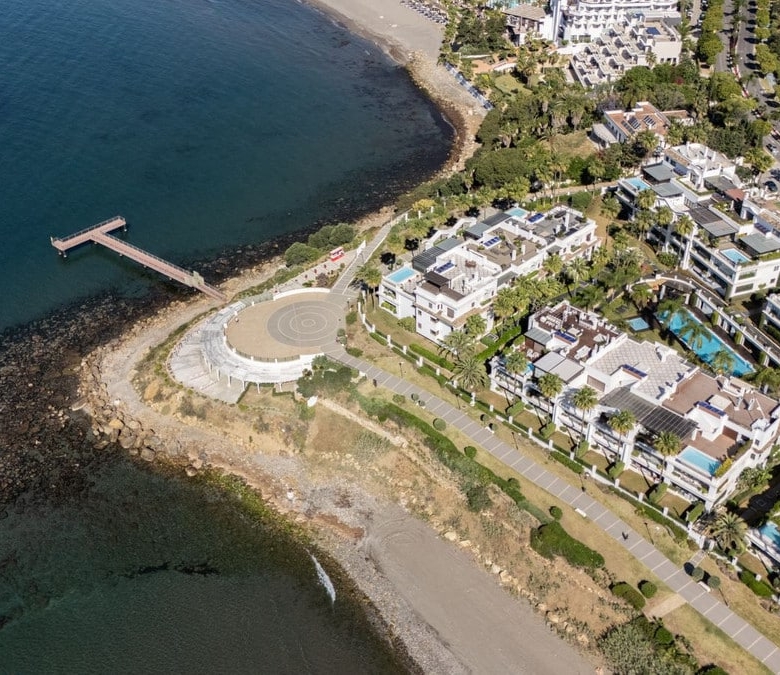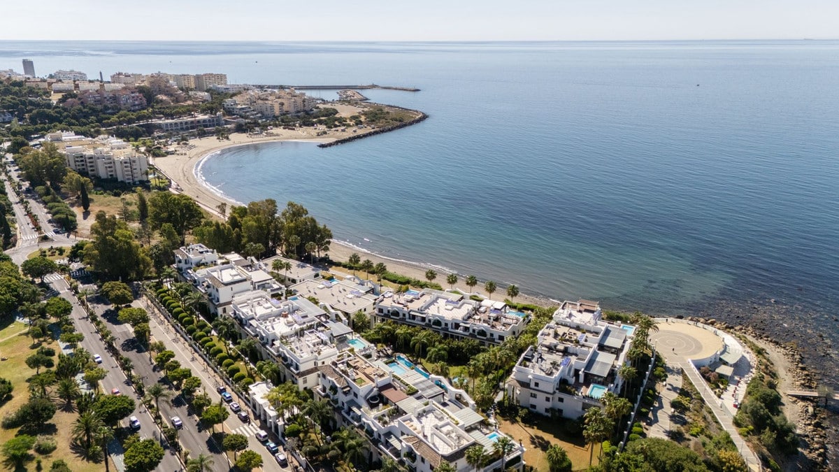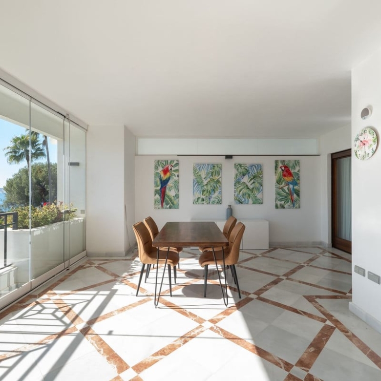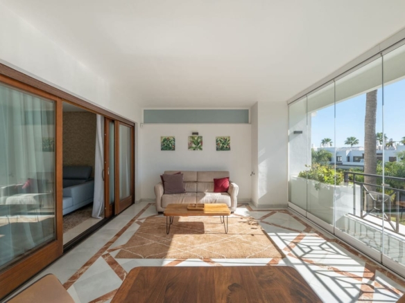 The functional layout includes two bedrooms, each with its own en-suite bathroom with underfloor heating. Additional space is provided by a glazed terrace with panoramic views of Gibraltar, Manilva, and the sea.