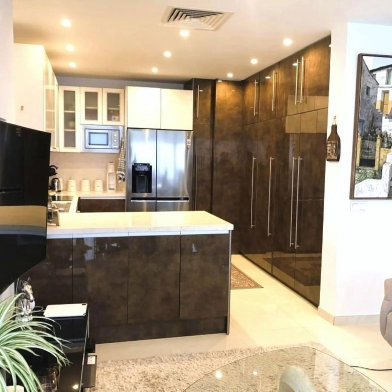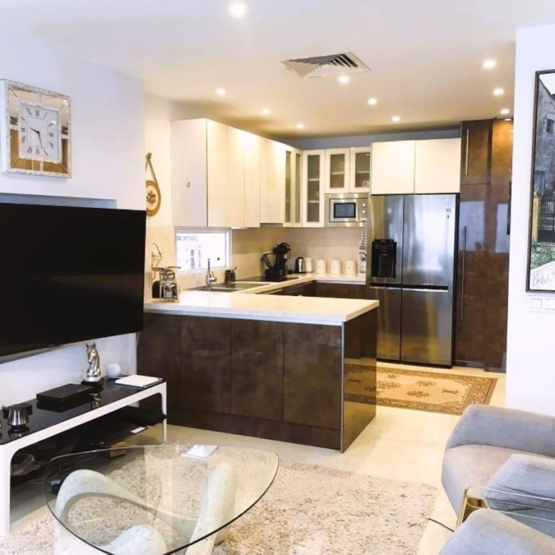 The apartment surface is 93 m2 and a terrace 55 m2. The apartment has a very bright and spacious living room with open kitchen,