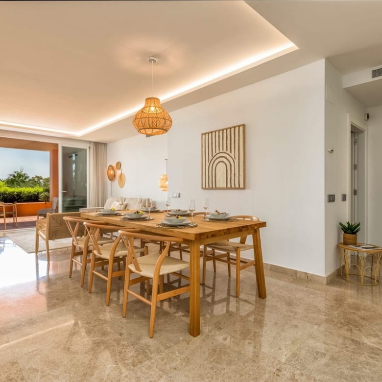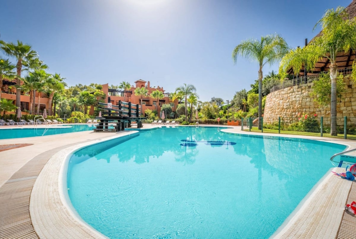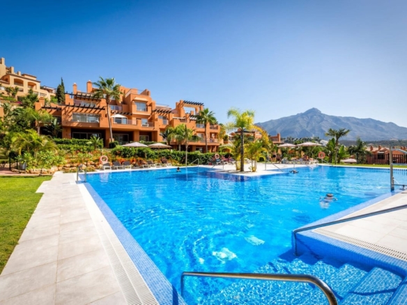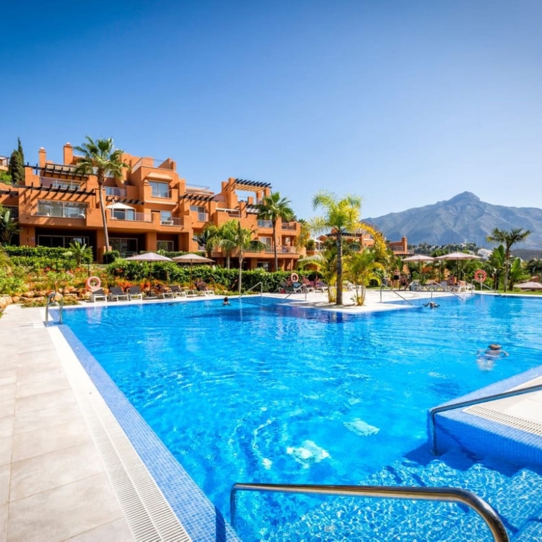 This stunning development in Nueva Andalucia exemplifies seamless integration with its breathtaking natural surroundings. Set within 13,000m2 of lush tropical gardens, the community features a magnificent swimming pool and a serene lake, creating a tranquil oasis.