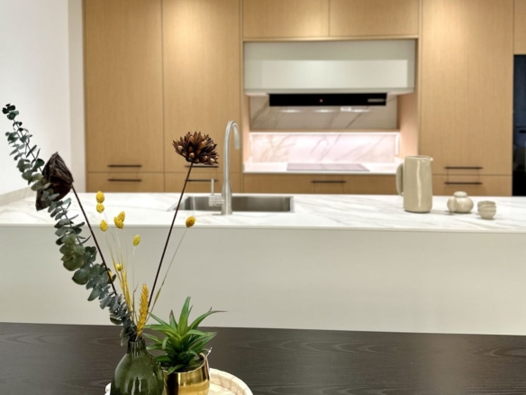 The **fully fitted kitchen** features white cabinetry, polished quartz countertops, and subtle textured backsplash tiles that blend style with functionality. The dining area transitions seamlessly from the kitchen, making it perfect for both intimate dinners and larger gatherings.