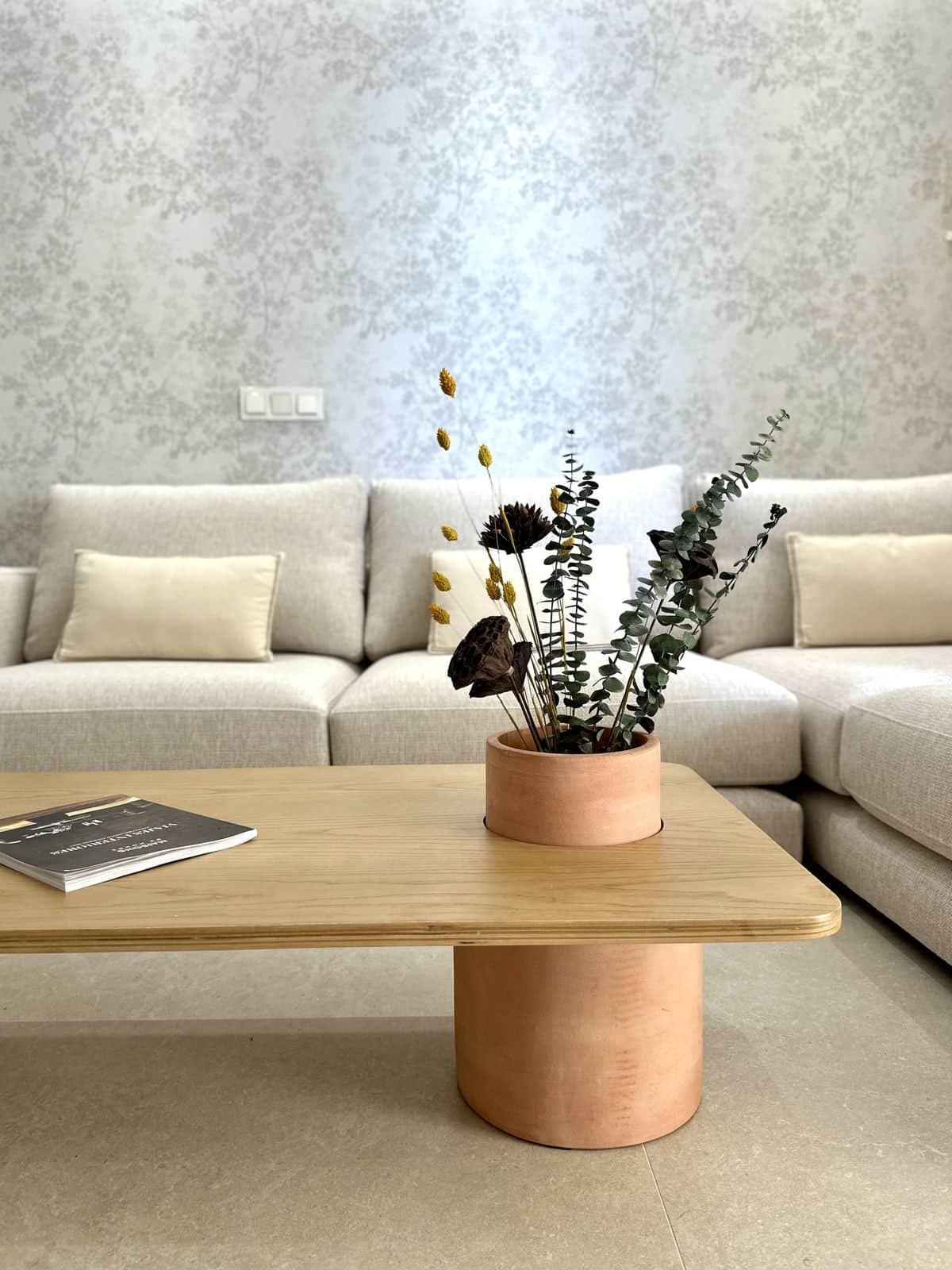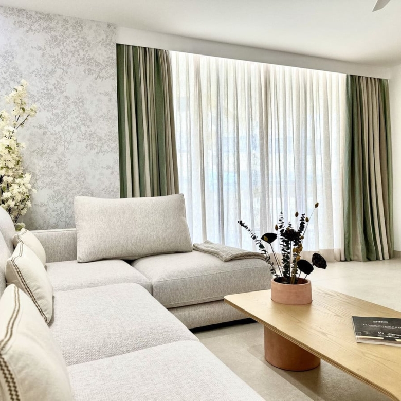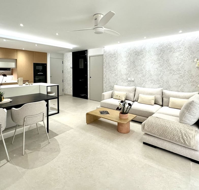 inside, the design reflects a **sophisticated coastal aesthetic** with light neutral tones, natural textures, and luxurious finishes that enhance the airy, sun-filled ambiance. The **living room** is an inviting space with a plush L-shaped sofa in soft beige, complemented by accent pillows in ocean-inspired hues. A sleek glass coffee table and large mirrors amplify natural light, while a statement chandelier adds a touch of elegance.
