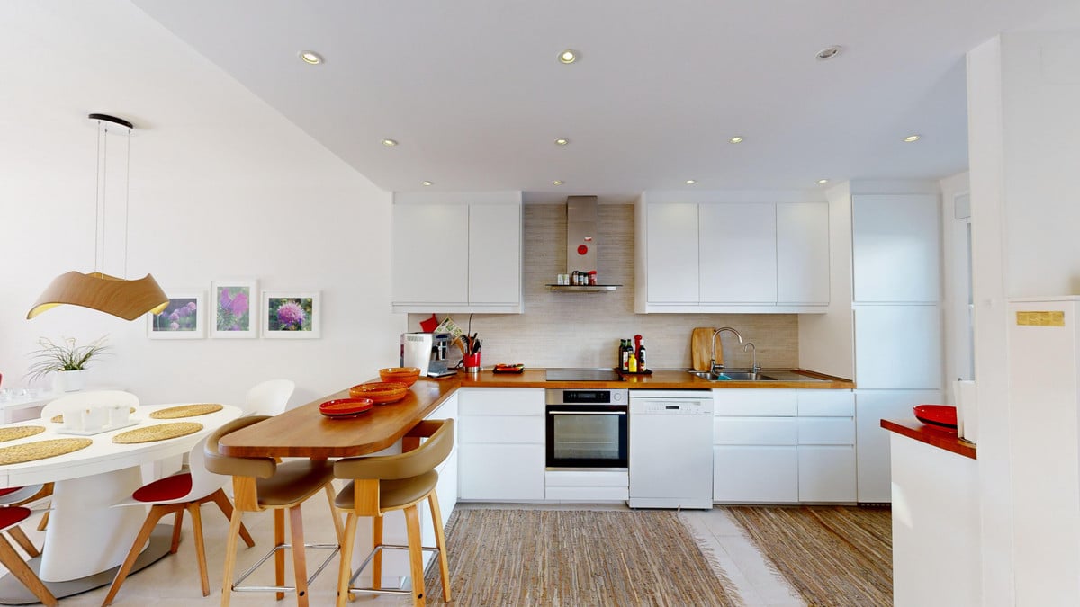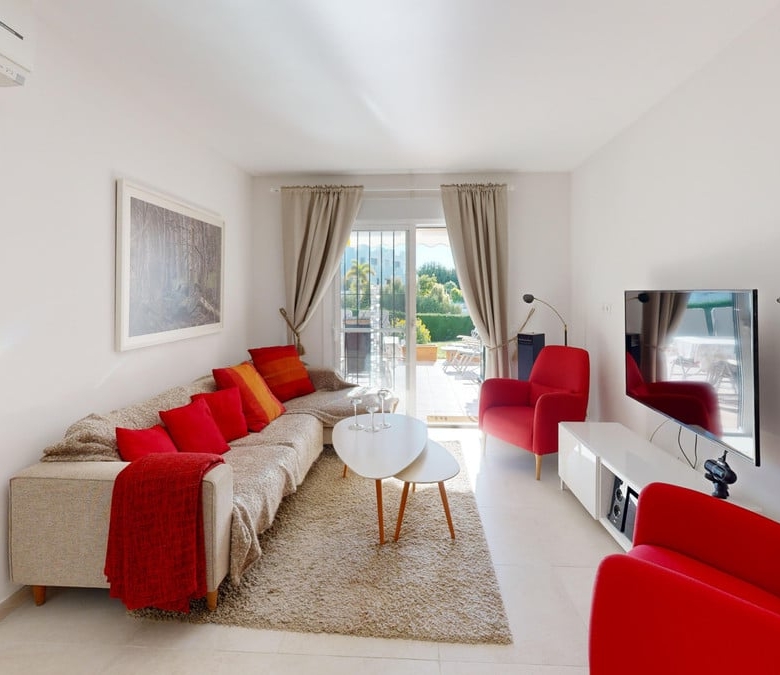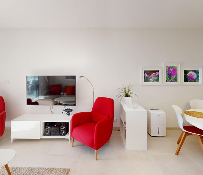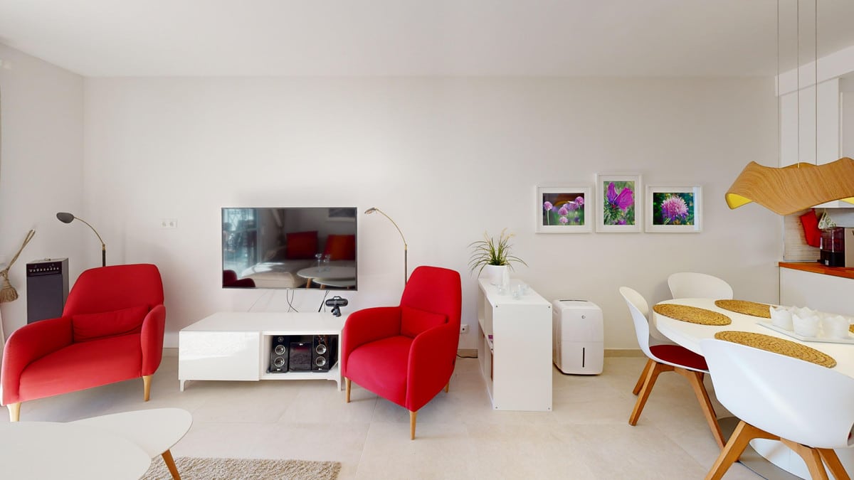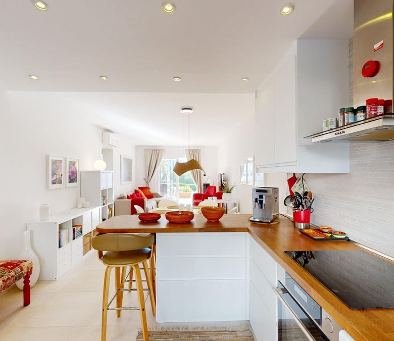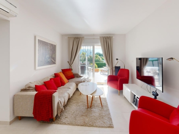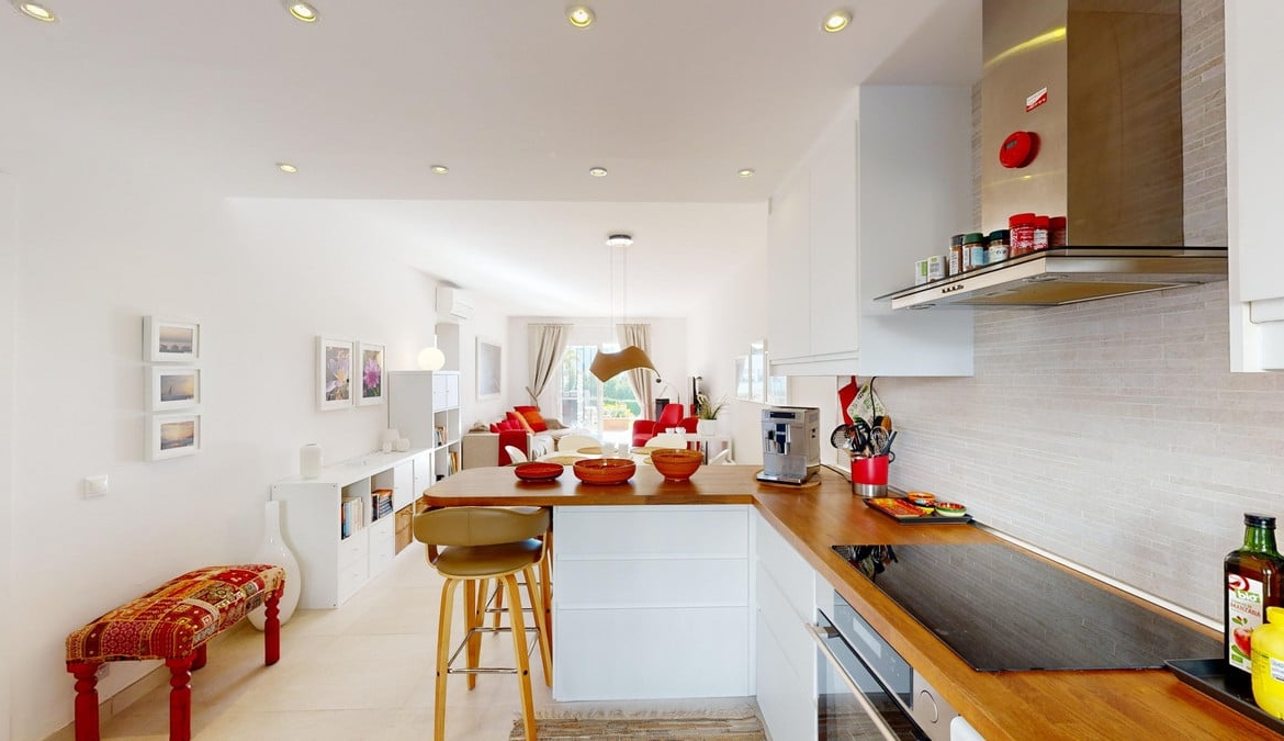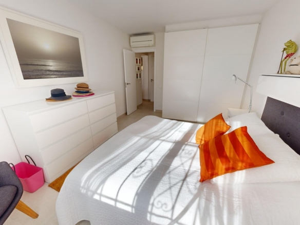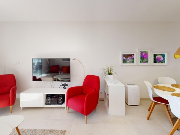 This thoughtfully designed apartment features two spacious bedrooms and two contemporary bathrooms, making it an ideal home for small families, couples, or those seeking a holiday retreat. The open-plan living and dining area seamlessly connects to a private terrace, offering a tranquil spot to enjoy your morning coffee or unwind in the evenings. The kitchen, equipped with modern appliances and sleek finishes, is perfect for both casual meals and entertaining guests.