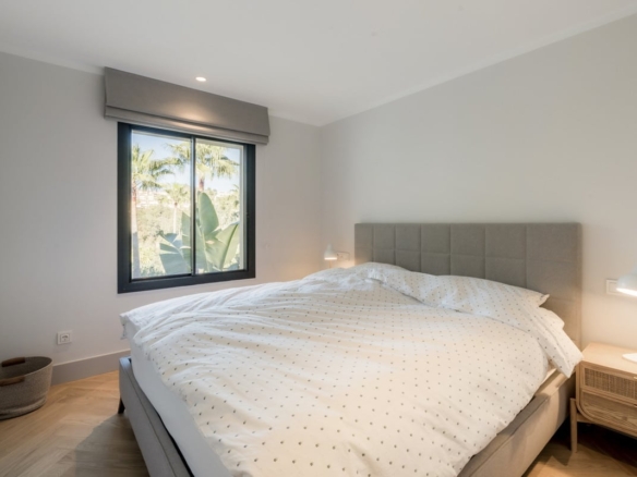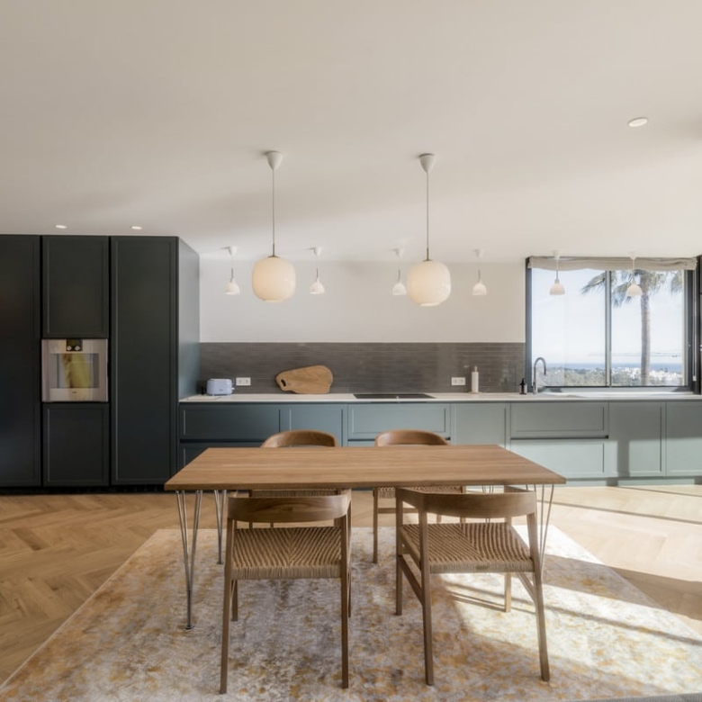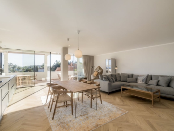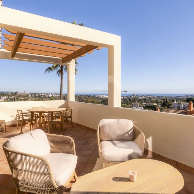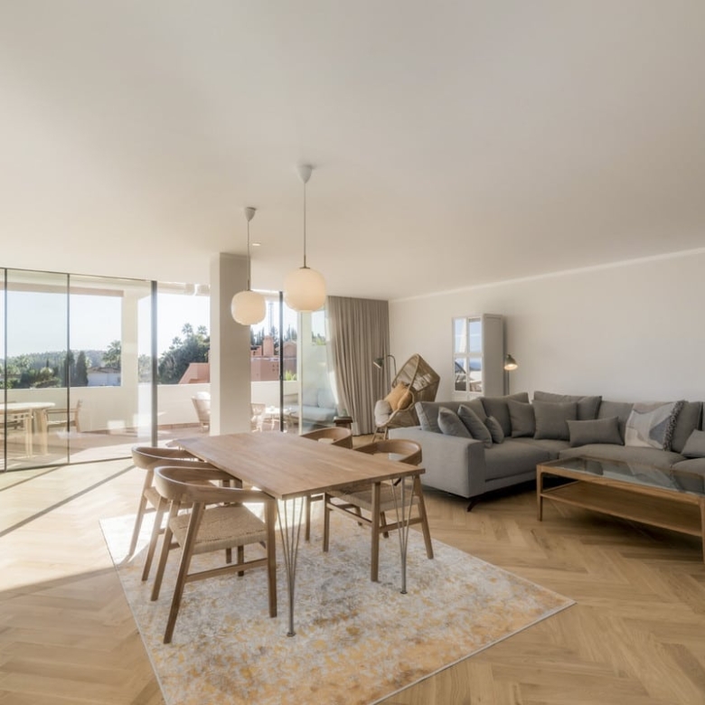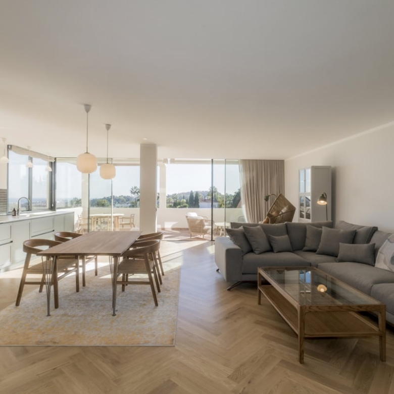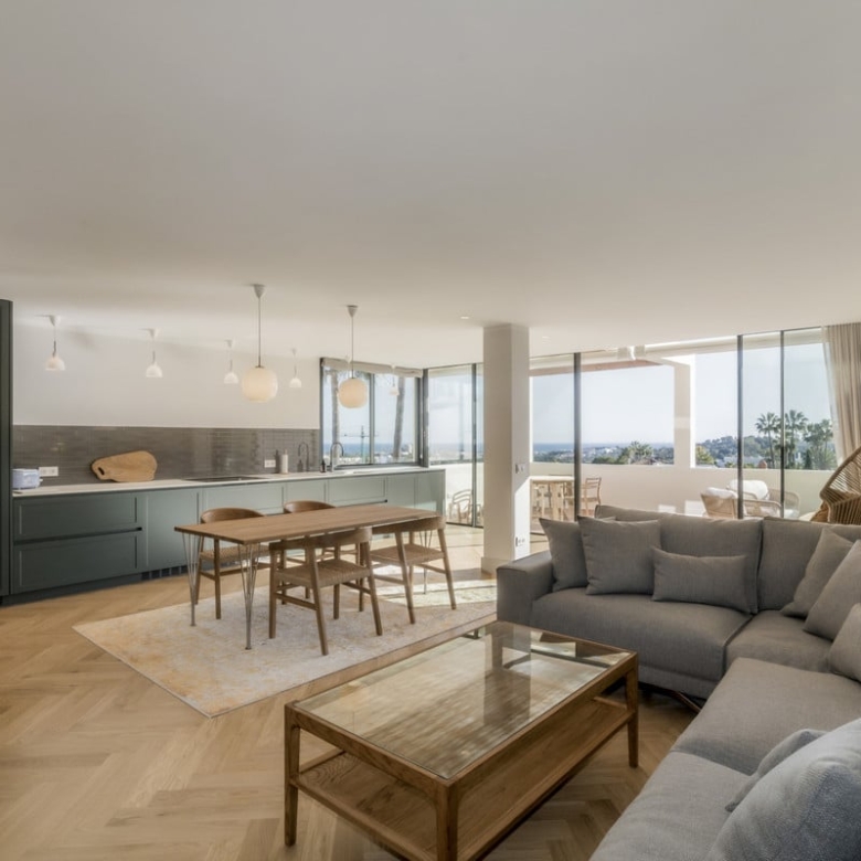 Step into luxury with this newly renovated 2-bedroom, 2-bathroom middle-floor apartment in the heart of Nueva Andalucia. Designed for modern living, it features a state-of-the-art Gaggenau kitchen, elegant herringbone wood flooring, and a spacious southwest-facing terrace offering breathtaking panoramic views.