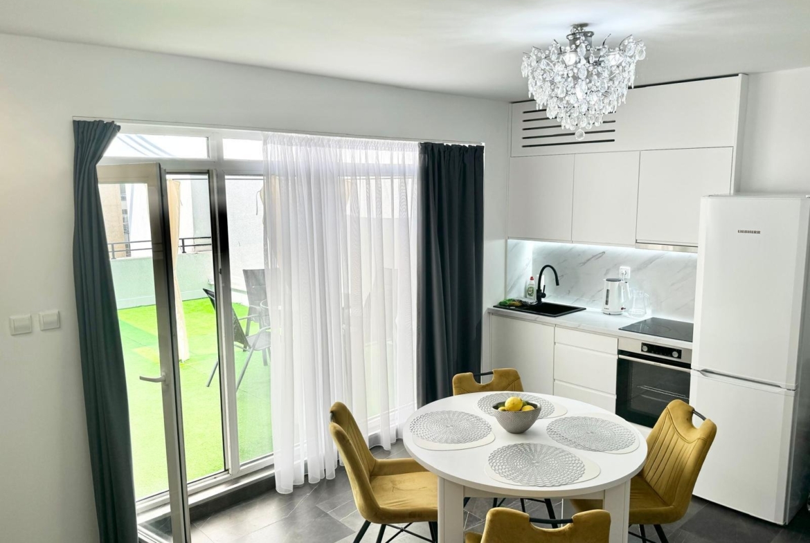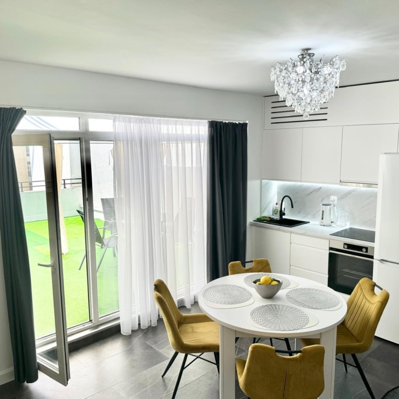A stylish and spacious three-room apartment is for sale in the Grand Kamelia complex at Sunny Beach resort. The apartment is in excellent condition, recently renovated, and furnished. The complex offers many amenities, such as swimming pools, a restaurant, and a gym.