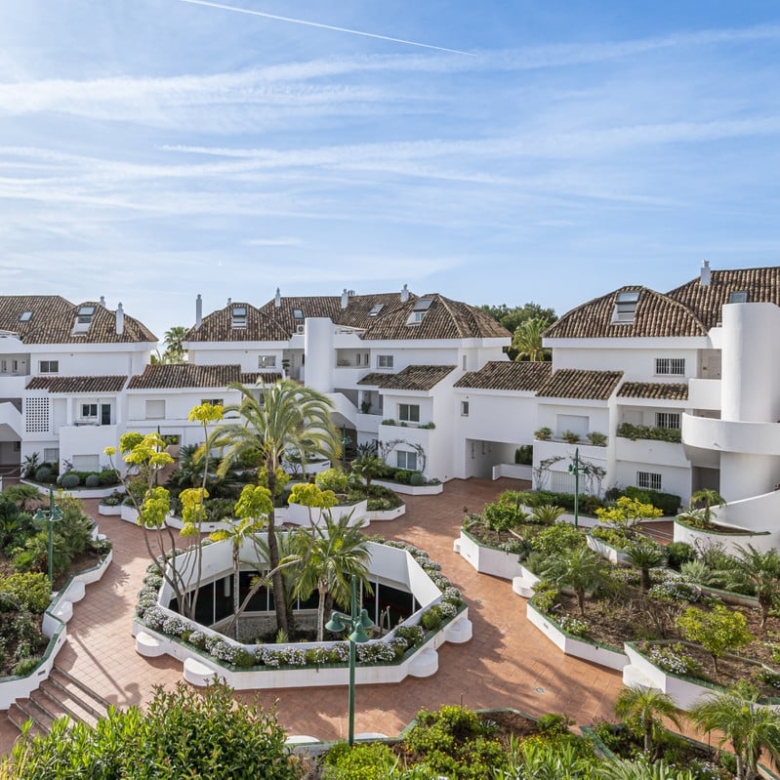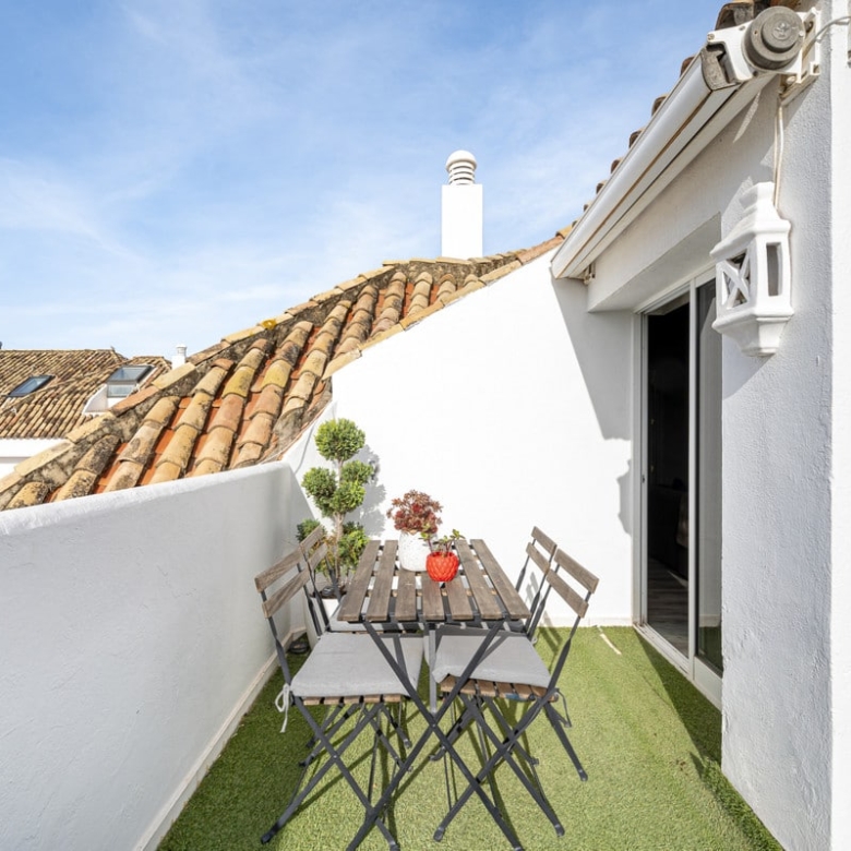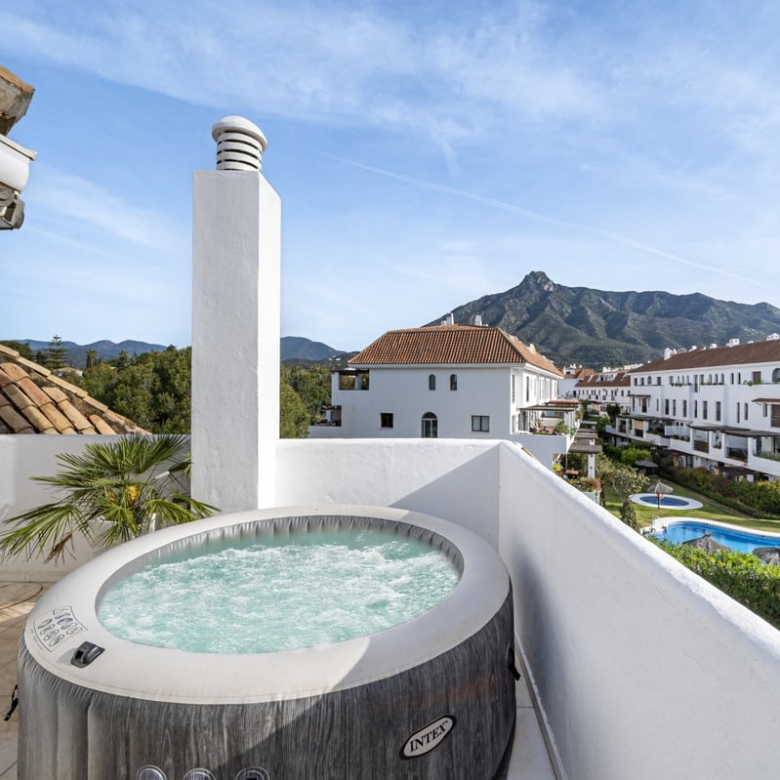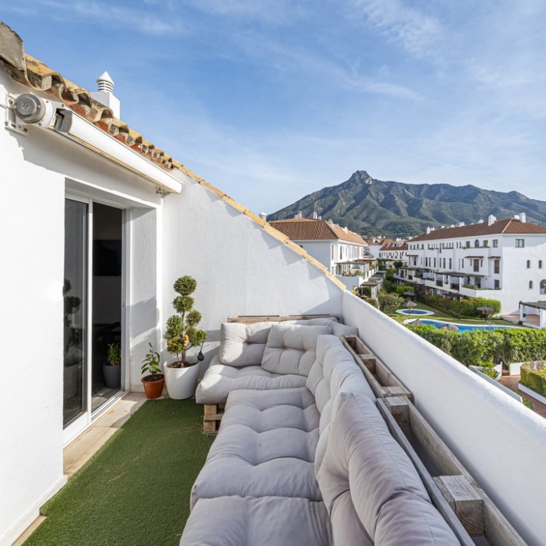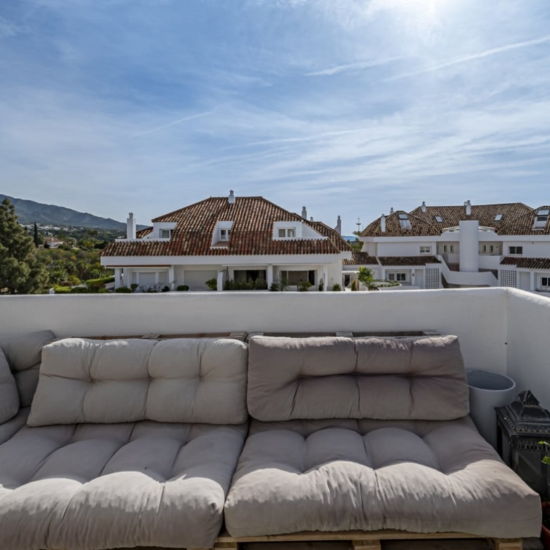 The apartment consists of an entrance hall, from which stairs lead to the first floor which comprises of a comfortable living room with dining area, a fully fitted kitchen, two bedrooms and two en suite bathrooms all refurbished to the highest standards and in very good taste. From the living room and the master bedroom there is access to the south and east facing terrace with beautiful panoramic views to the mountains and garden of the urbanization, ideal for a wonderful and comfortable holiday at 5 minutes from Puente Romano and the best services of Marbella.