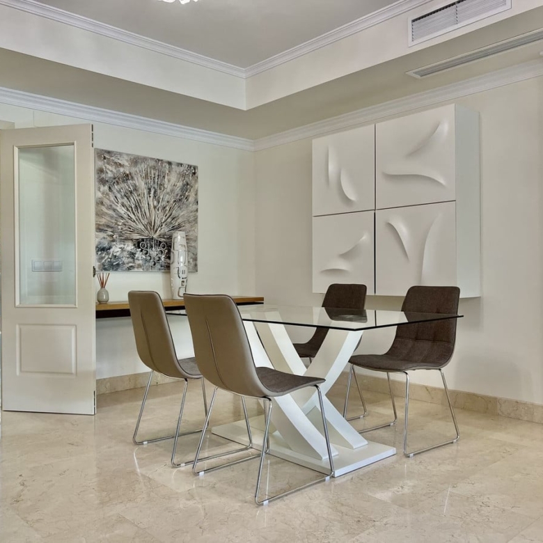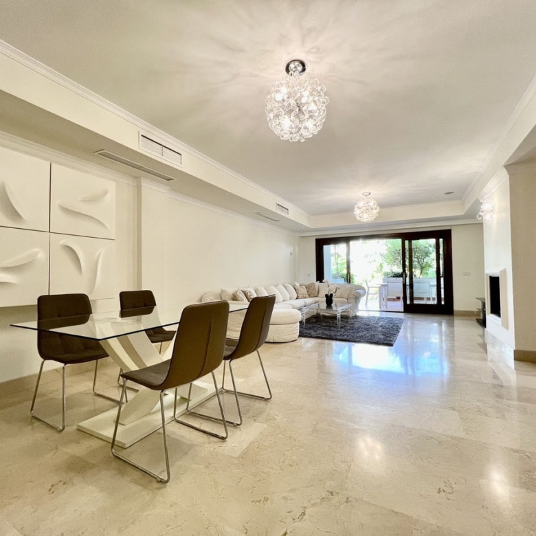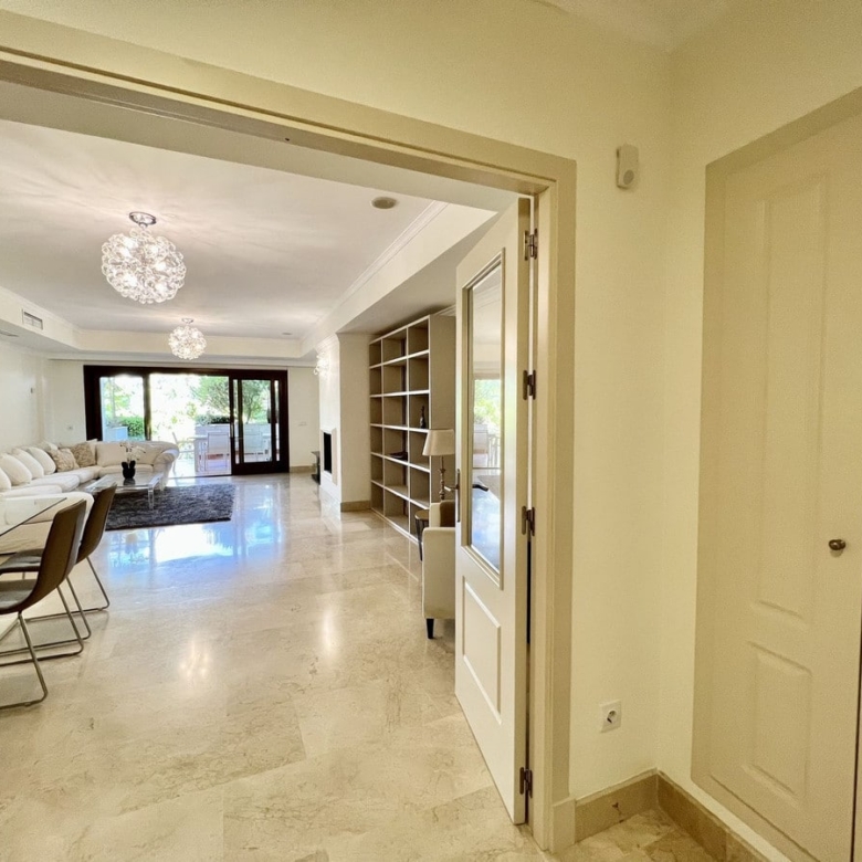 2 bed ground floor apartment in the exclusive, gated community of Lomas del Rey, exceptional high-quality construction melded with extraordinary attention to detail yield this contemporary apartment. its expansive spaces, open concept floorplan and walls of glass create a breathtaking experience of spaciousness and light. On entering the home through the hallway, to the right, there is a large living/dining room and kitchen which open onto the expansive terrace. Straight ahead there is a corridor with guest toilet and guest suite with a walk-in closet. To the left is the sizeable master suite, also with walk-in closet and a private terrace.