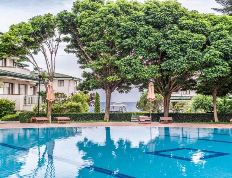 2 level apartment, 67 sq.m., on the first sea line, in Emerald beach resort, Ravda We offer for sale fully furnished apartment in the beach front SPA resort Emerald in Ravda village. The apartment is situated on the ground floor and has a total living area – 66.74 sq.m. It is a 2-level apartment and comprises of: kitchen with living-room, bathroom and a terrace on the first level and a bedroom on the second level. The apartment is fully furnished, boasts of its high ceilings and direct access to the gardens and pools in the complex. Emerald Beach Resort is an elite complex on the beachfront by the sea in the resort village of Ravda. The complex spreads over 60 hectares and consists of 5 clocks with 780 units in total. It impresses with its territory and amenities for holidaymakers and owners. This is a quiet place for your family holidays, is also possible to live all year round. The complex has excellent rental potential all-yearr-ound. On-site amenities: · 5 pools, one of them is indoor pool of 200 square meters with built-in Jacuzzi · Spa center with sauna, Turkish bath, aroma therapy, fitness center · 2 tennis courts · childrens playground · animation for kids · beach volleyball court · free parking · security · restaurants · lobby bar · reception Maintenance fee – 60 EUR/sq.m.